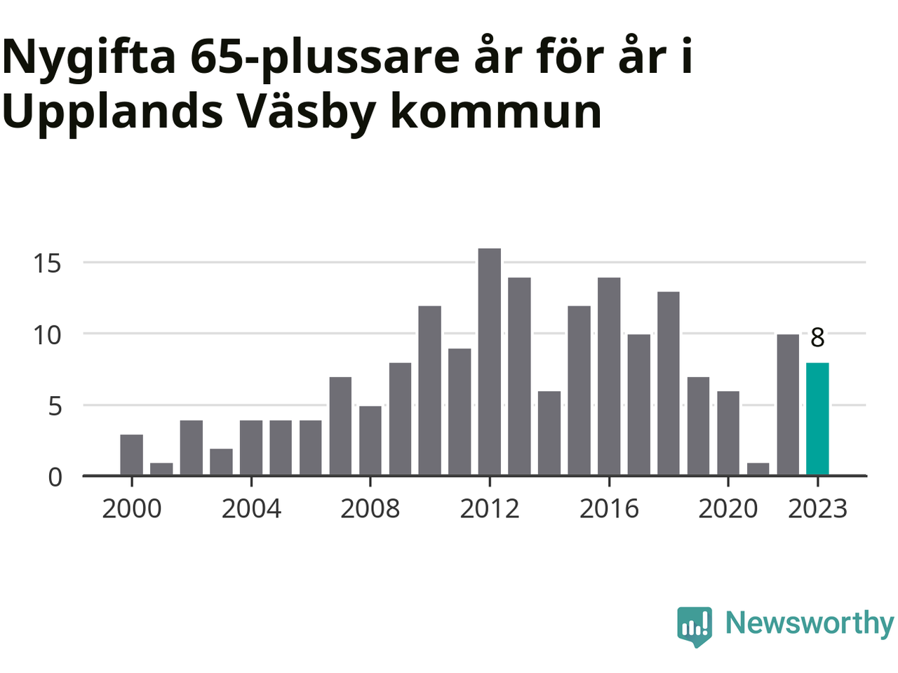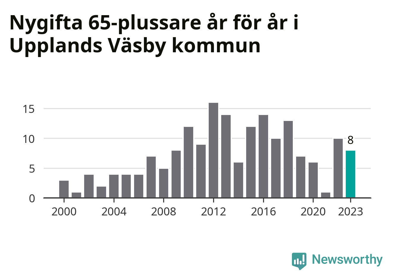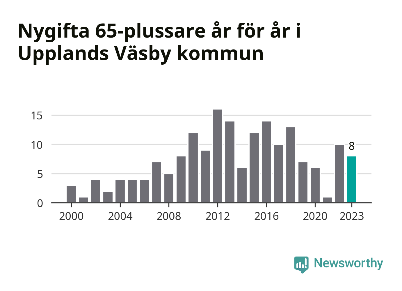 42 personer. Så många Väsbybor gifte sig efter 65-årsdagen under hela 00-talet. Under det senaste decenniet, mellan 2014 och 2023, har samma siffra ökat till 87. Lite mer än en fördubbling, med andra ord.