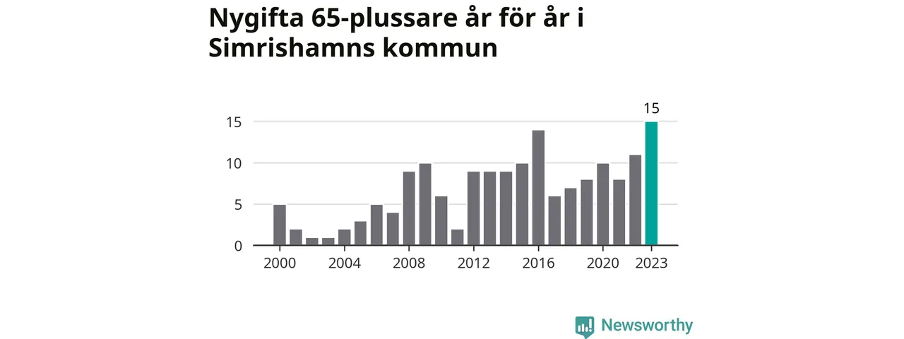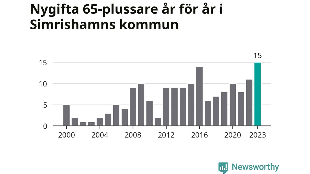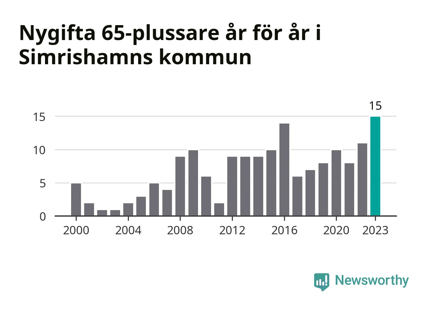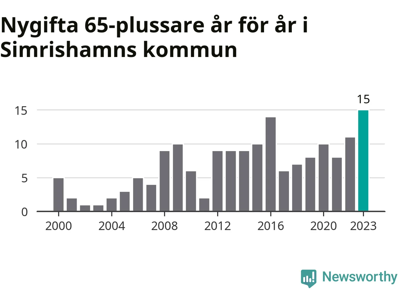 42 personer. Så många Simrishamnsbor gifte sig efter 65-årsdagen under hela 00-talet. Under det senaste decenniet, mellan 2014 och 2023, har samma siffra ökat till 98. Lite mer än en fördubbling, med andra ord. I fjol gifte sig 15 personer över 65 år i Simrishamn, vilket är fler än något enskilt år sedan år 2000.