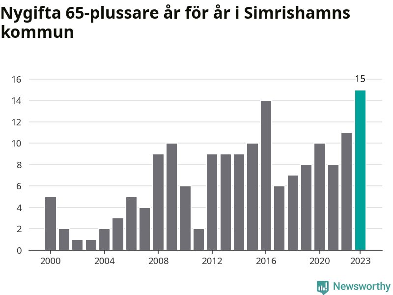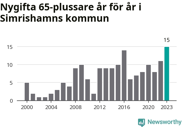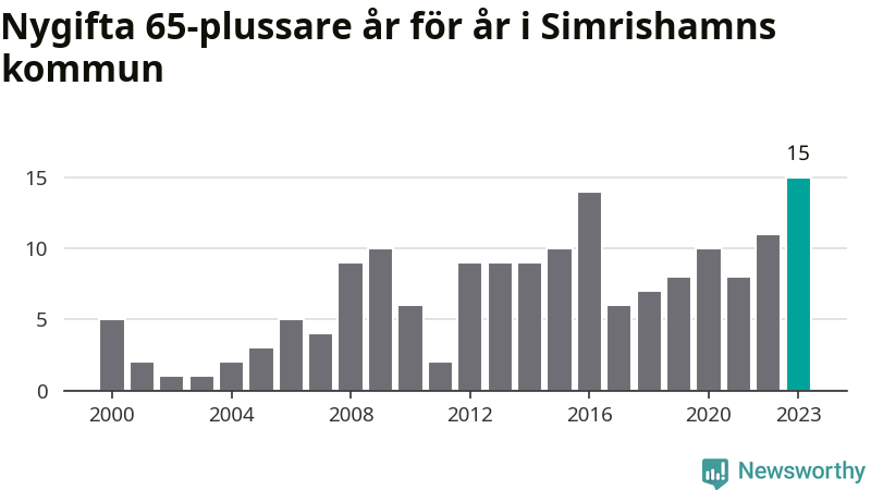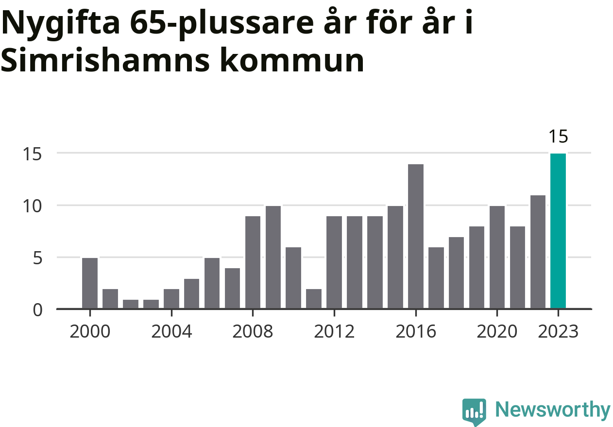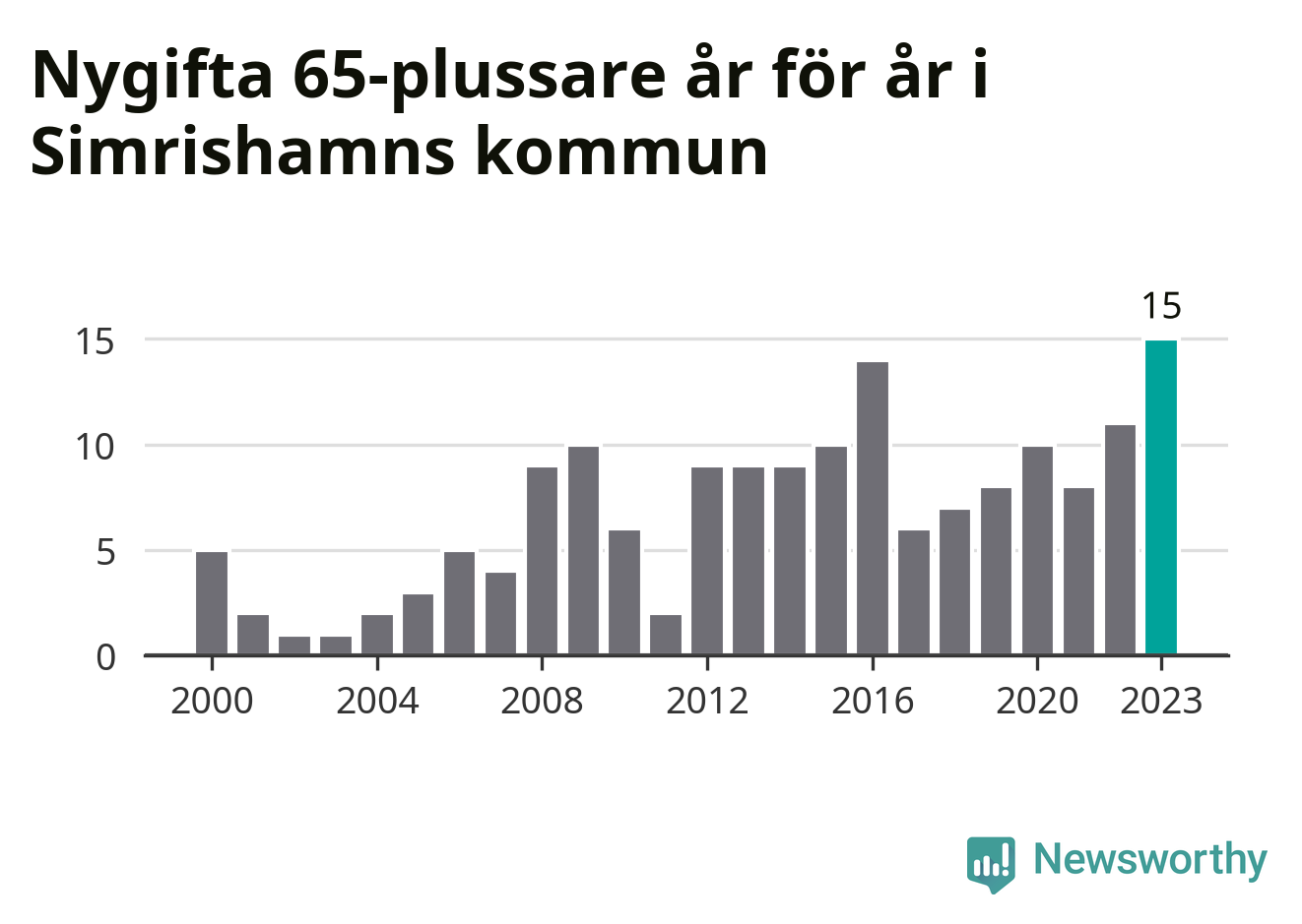 42 personer. Så många Simrishamnsbor gifte sig efter 65-årsdagen under hela 00-talet. Under det senaste decenniet, mellan 2014 och 2023, har samma siffra ökat till 98. Lite mer än en fördubbling, med andra ord. I fjol gifte sig 15 personer över 65 år i Simrishamn, vilket är fler än något enskilt år sedan år 2000.