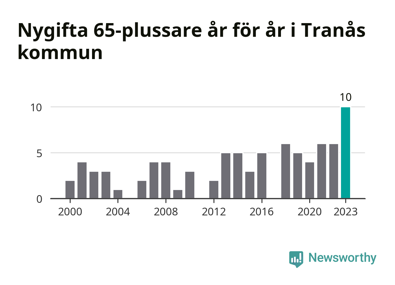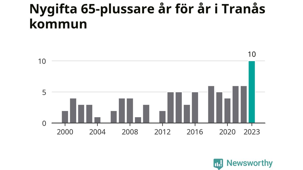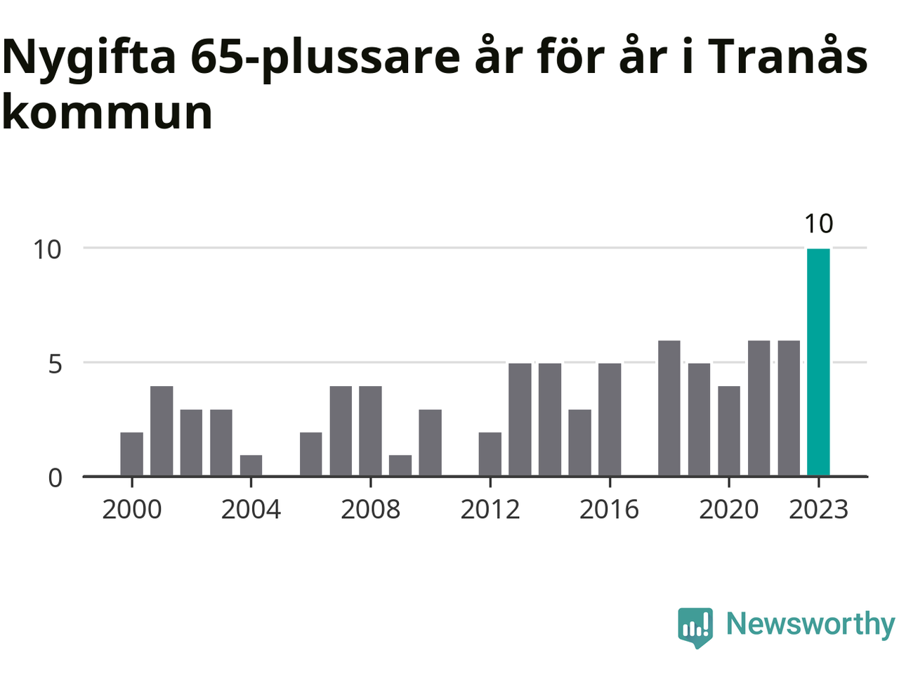 24 personer. Så många Tranåsbor gifte sig efter 65-årsdagen under hela 00-talet. Under det senaste decenniet, mellan 2014 och 2023, har samma siffra ökat till 50. Lite mer än en fördubbling, med andra ord. I fjol gifte sig tio personer över 65 år i Tranås, vilket är fler än något enskilt år sedan år 2000.