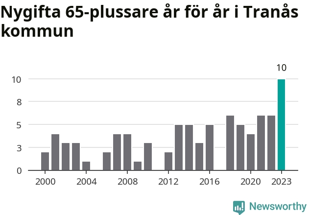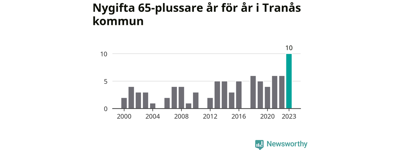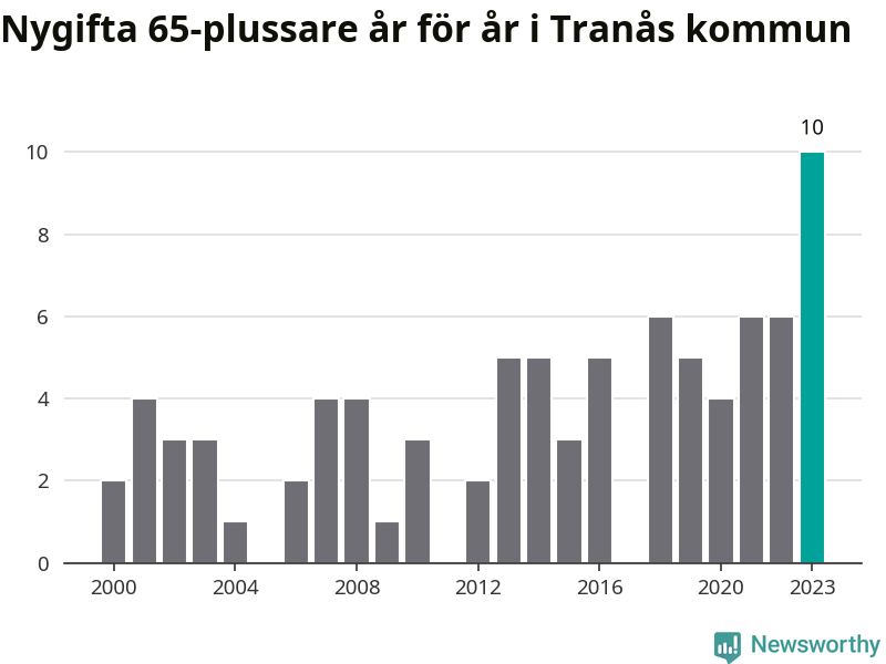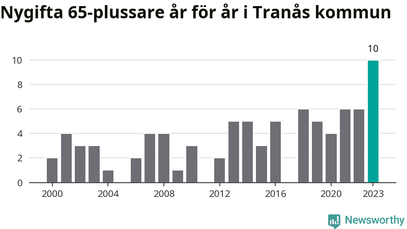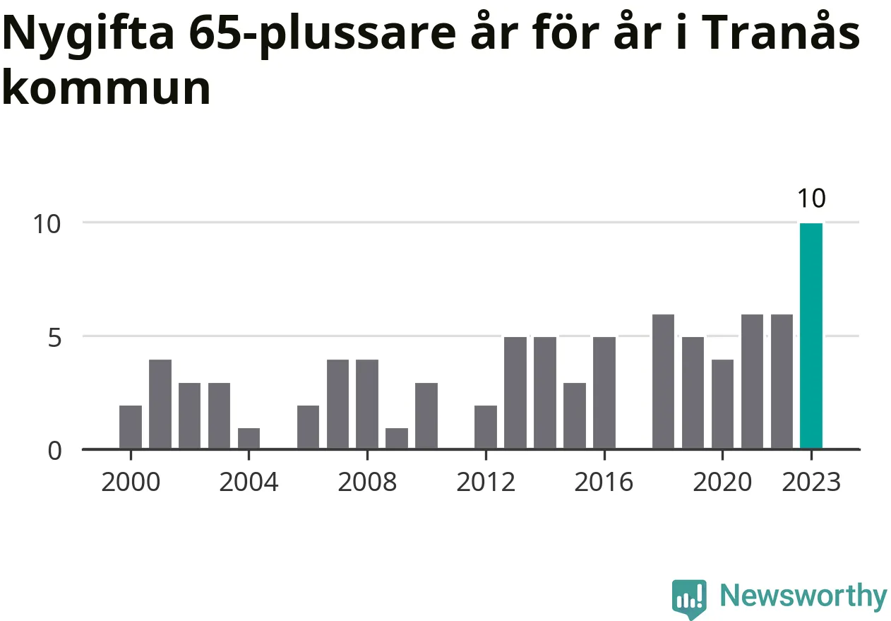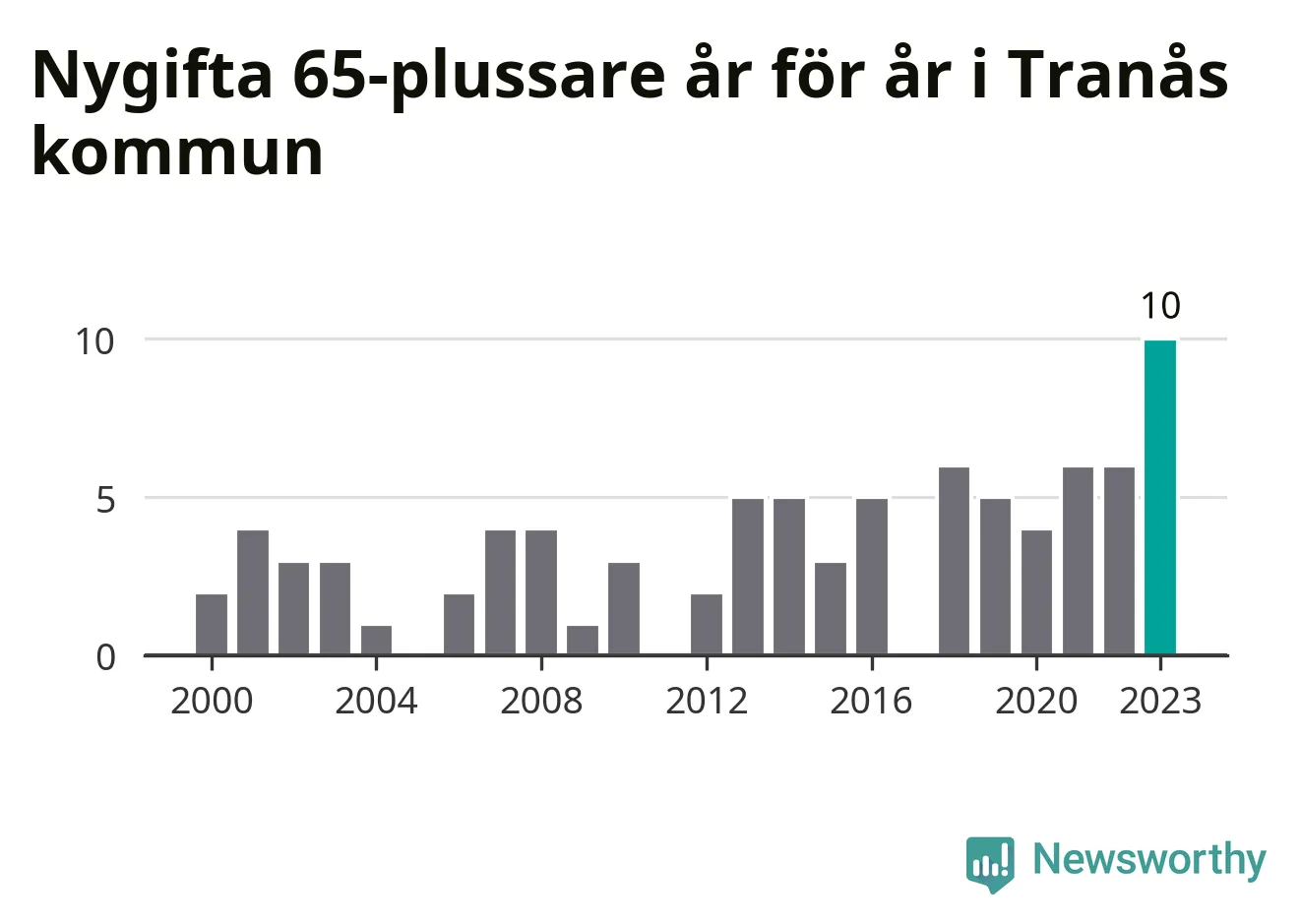 24 personer. Så många Tranåsbor gifte sig efter 65-årsdagen under hela 00-talet. Under det senaste decenniet, mellan 2014 och 2023, har samma siffra ökat till 50. Lite mer än en fördubbling, med andra ord. I fjol gifte sig tio personer över 65 år i Tranås, vilket är fler än något enskilt år sedan år 2000.