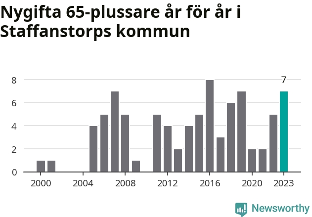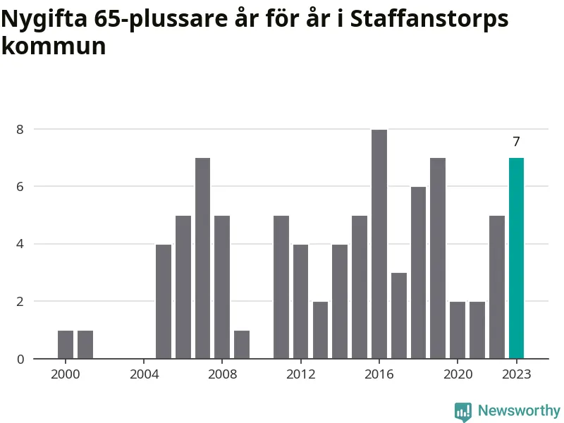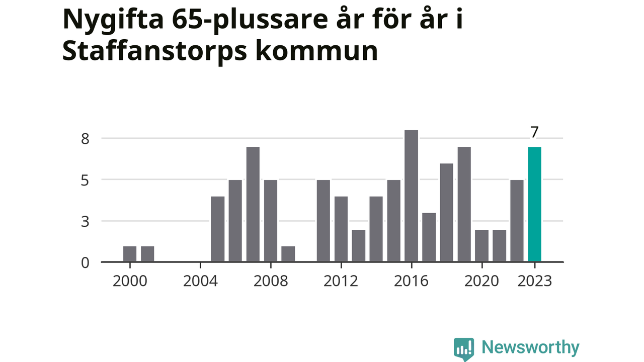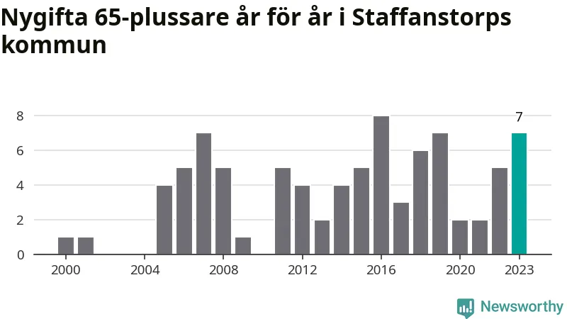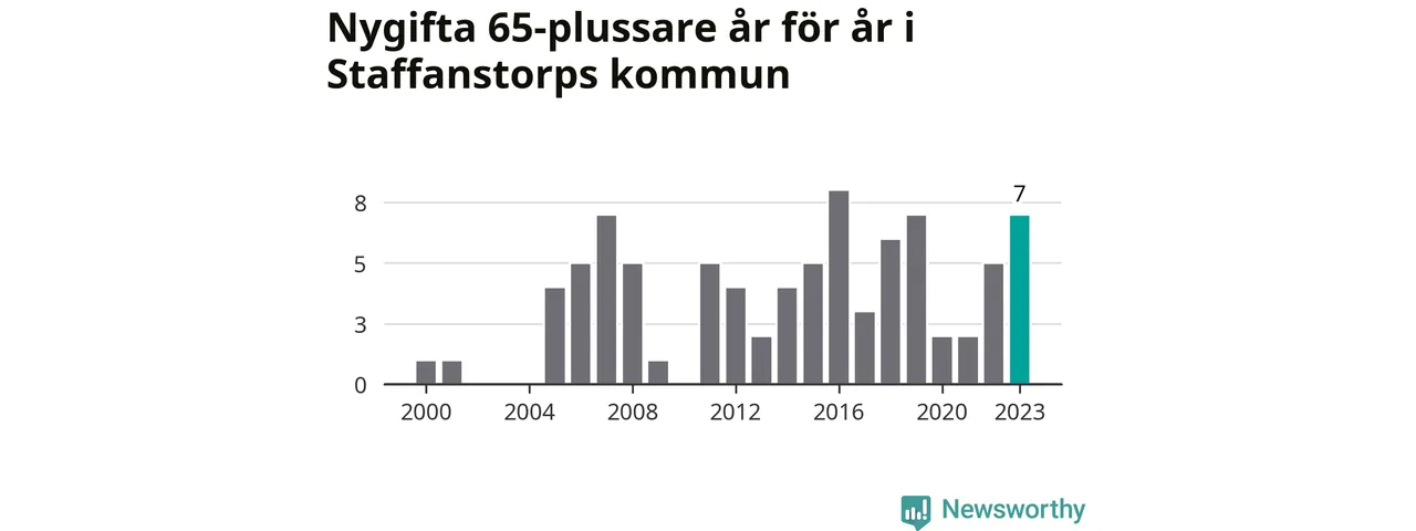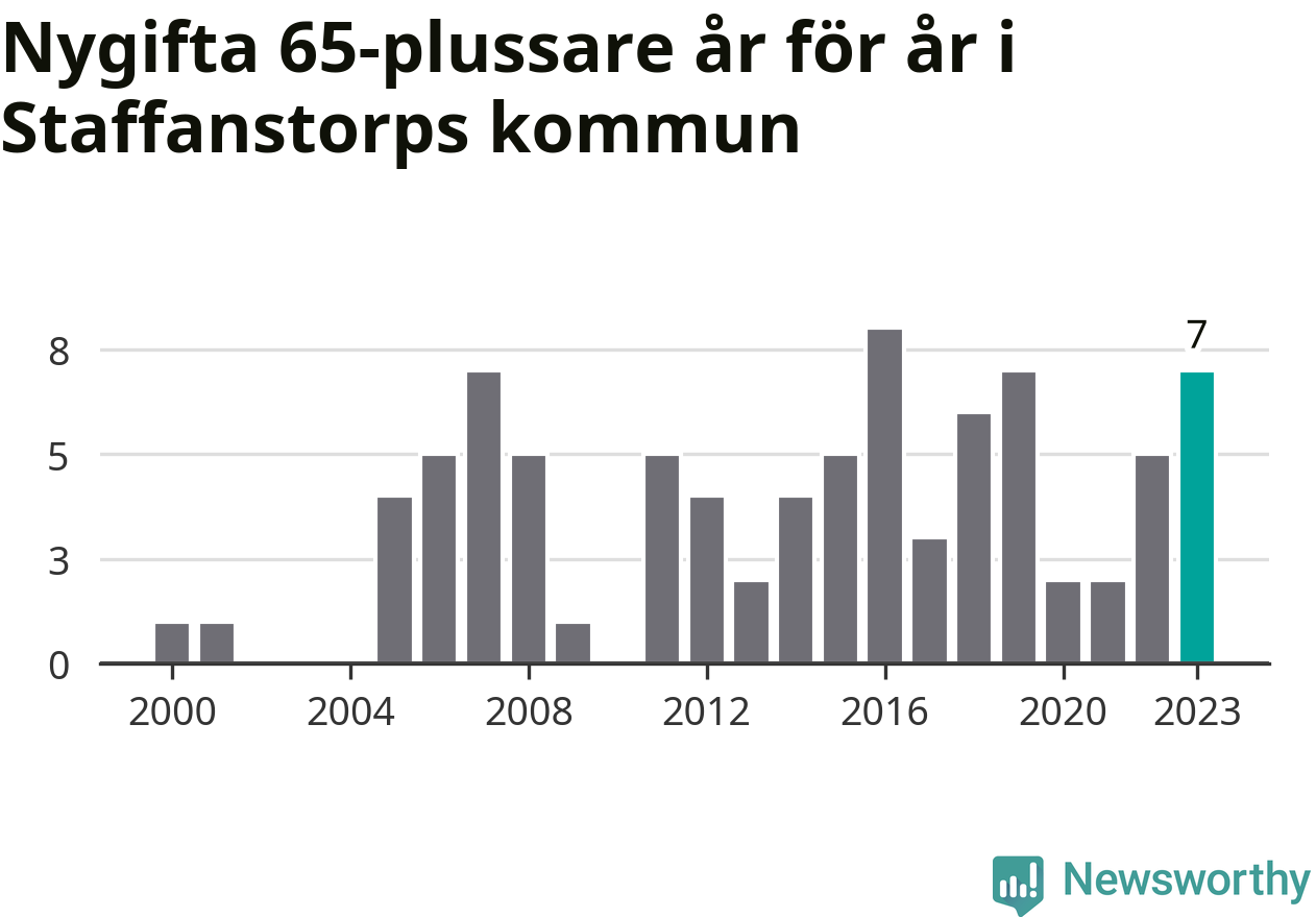 24 personer. Så många Staffanstorpsbor gifte sig efter 65-årsdagen under hela 00-talet. Under det senaste decenniet, mellan 2014 och 2023, har samma siffra ökat till 49. Lite mer än en fördubbling, med andra ord.