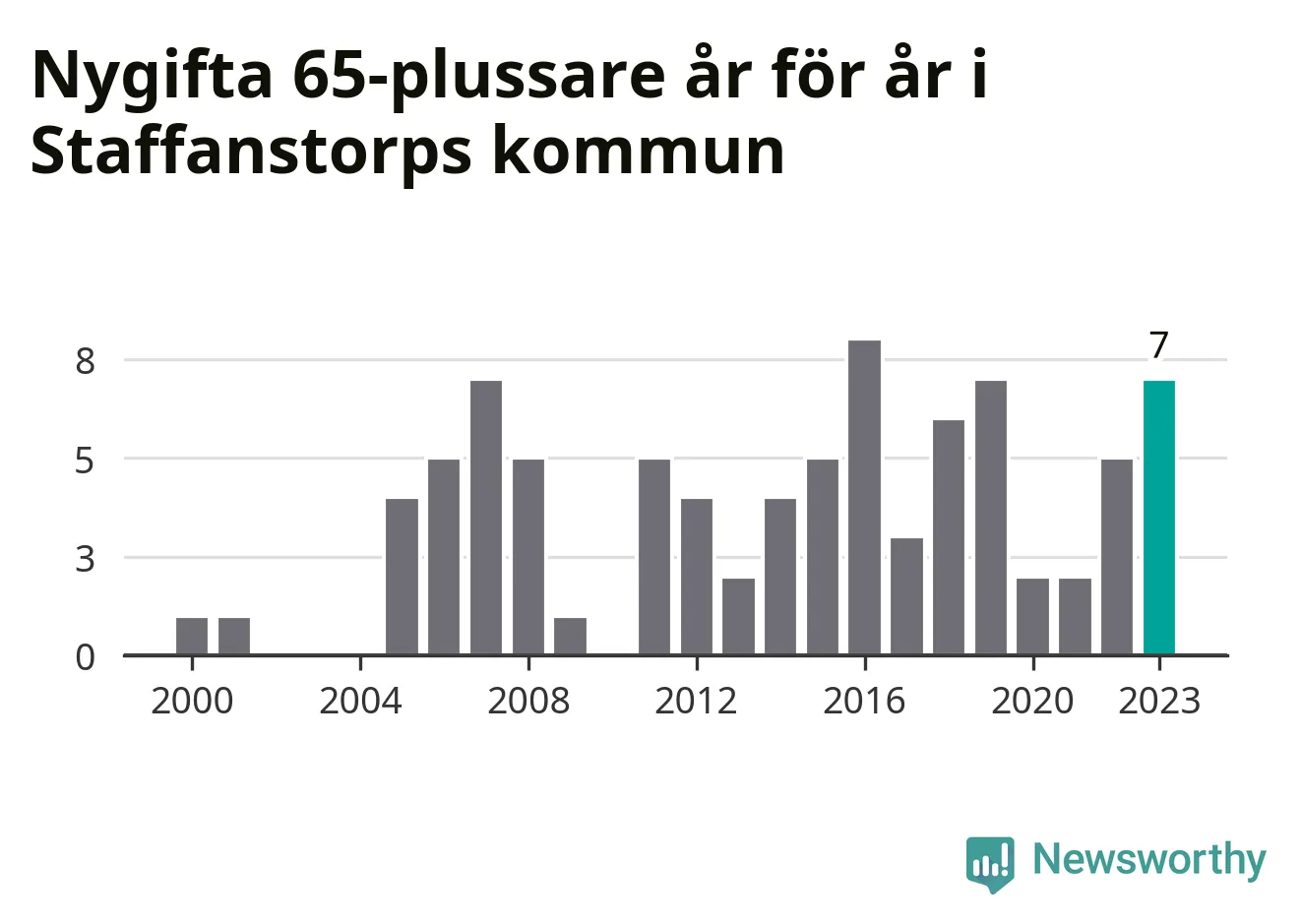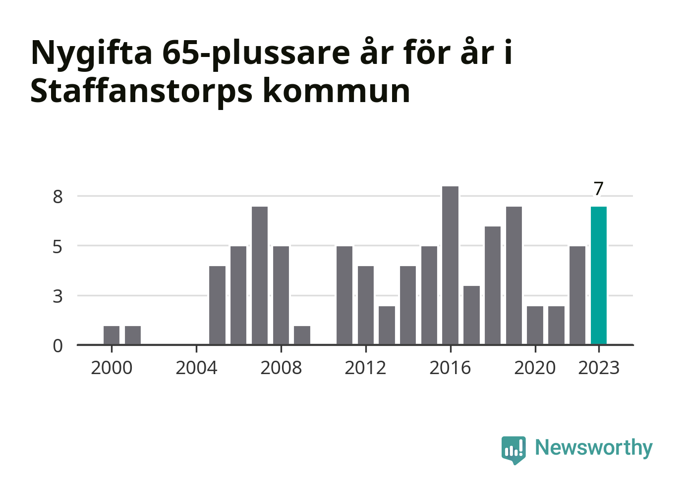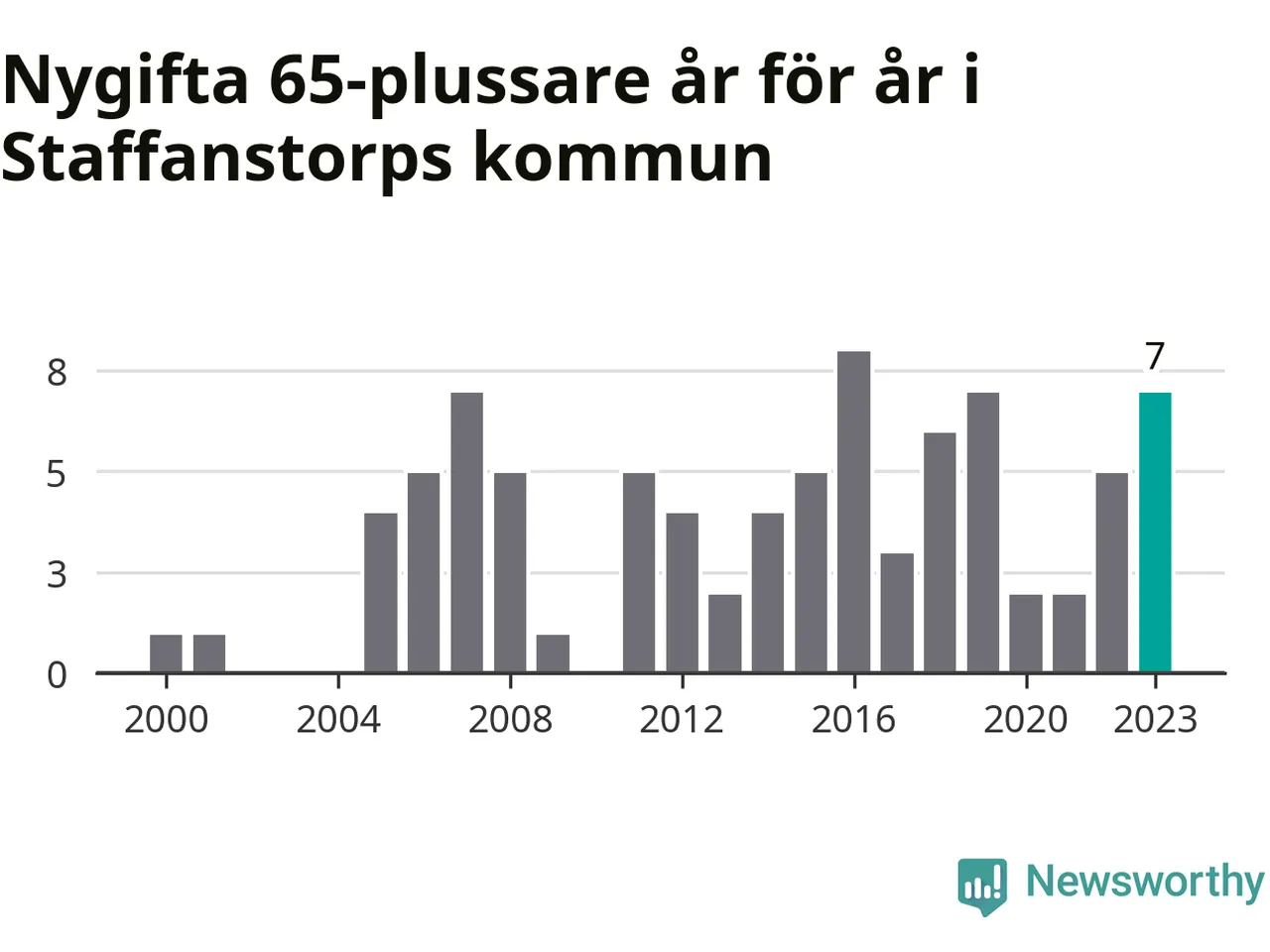24 personer. Så många Staffanstorpsbor gifte sig efter 65-årsdagen under hela 00-talet. Under det senaste decenniet, mellan 2014 och 2023, har samma siffra ökat till 49. Lite mer än en fördubbling, med andra ord.