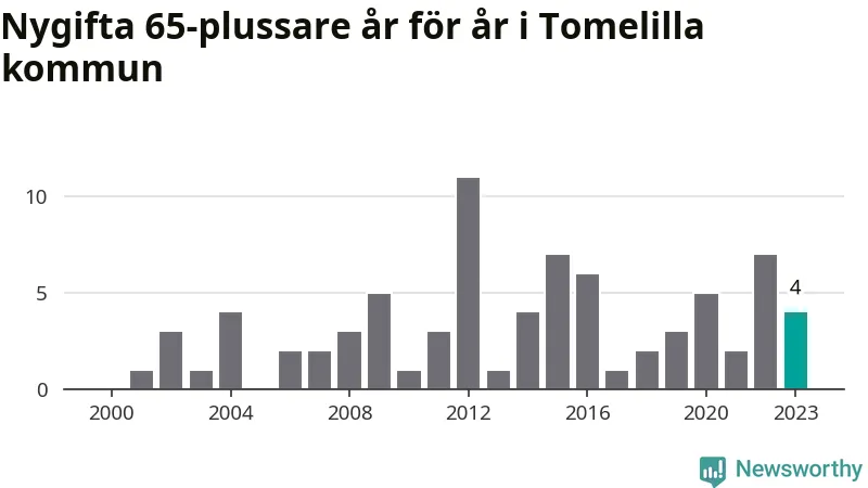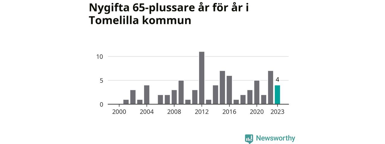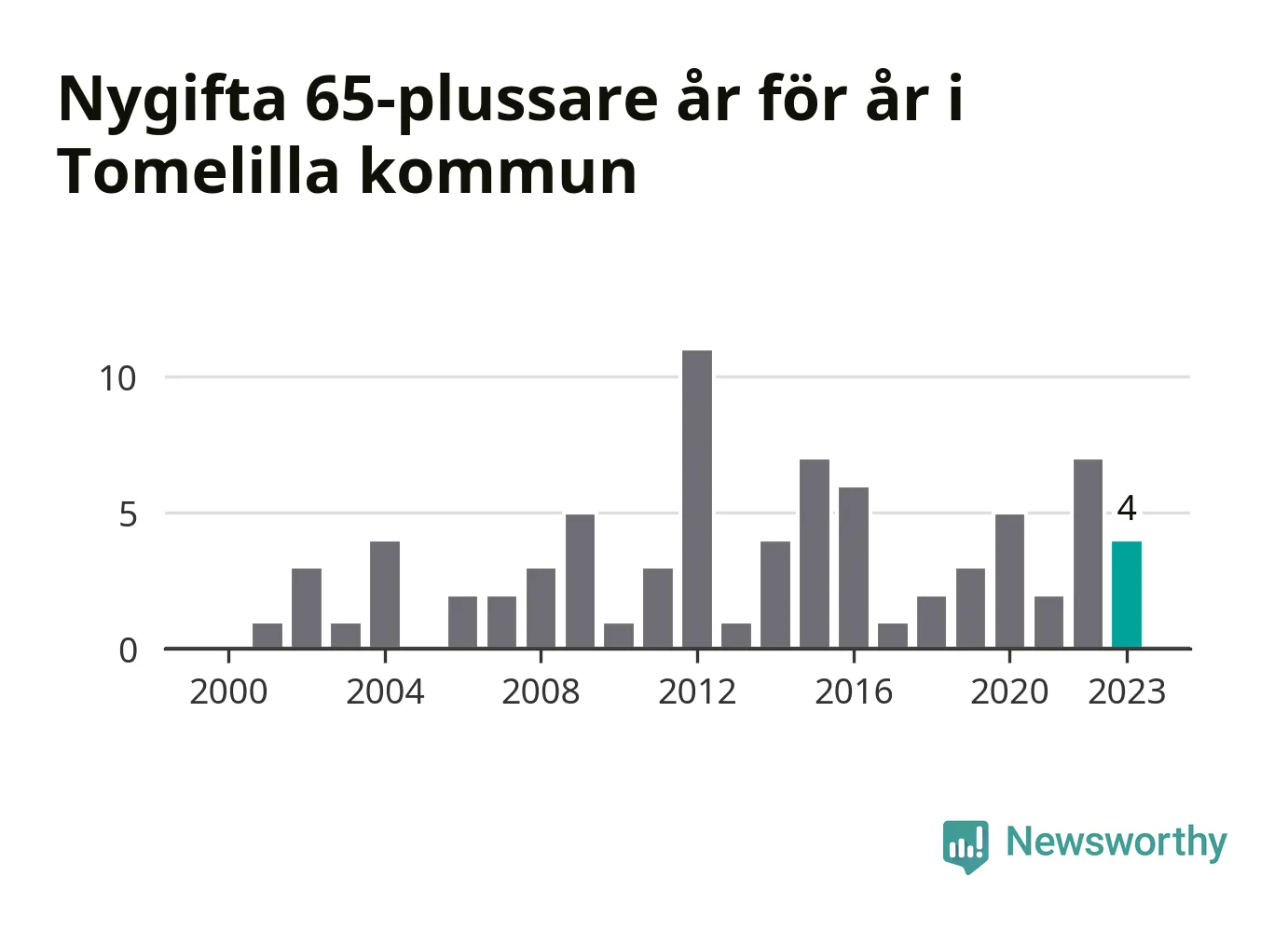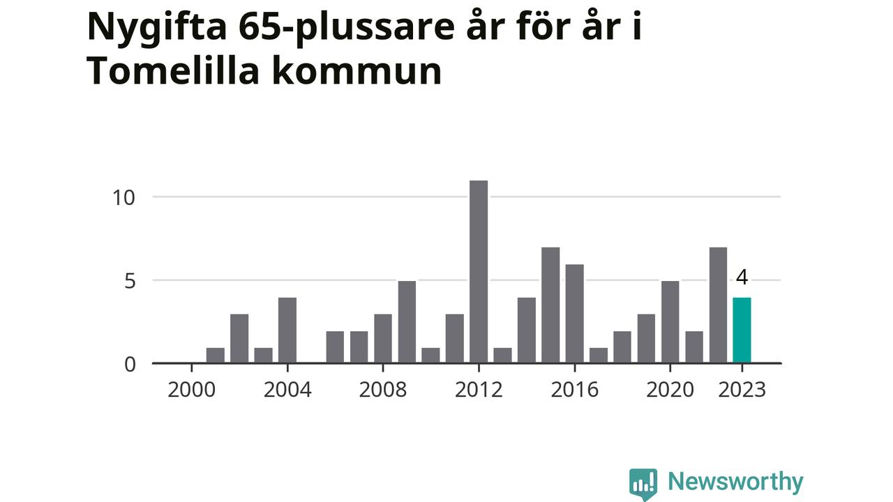 Bröllop bland 65-plussare har ökat markant i Sverige de senaste 25 åren. I Tomelilla har antalet nygifta seniorer ökat från 21 under 00-talet till 41 senaste decenniet.