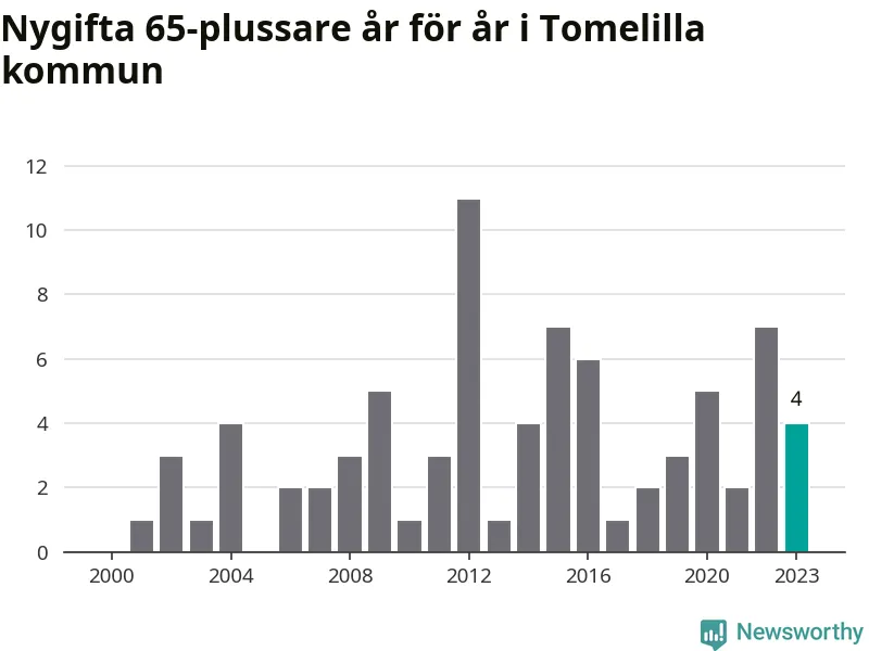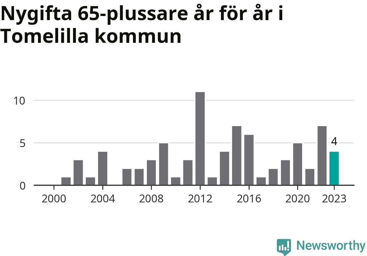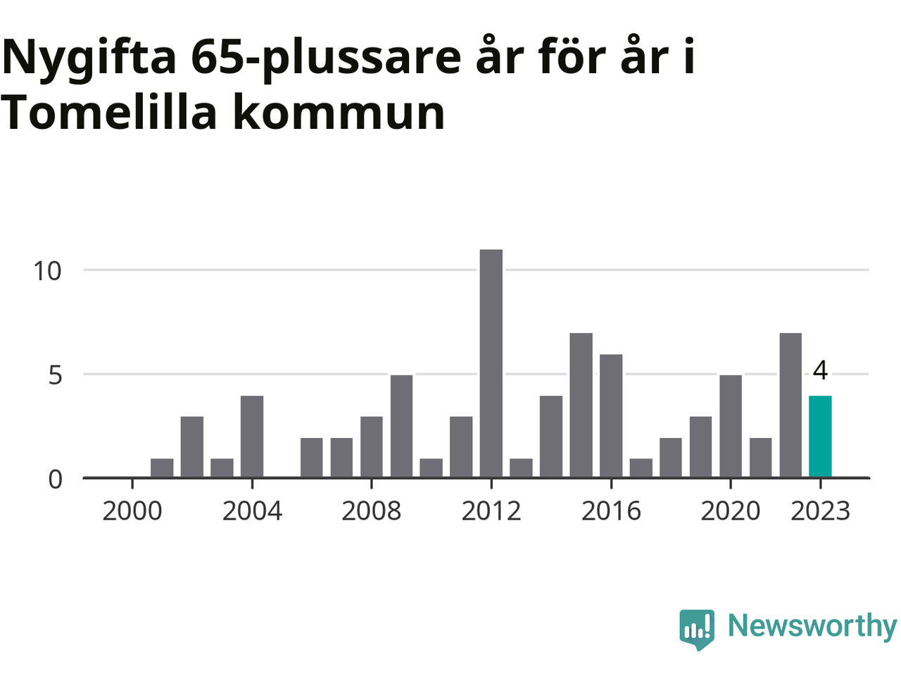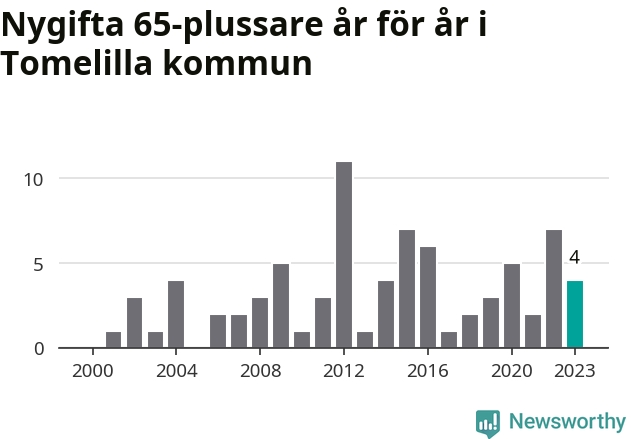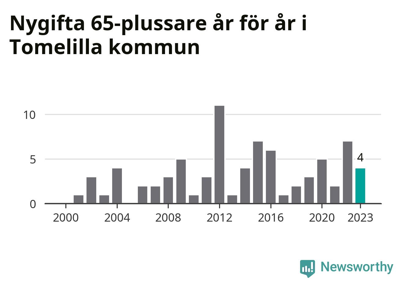 Bröllop bland 65-plussare har ökat markant i Sverige de senaste 25 åren. I Tomelilla har antalet nygifta seniorer ökat från 21 under 00-talet till 41 senaste decenniet.