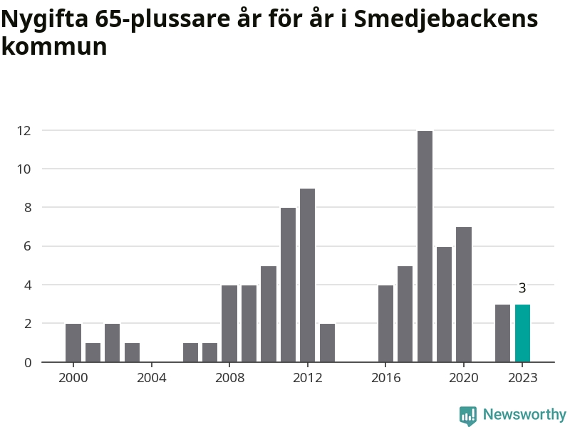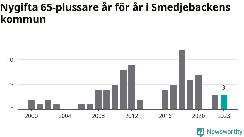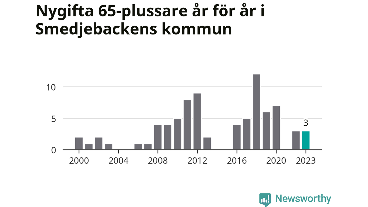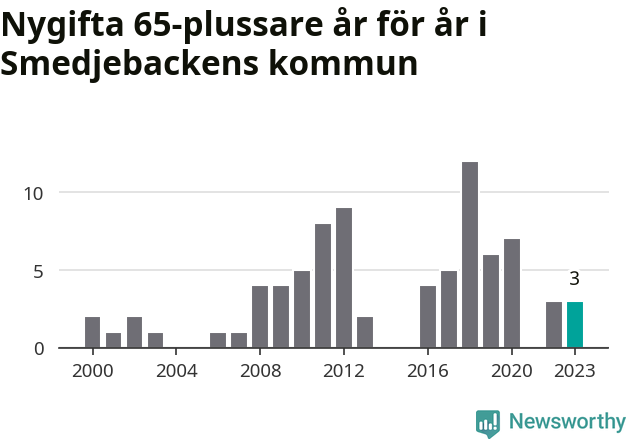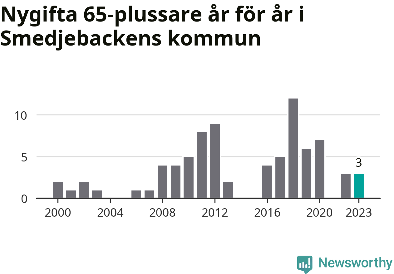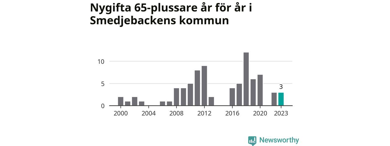 16 personer. Så många Smedjebackensbor gifte sig efter 65-årsdagen under hela 00-talet. Under det senaste decenniet, mellan 2014 och 2023, har samma siffra ökat till 40. Mer än en fördubbling, med andra ord.
