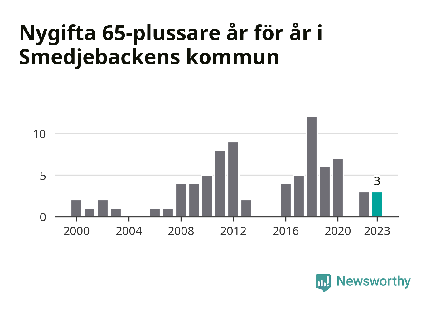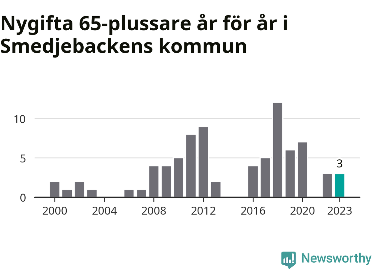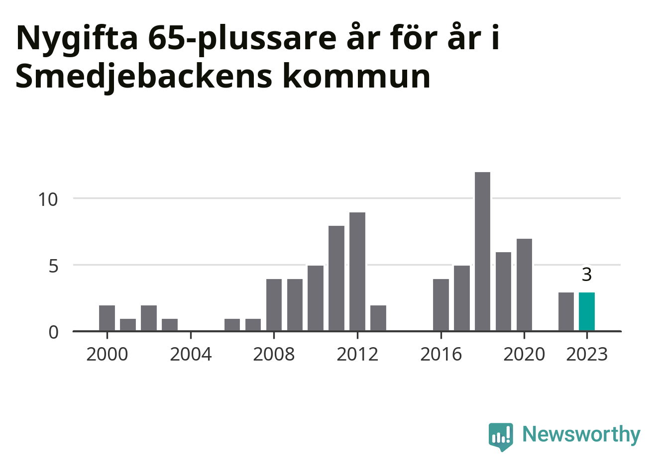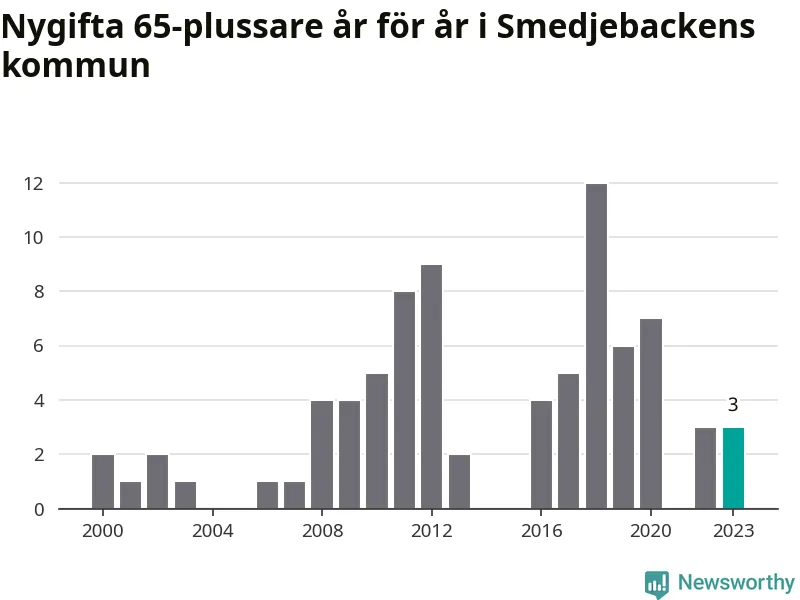 16 personer. Så många Smedjebackensbor gifte sig efter 65-årsdagen under hela 00-talet. Under det senaste decenniet, mellan 2014 och 2023, har samma siffra ökat till 40. Mer än en fördubbling, med andra ord.
