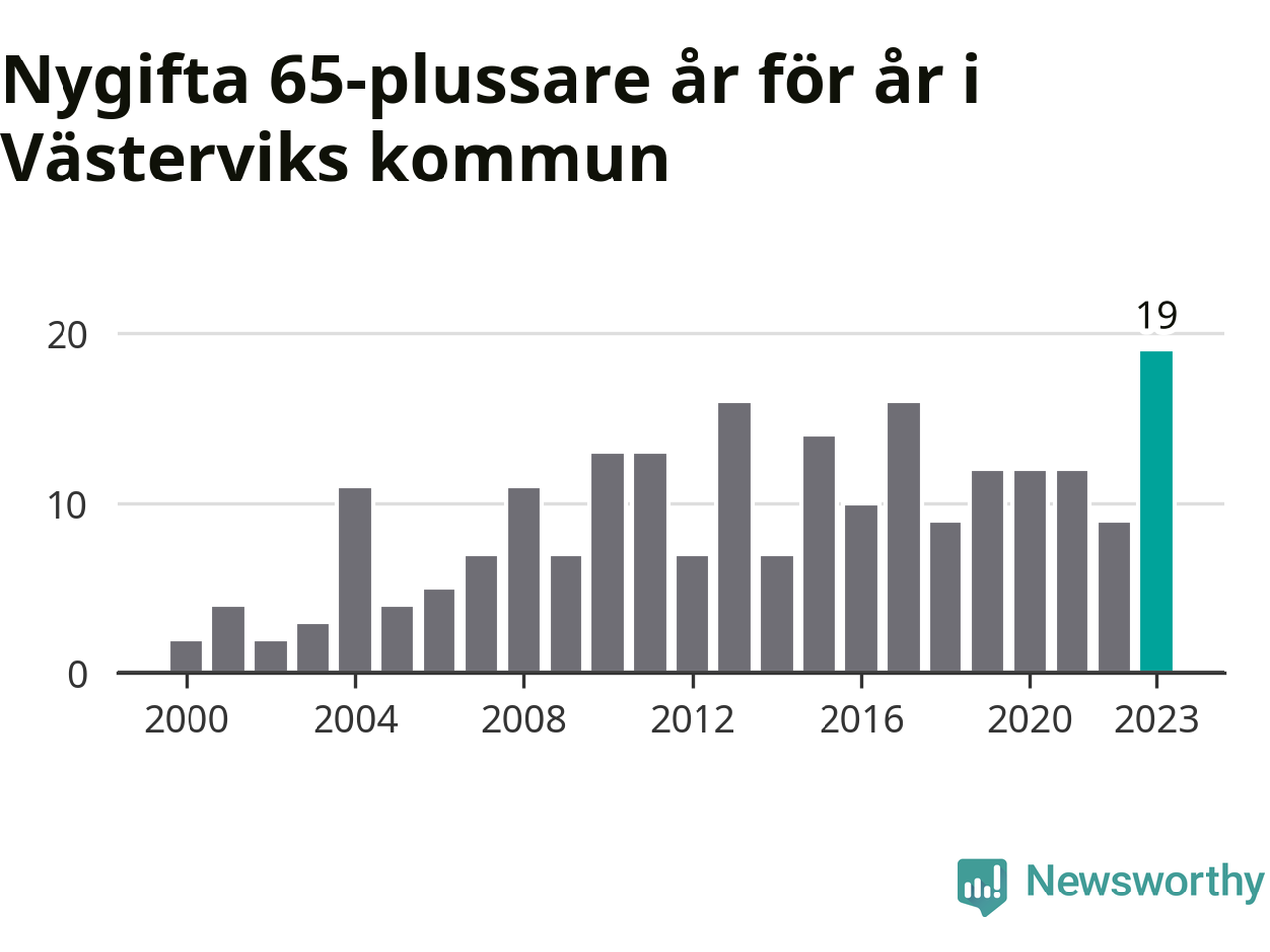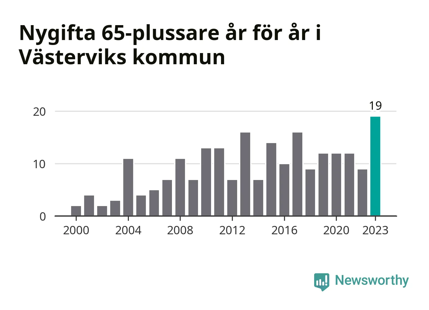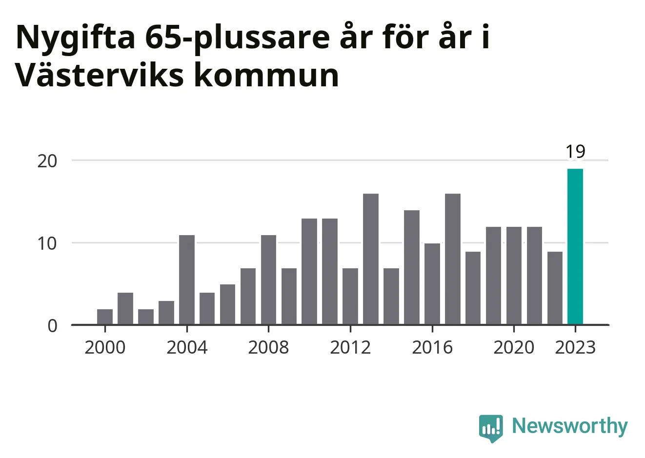56 personer. Så många Västerviksbor gifte sig efter 65-årsdagen under hela 00-talet. Under det senaste decenniet, mellan 2014 och 2023, har samma siffra ökat till 120. Lite mer än en fördubbling, med andra ord. I fjol gifte sig 19 personer över 65 år i Västervik, vilket är fler än något enskilt år sedan år 2000.