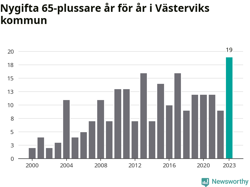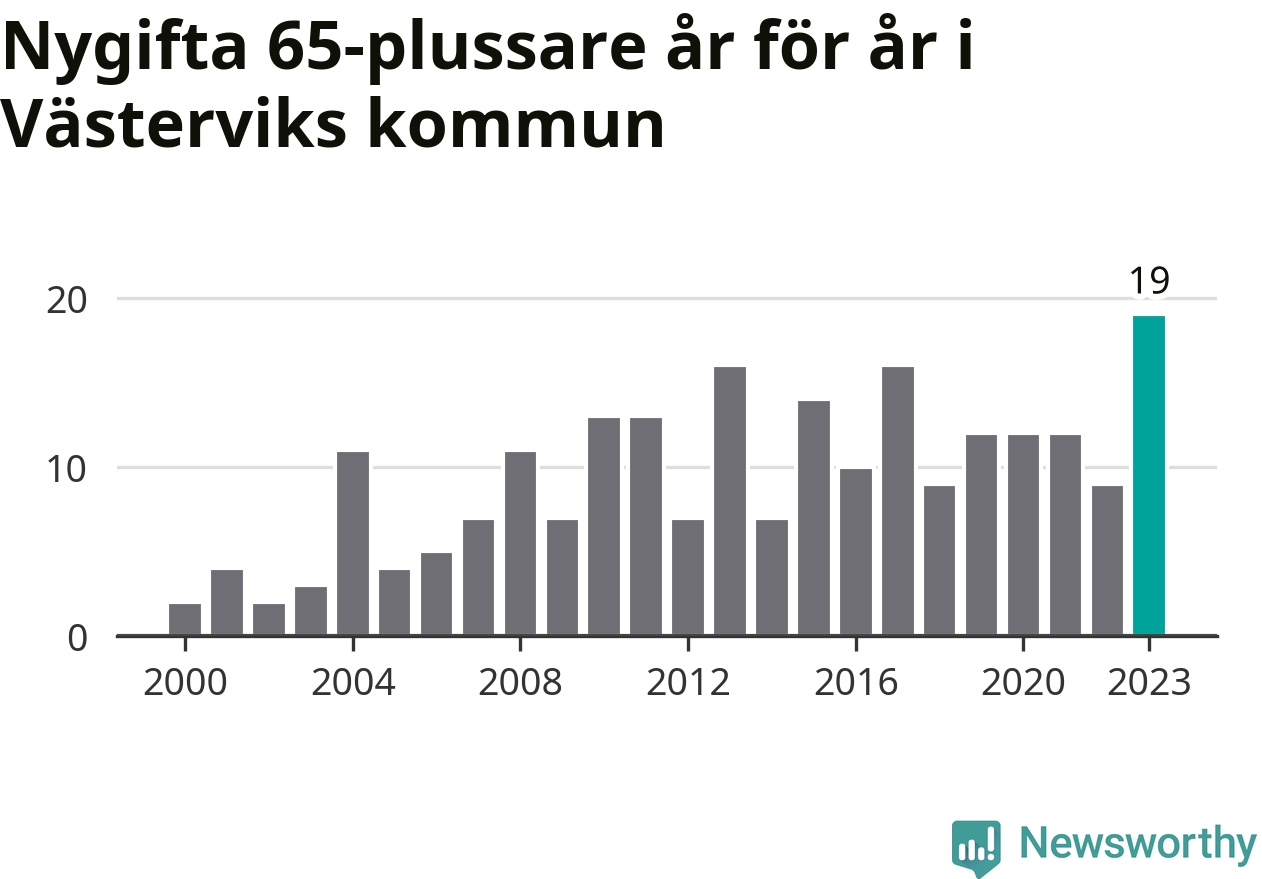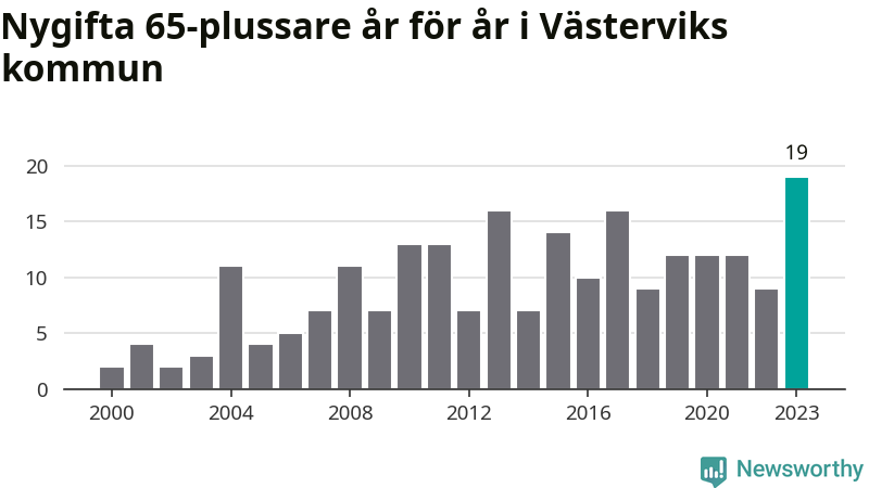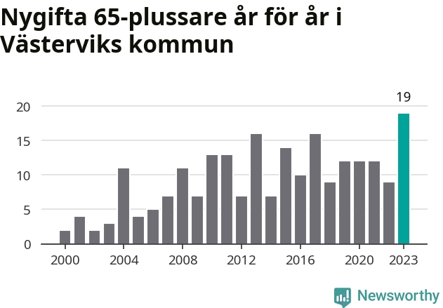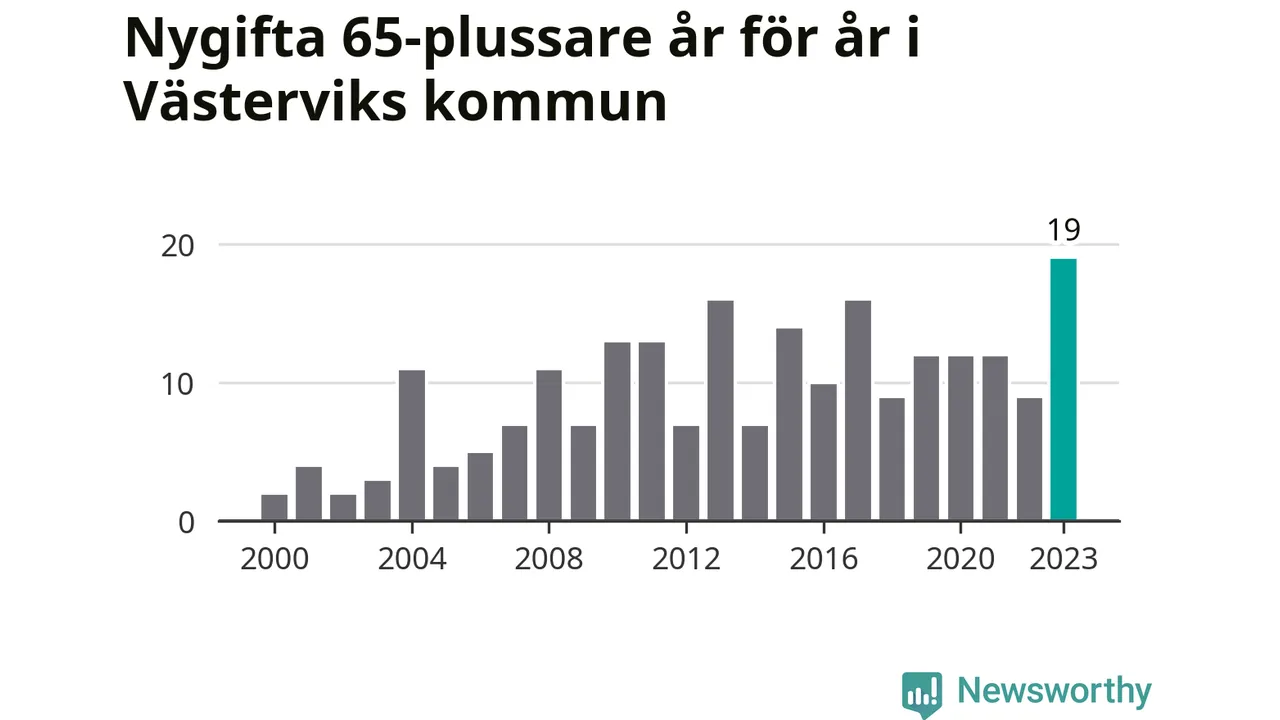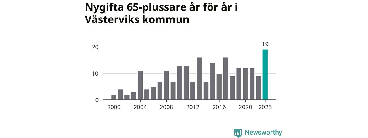 56 personer. Så många Västerviksbor gifte sig efter 65-årsdagen under hela 00-talet. Under det senaste decenniet, mellan 2014 och 2023, har samma siffra ökat till 120. Lite mer än en fördubbling, med andra ord. I fjol gifte sig 19 personer över 65 år i Västervik, vilket är fler än något enskilt år sedan år 2000.