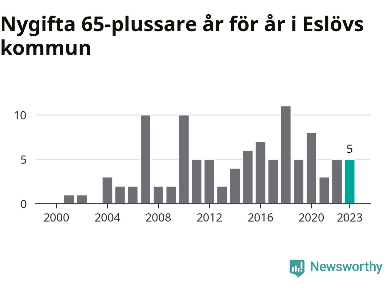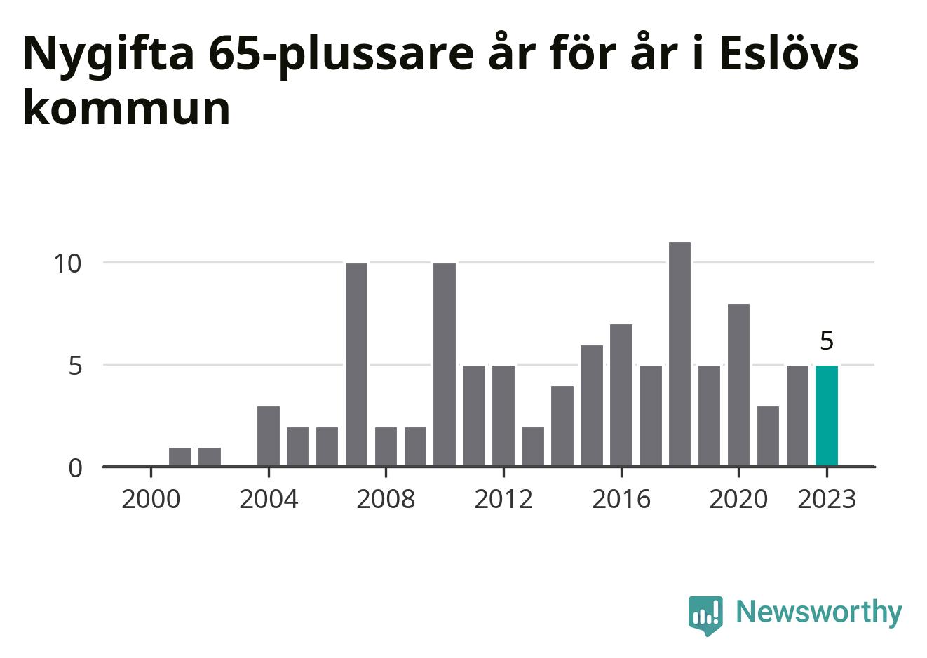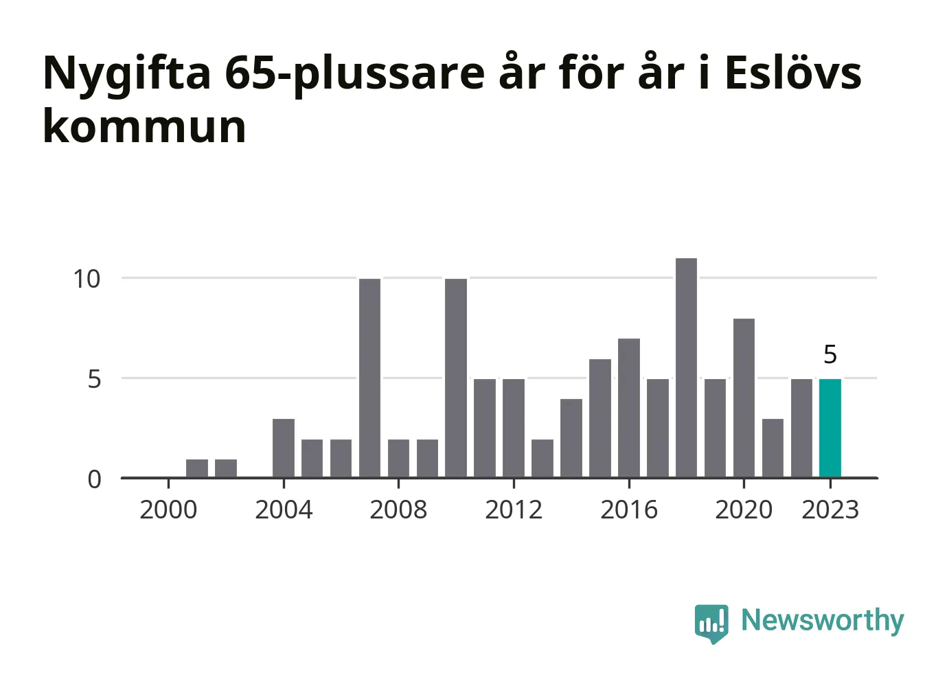 23 personer. Så många Eslövsbor gifte sig efter 65-årsdagen under hela 00-talet. Under det senaste decenniet, mellan 2014 och 2023, har samma siffra ökat till 59. Nästan en tredubbling, med andra ord.