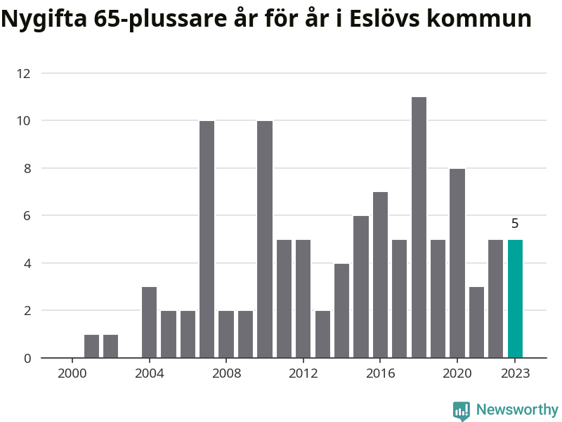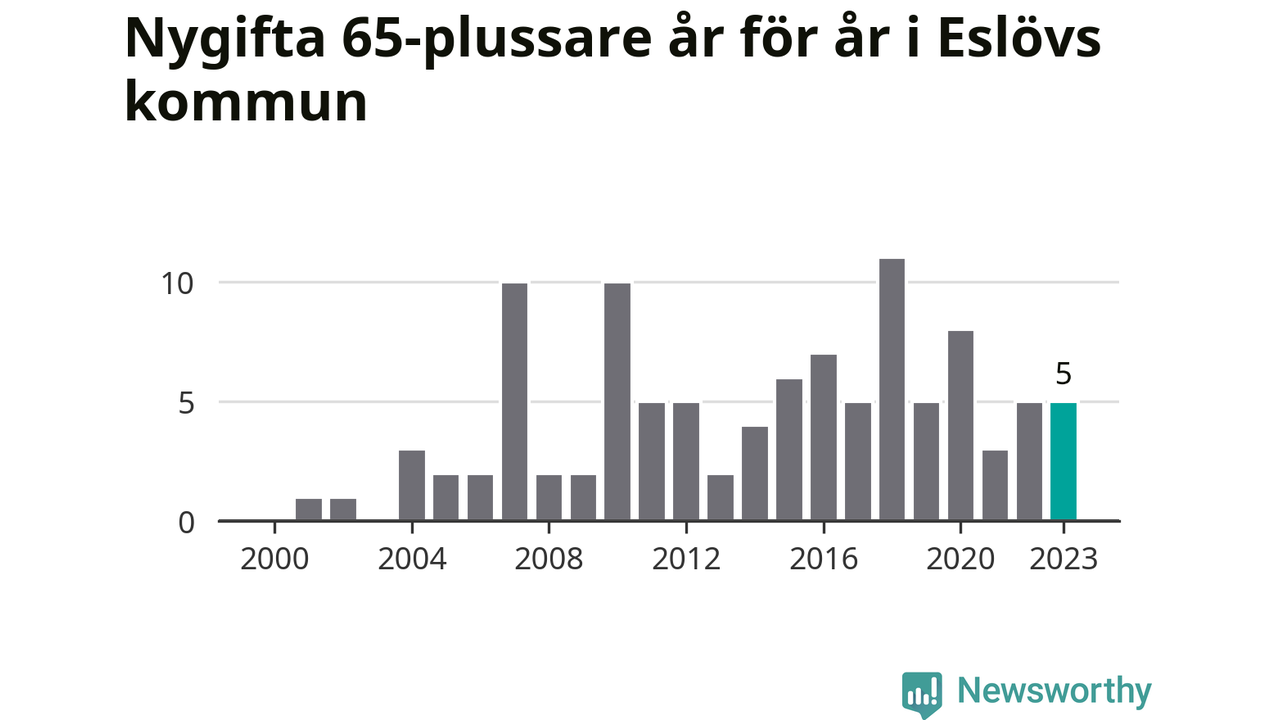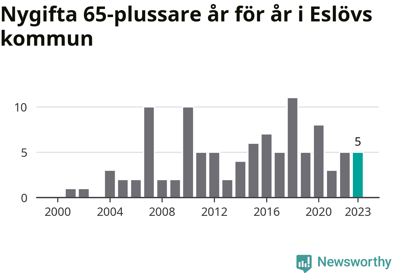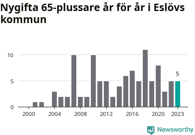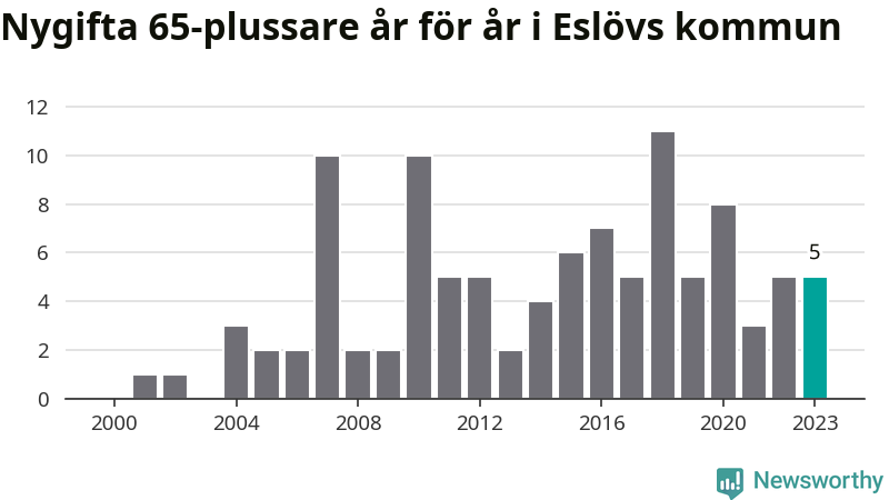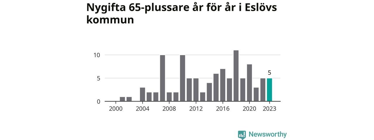 23 personer. Så många Eslövsbor gifte sig efter 65-årsdagen under hela 00-talet. Under det senaste decenniet, mellan 2014 och 2023, har samma siffra ökat till 59. Nästan en tredubbling, med andra ord.
