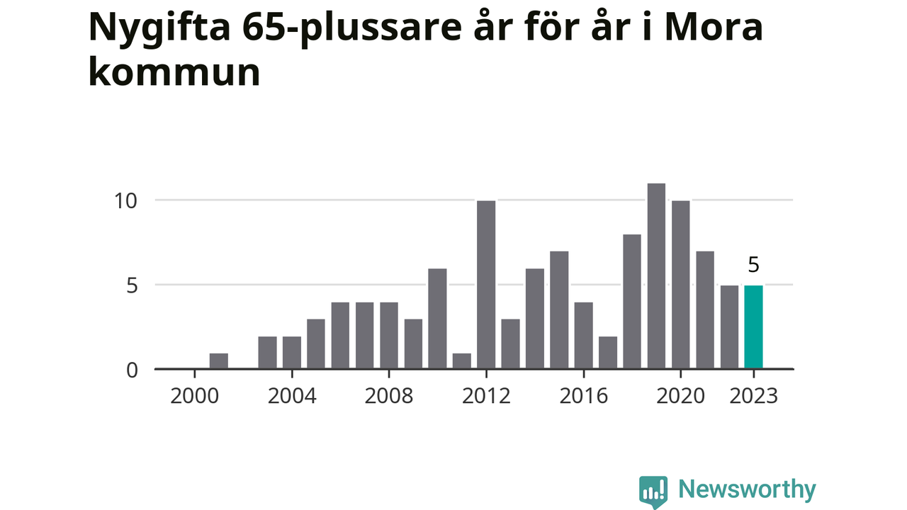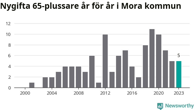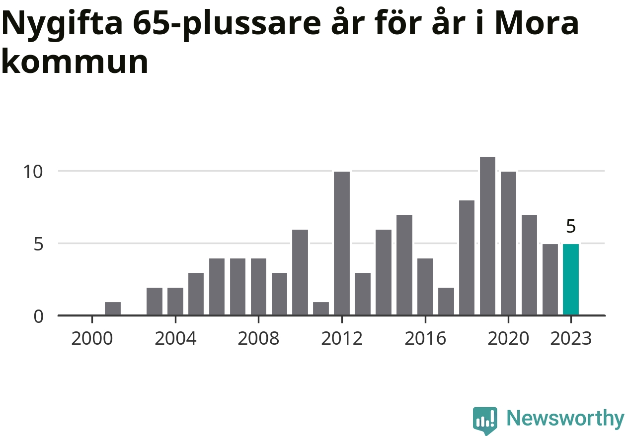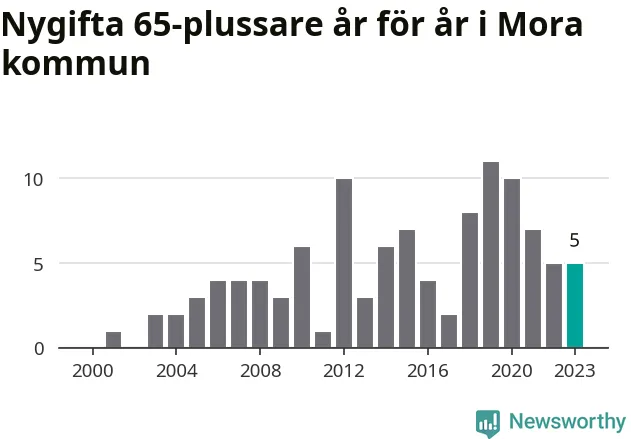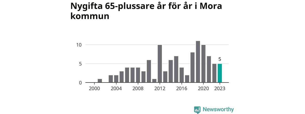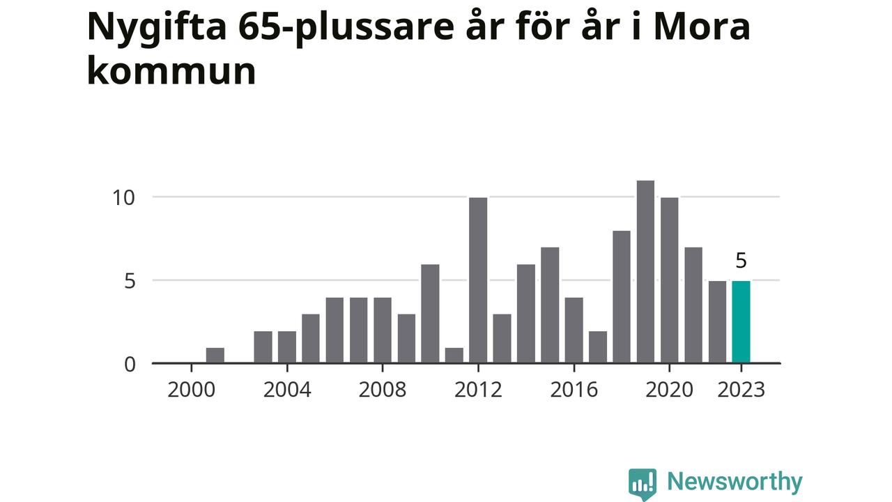 23 personer. Så många Morabor gifte sig efter 65-årsdagen under hela 00-talet. Under det senaste decenniet, mellan 2014 och 2023, har samma siffra ökat till 65. Nästan en tredubbling, med andra ord.