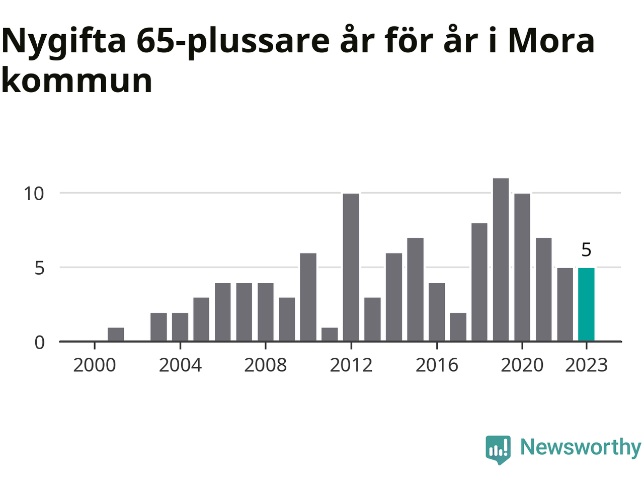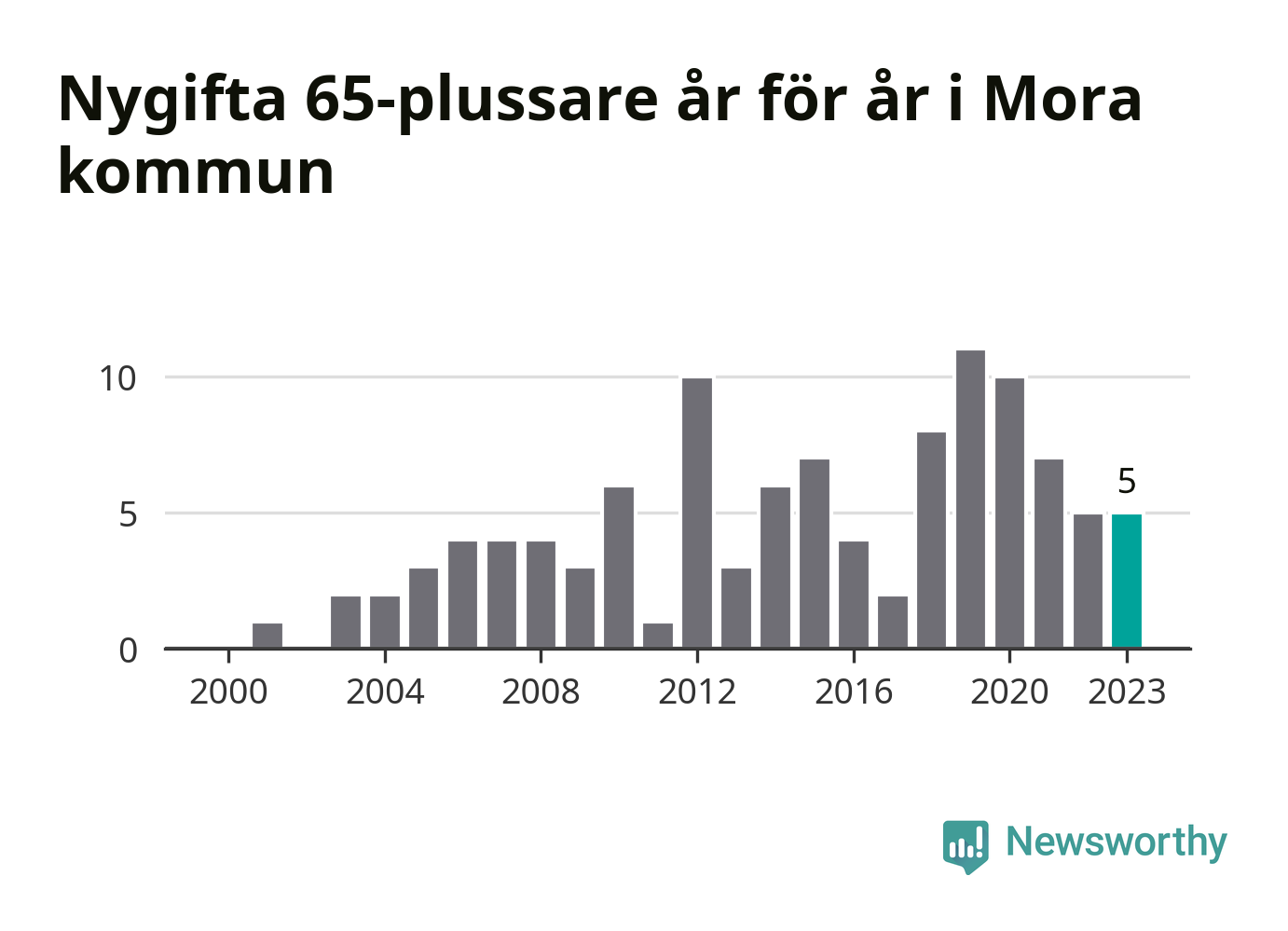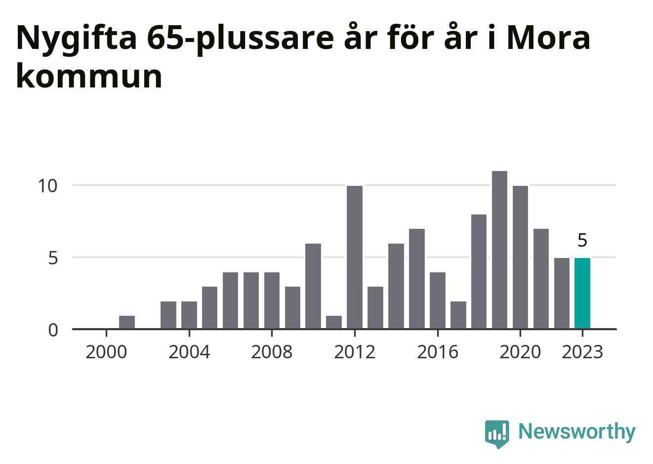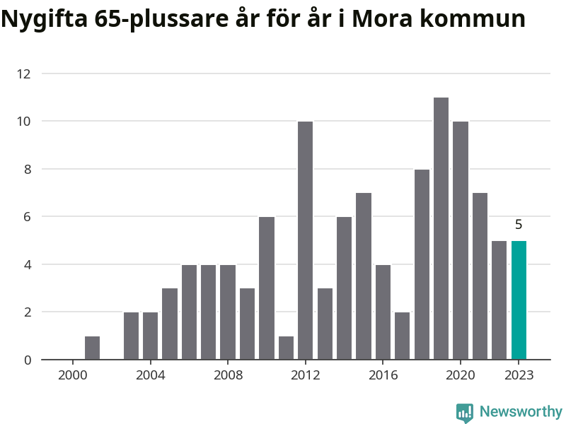 23 personer. Så många Morabor gifte sig efter 65-årsdagen under hela 00-talet. Under det senaste decenniet, mellan 2014 och 2023, har samma siffra ökat till 65. Nästan en tredubbling, med andra ord.