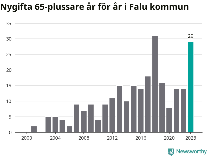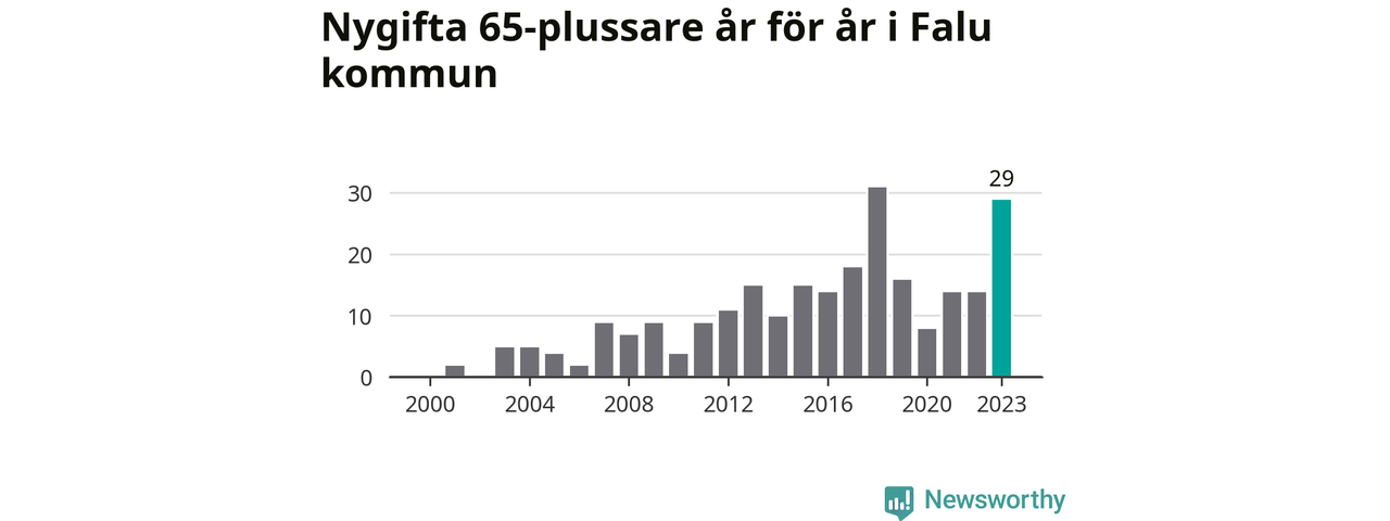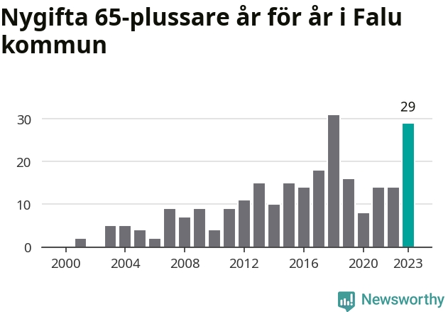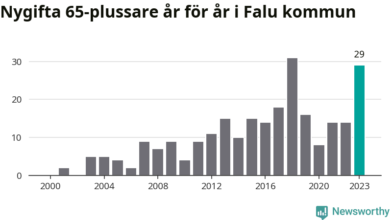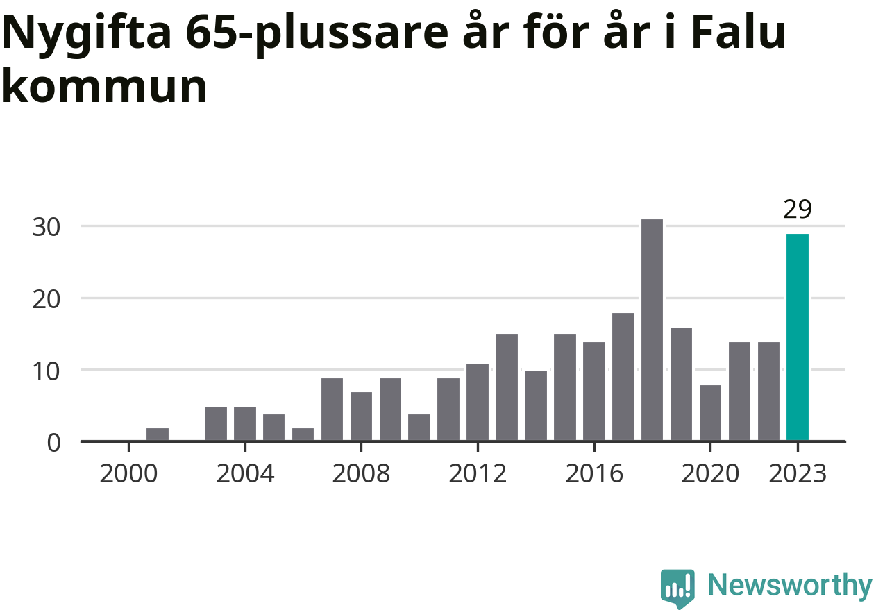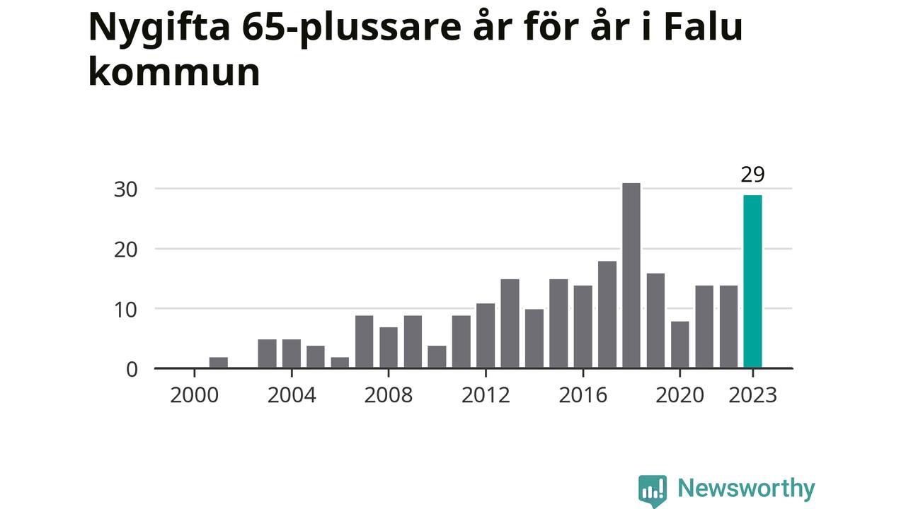 43 personer. Så många Falubor gifte sig efter 65-årsdagen under hela 00-talet. Under det senaste decenniet, mellan 2014 och 2023, har samma siffra ökat till 169. Nästan en fyrdubbling, med andra ord.