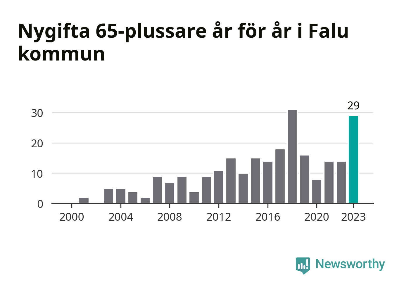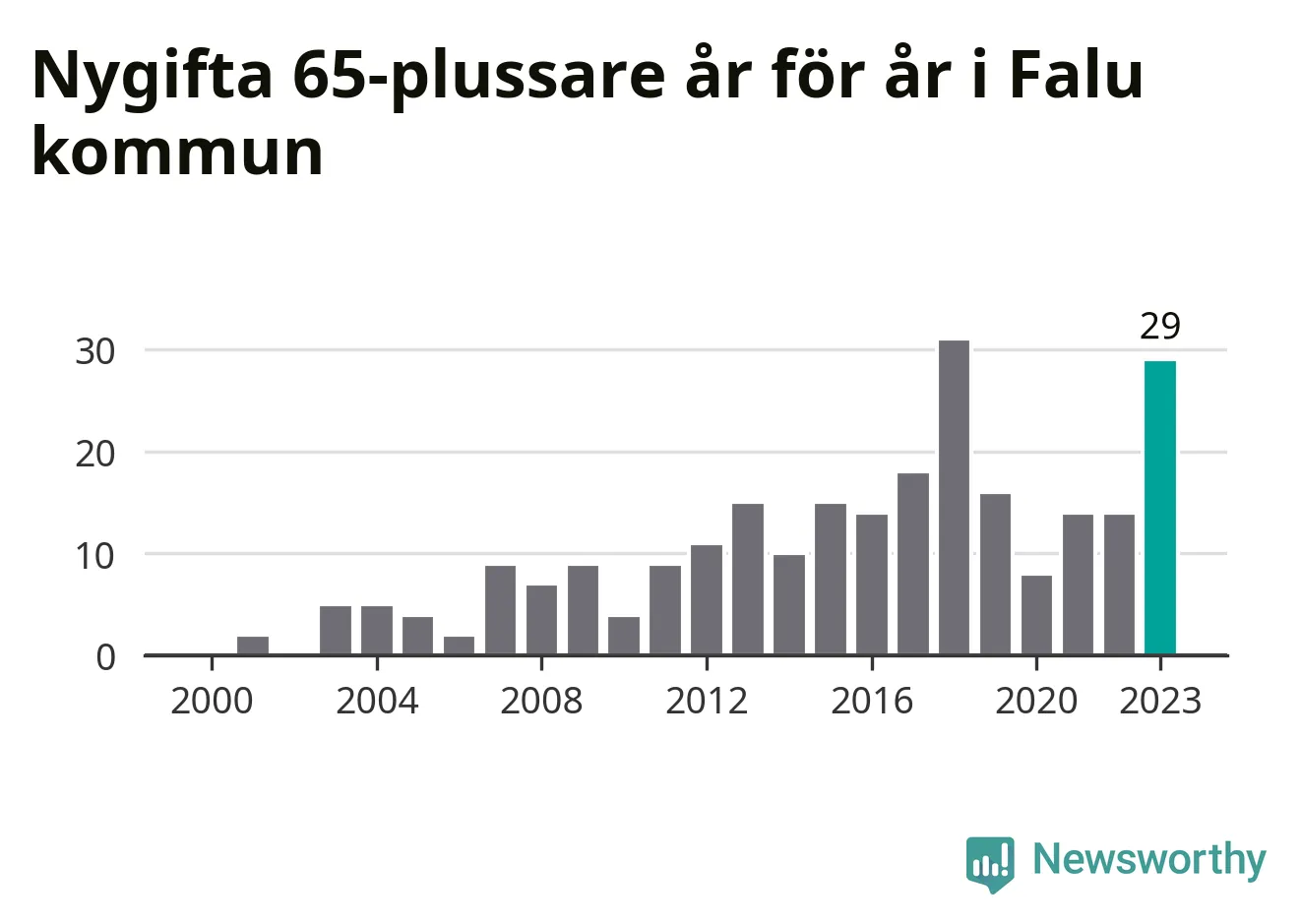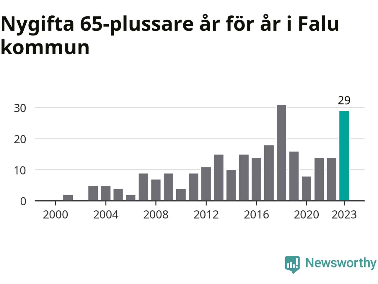 43 personer. Så många Falubor gifte sig efter 65-årsdagen under hela 00-talet. Under det senaste decenniet, mellan 2014 och 2023, har samma siffra ökat till 169. Nästan en fyrdubbling, med andra ord.