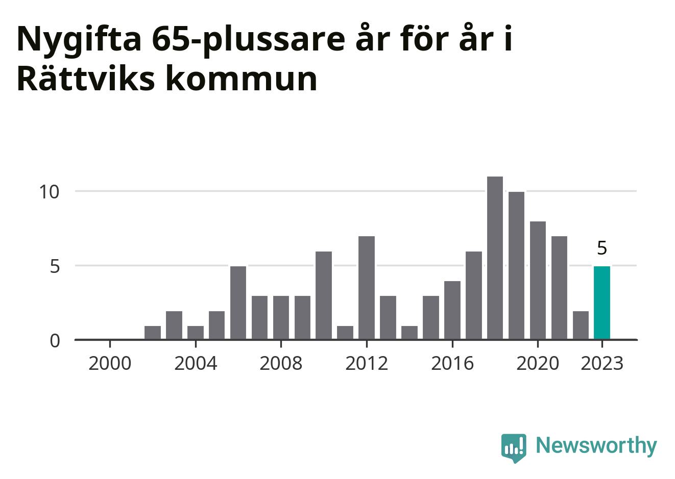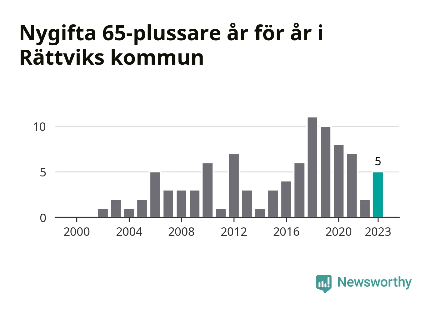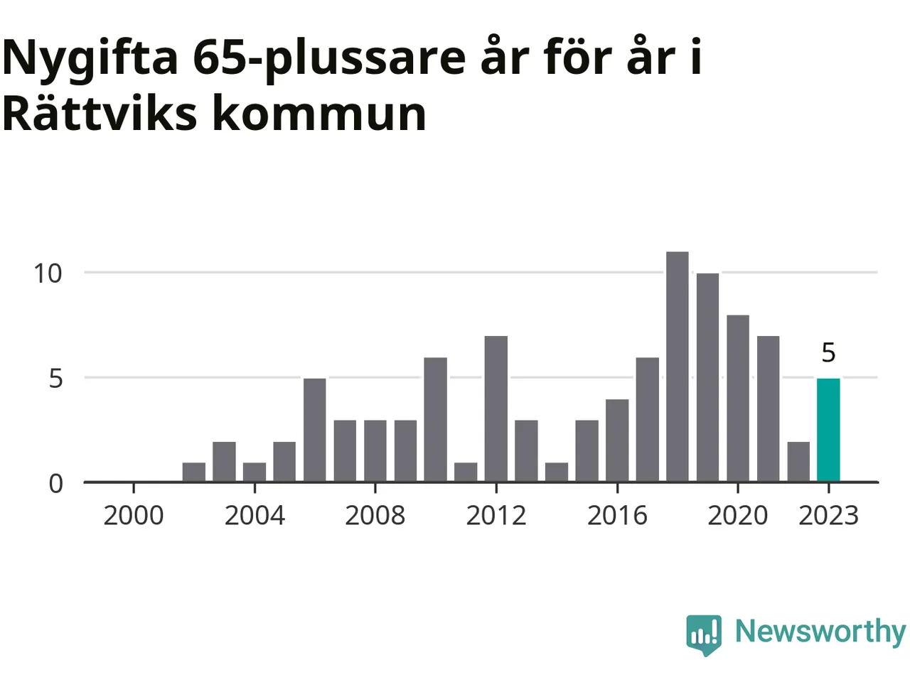 20 personer. Så många Rättviksbor gifte sig efter 65-årsdagen under hela 00-talet. Under det senaste decenniet, mellan 2014 och 2023, har samma siffra ökat till 57. Nästan en tredubbling, med andra ord.