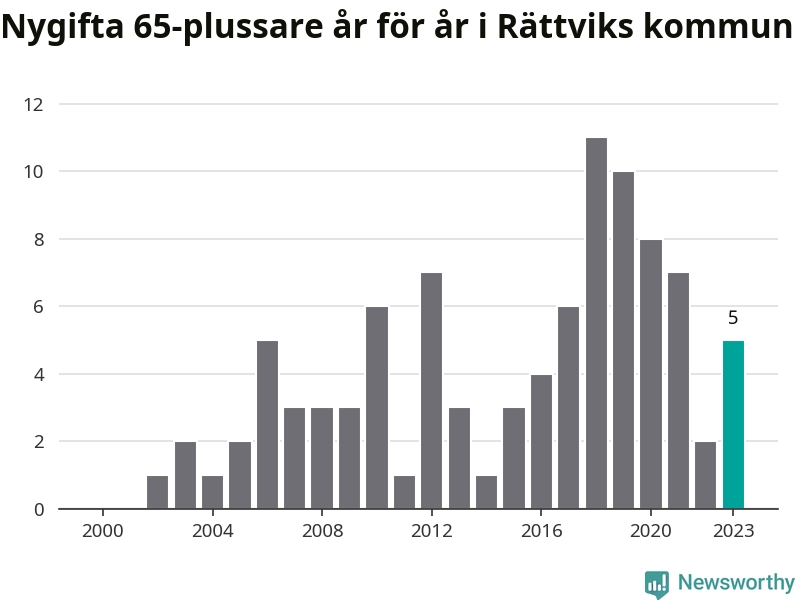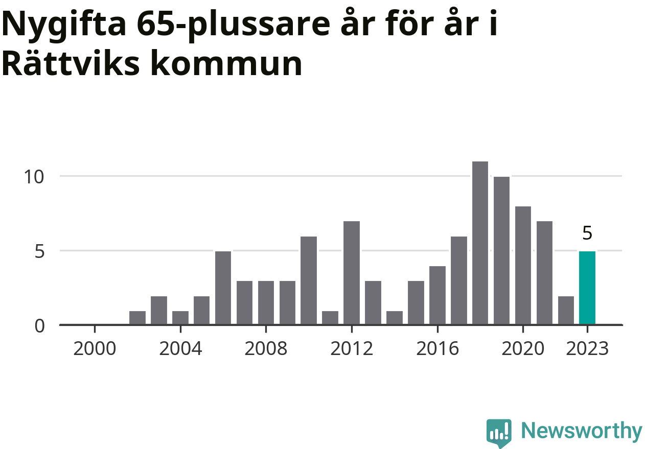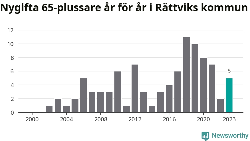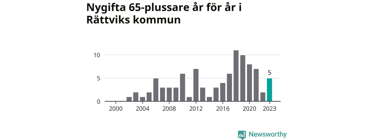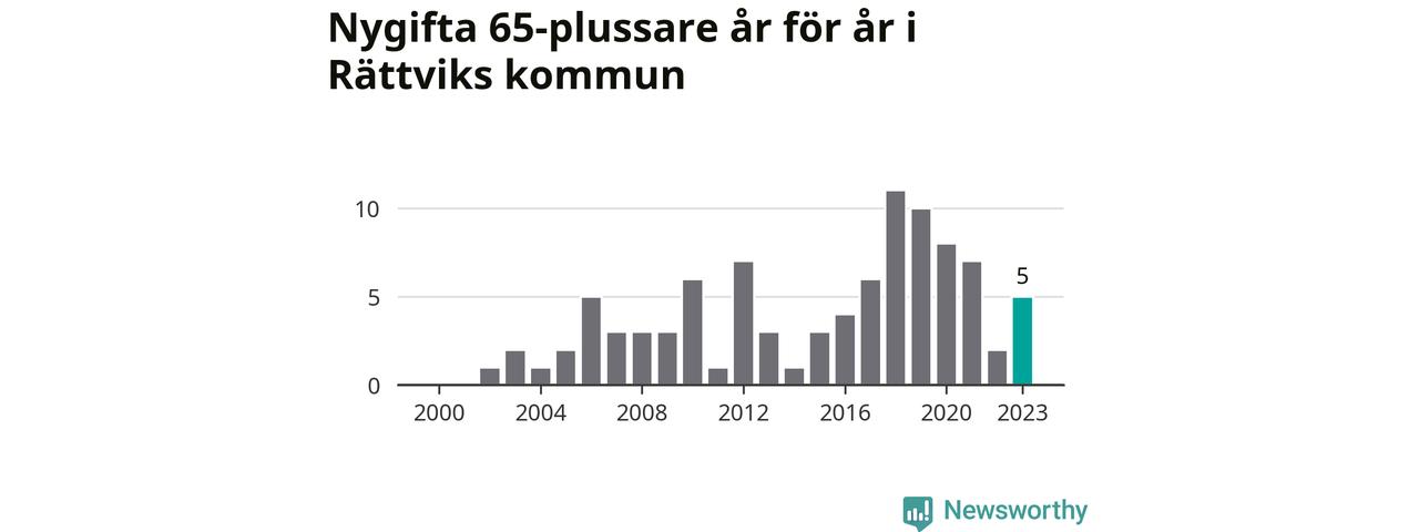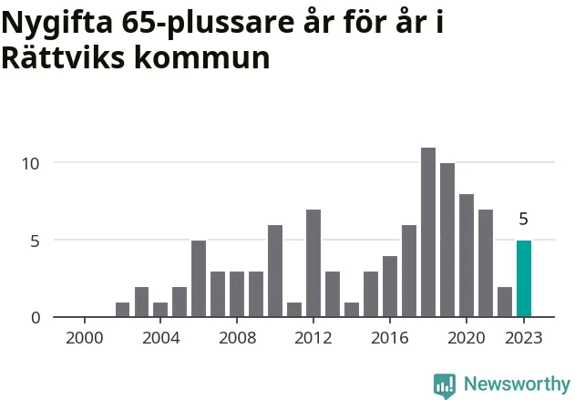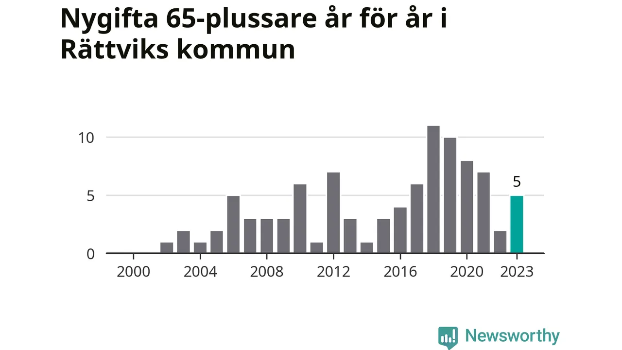 20 personer. Så många Rättviksbor gifte sig efter 65-årsdagen under hela 00-talet. Under det senaste decenniet, mellan 2014 och 2023, har samma siffra ökat till 57. Nästan en tredubbling, med andra ord.
