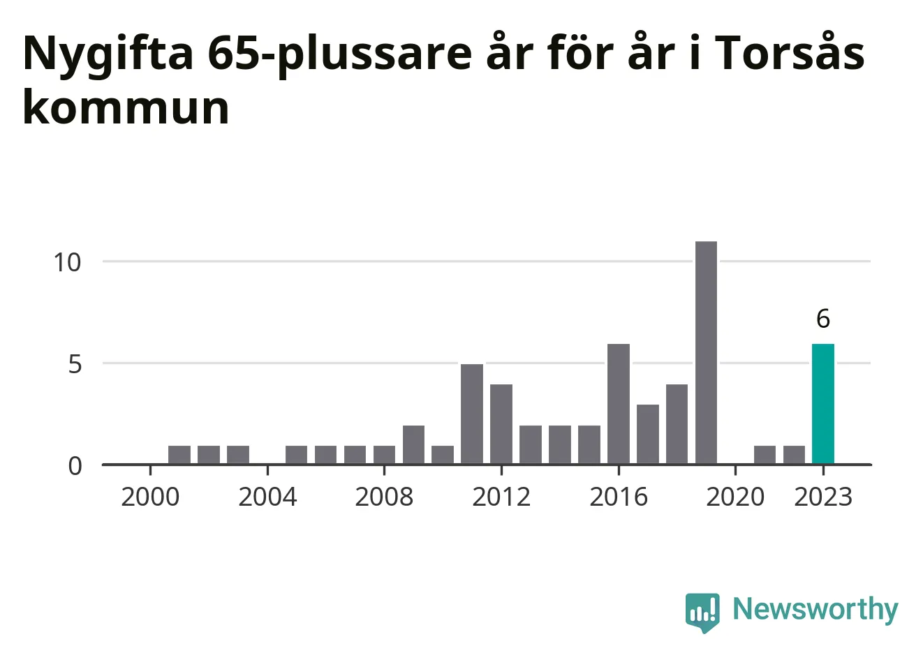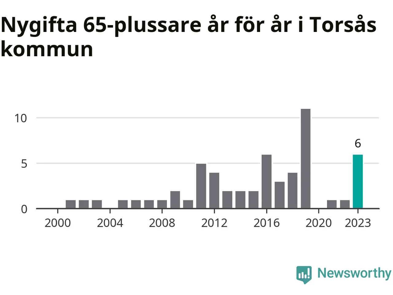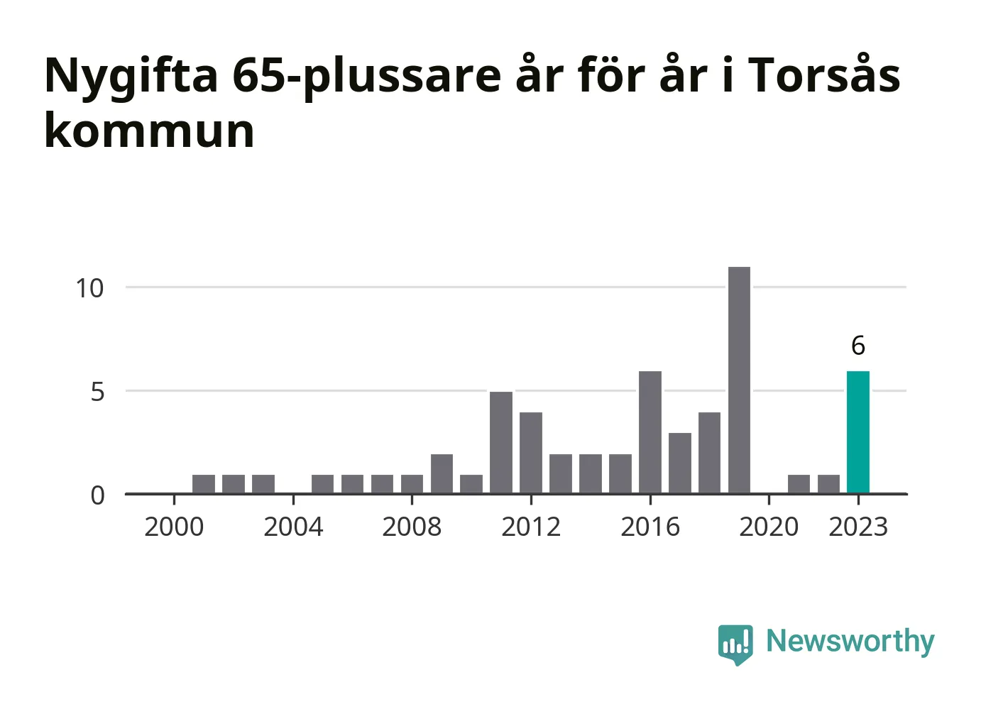 Nio personer. Så många Torsåsbor gifte sig efter 65-årsdagen under hela 00-talet. Under det senaste decenniet, mellan 2014 och 2023, har samma siffra ökat till 36. En fyrdubbling, med andra ord.