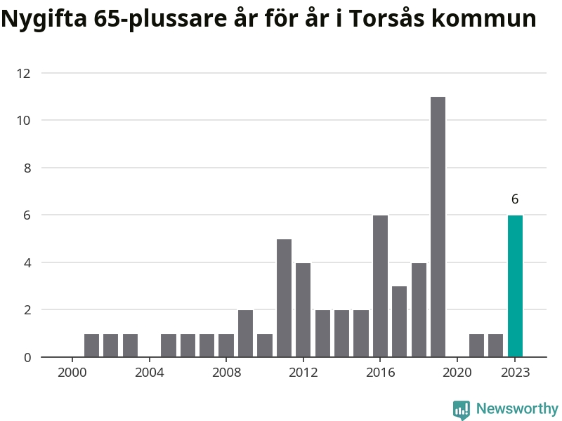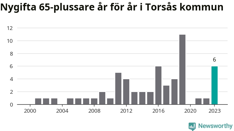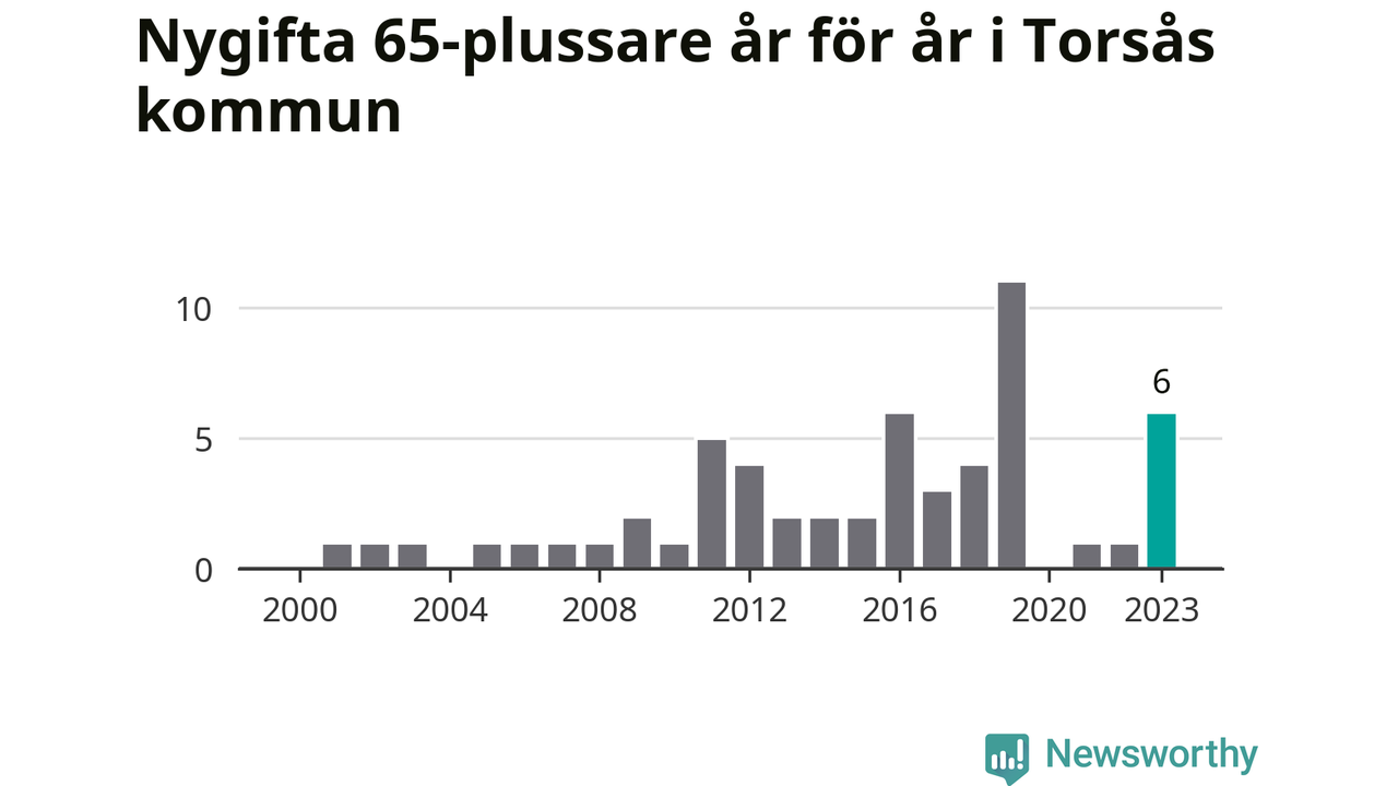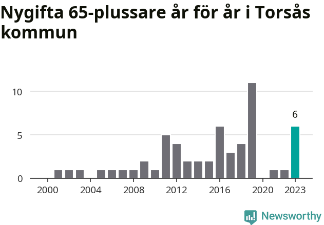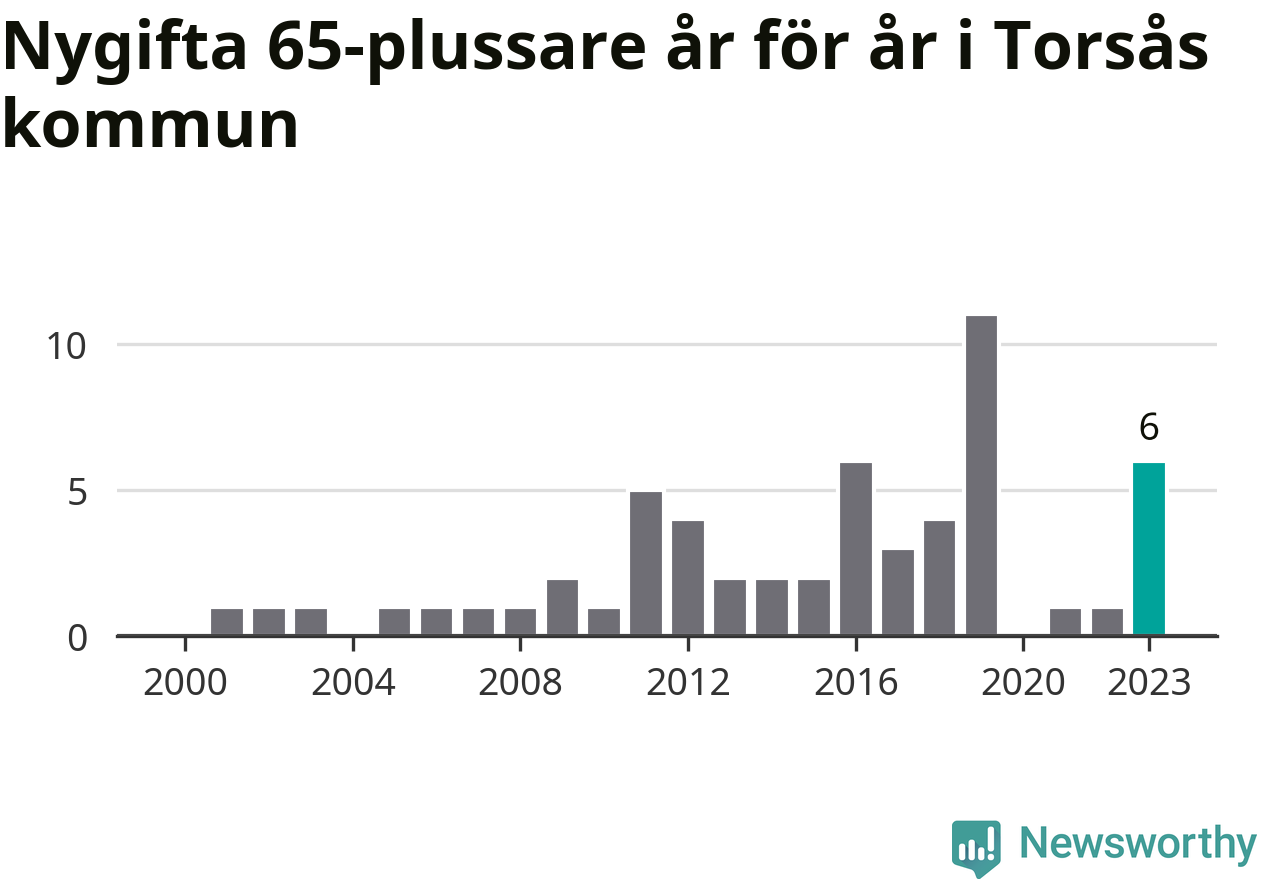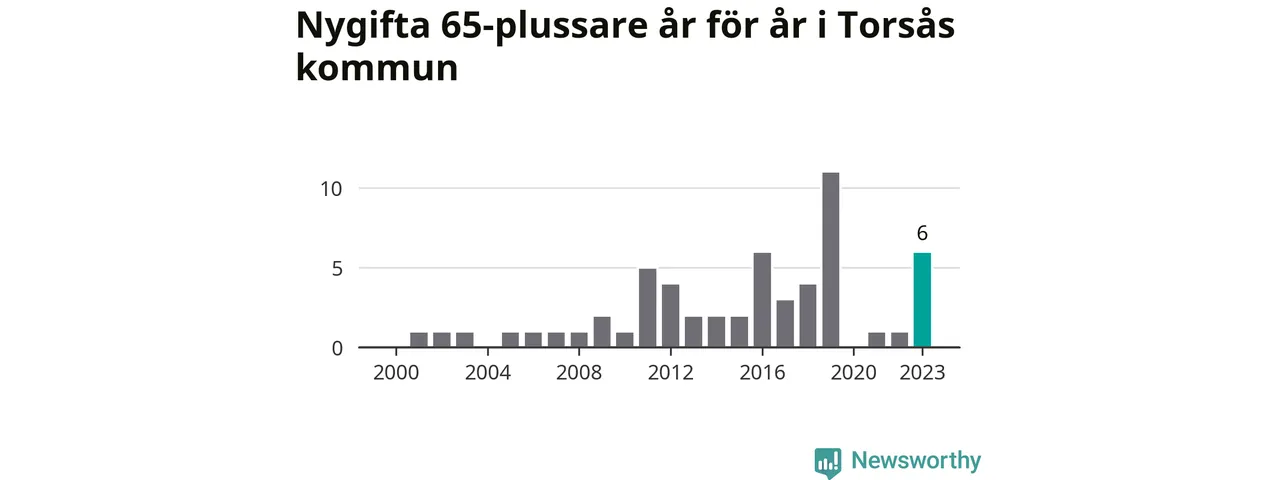 Nio personer. Så många Torsåsbor gifte sig efter 65-årsdagen under hela 00-talet. Under det senaste decenniet, mellan 2014 och 2023, har samma siffra ökat till 36. En fyrdubbling, med andra ord.