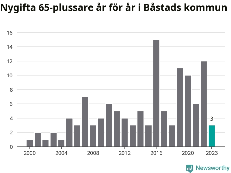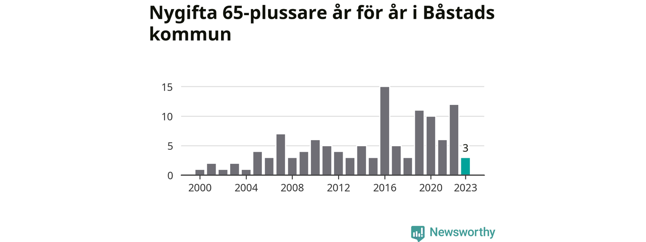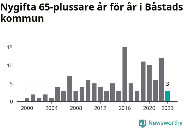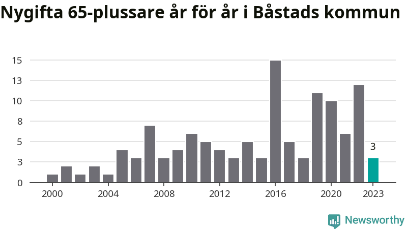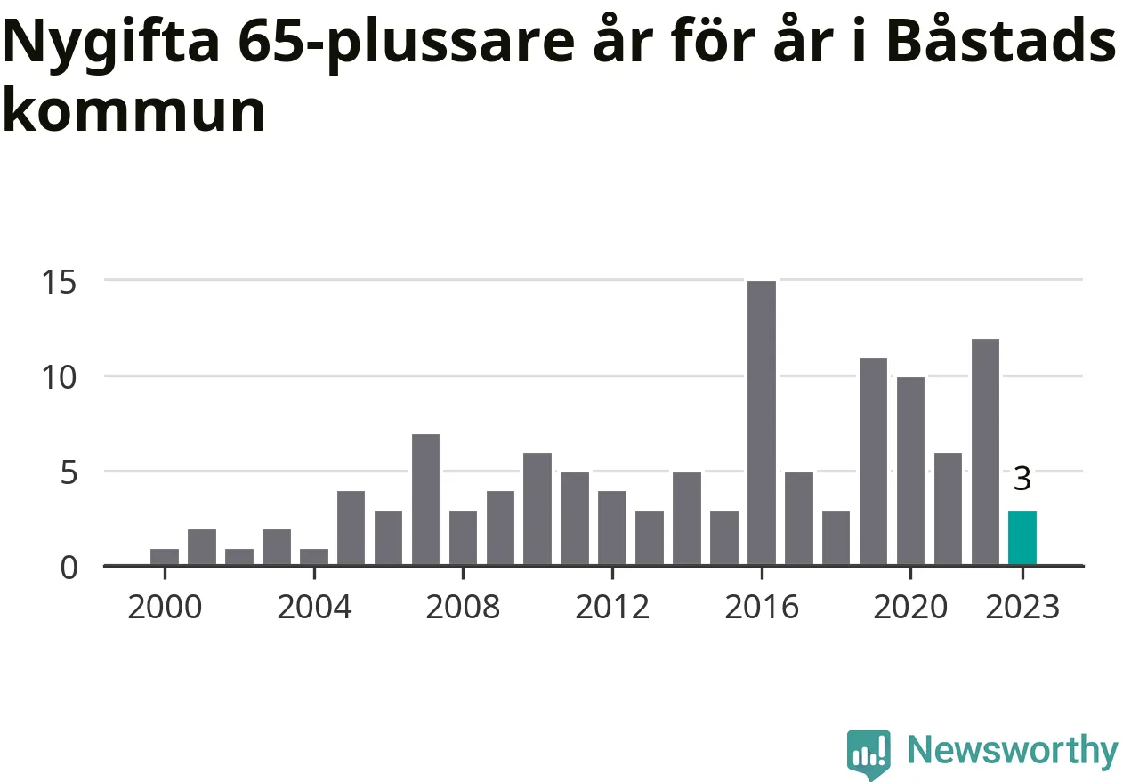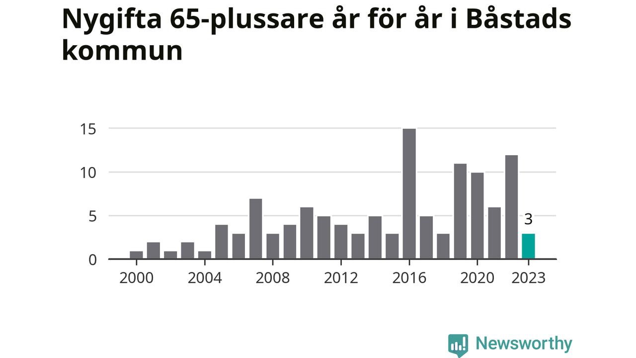 28 personer. Så många Båstadsbor gifte sig efter 65-årsdagen under hela 00-talet. Under det senaste decenniet, mellan 2014 och 2023, har samma siffra ökat till 73. Nästan en tredubbling, med andra ord.