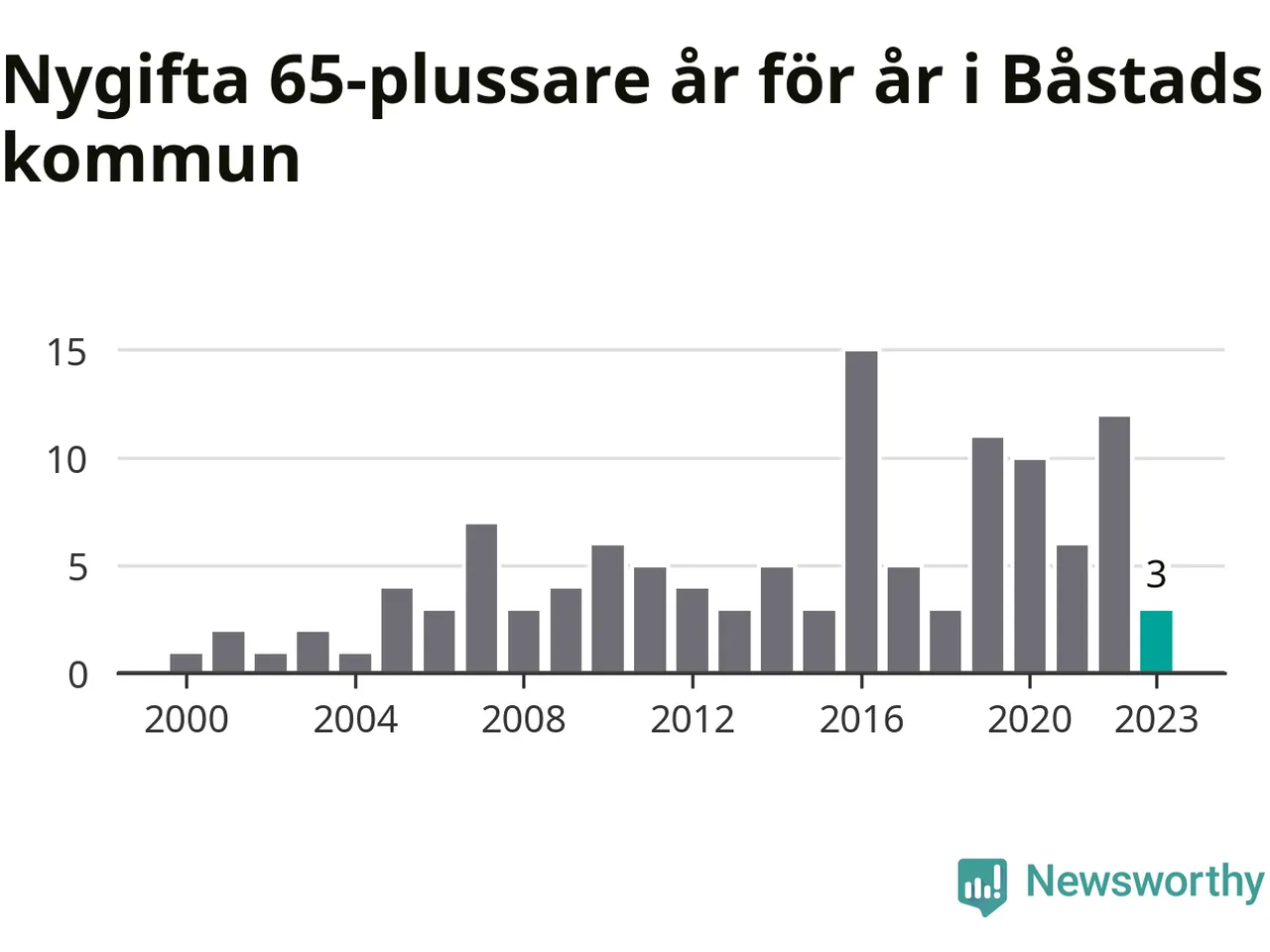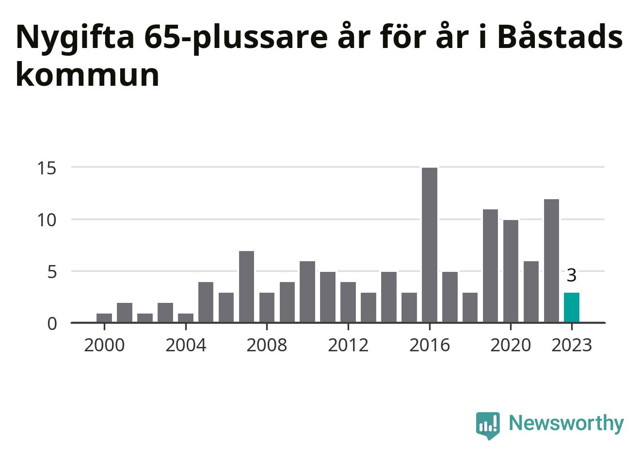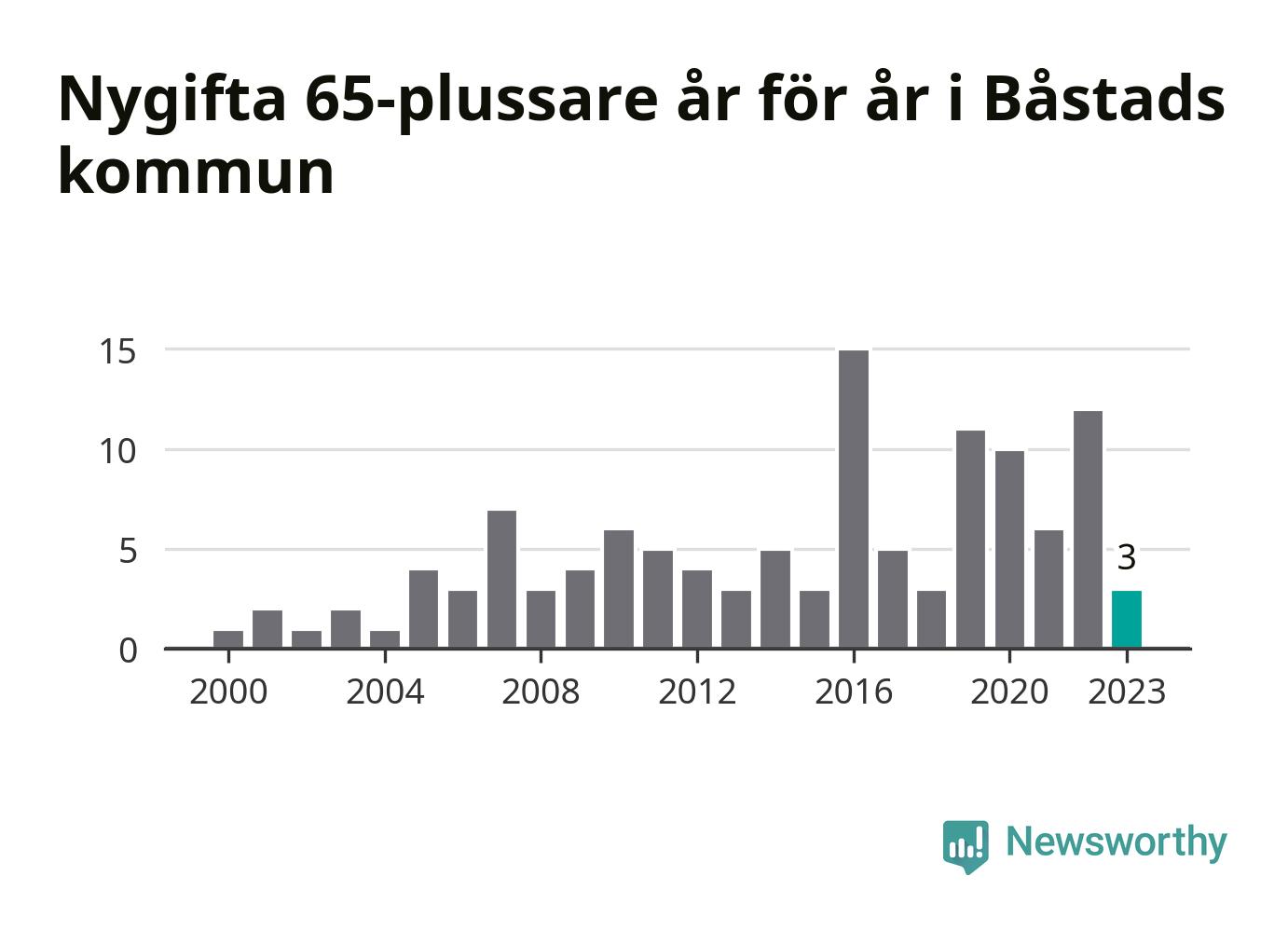28 personer. Så många Båstadsbor gifte sig efter 65-årsdagen under hela 00-talet. Under det senaste decenniet, mellan 2014 och 2023, har samma siffra ökat till 73. Nästan en tredubbling, med andra ord.