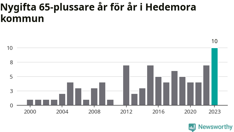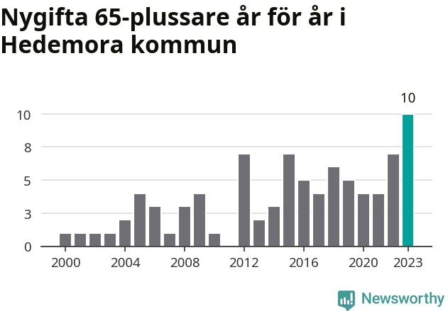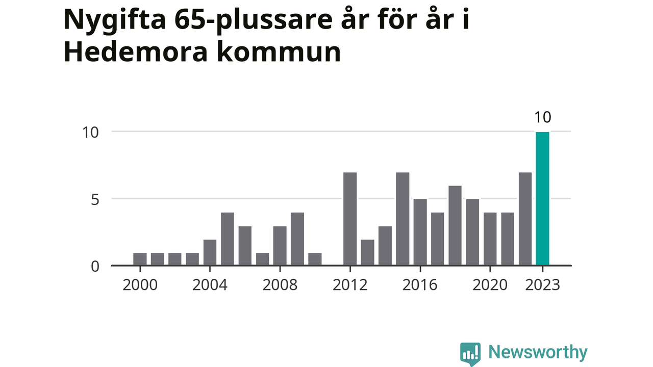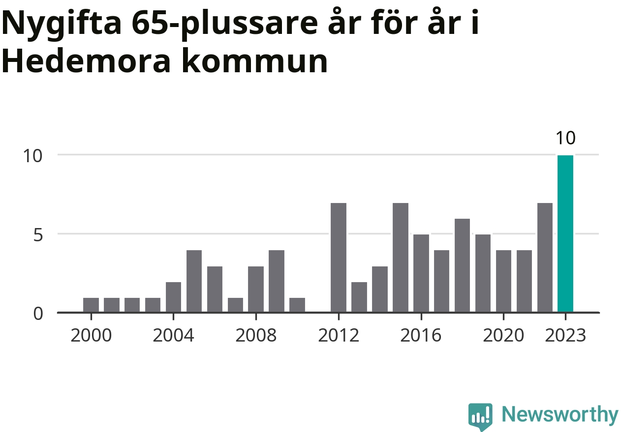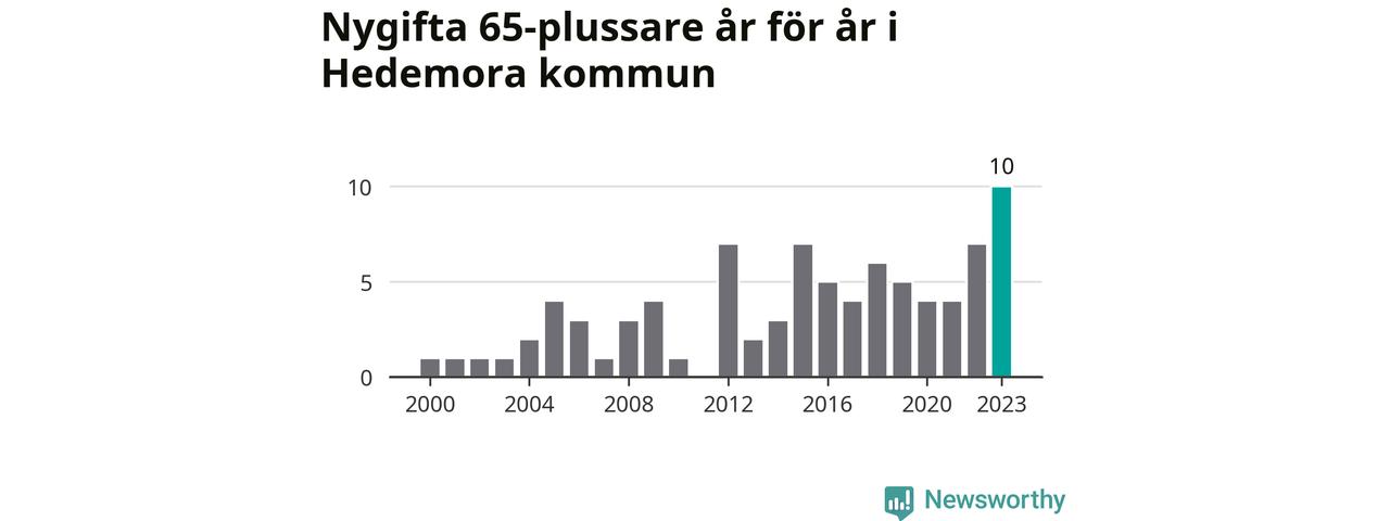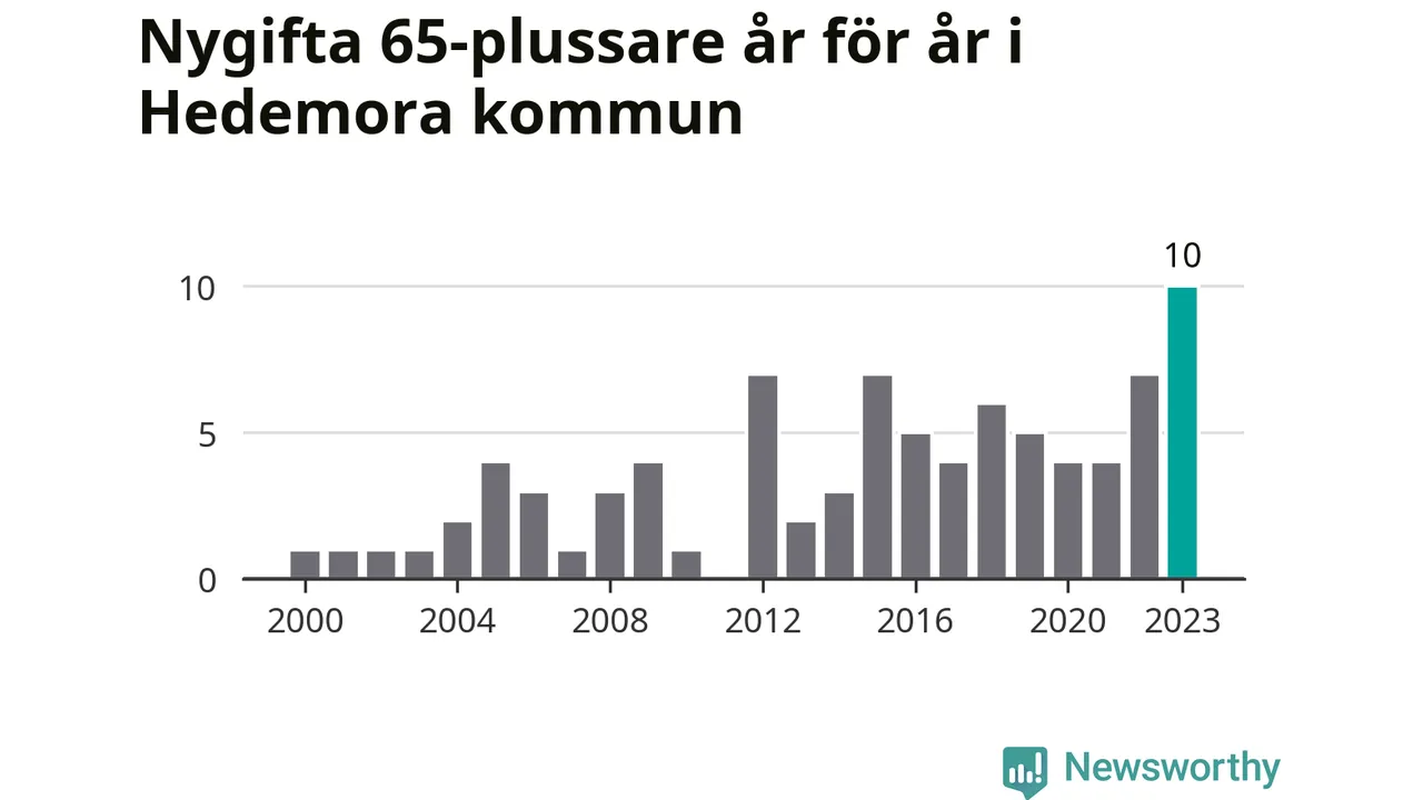21 personer. Så många Hedemorabor gifte sig efter 65-årsdagen under hela 00-talet. Under det senaste decenniet, mellan 2014 och 2023, har samma siffra ökat till 55. Nästan en tredubbling, med andra ord. I fjol gifte sig tio personer över 65 år i Hedemora, vilket är fler än något enskilt år sedan år 2000.