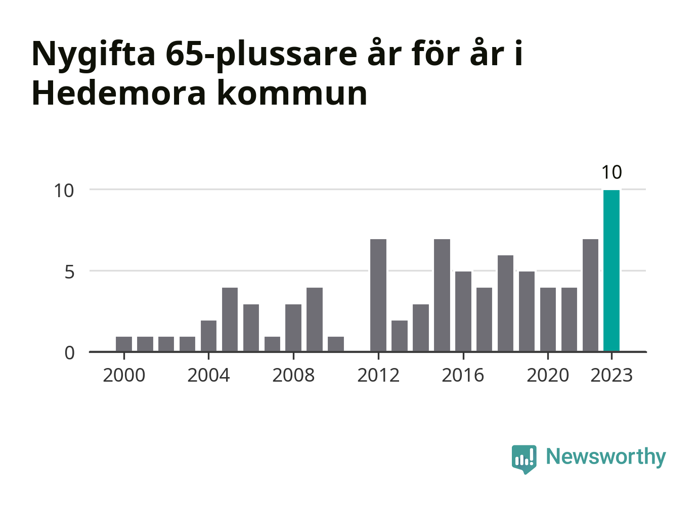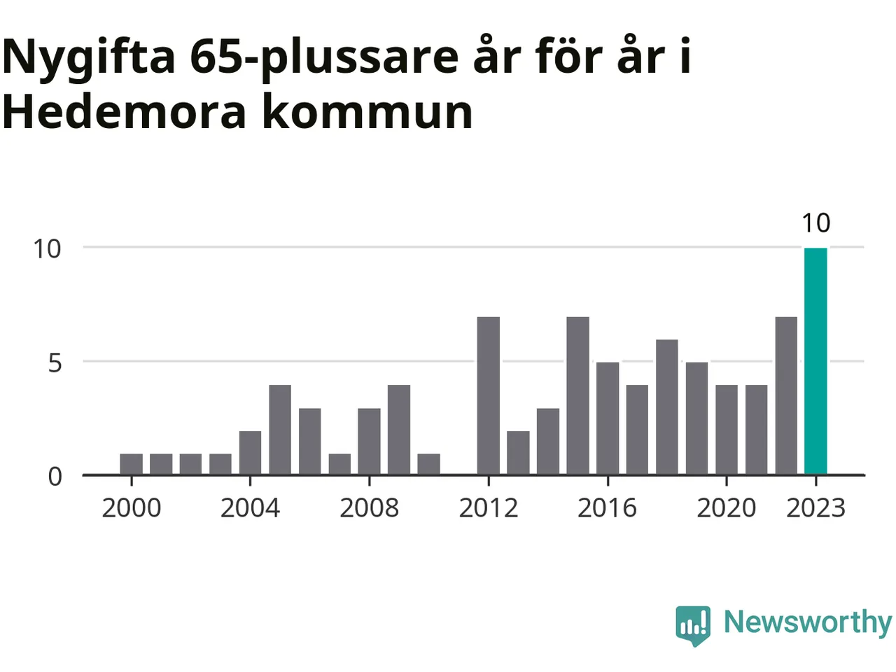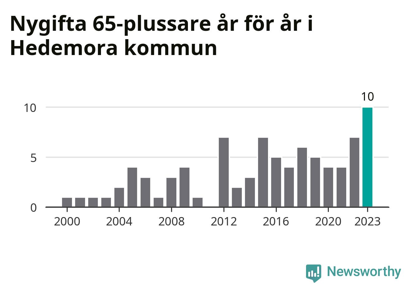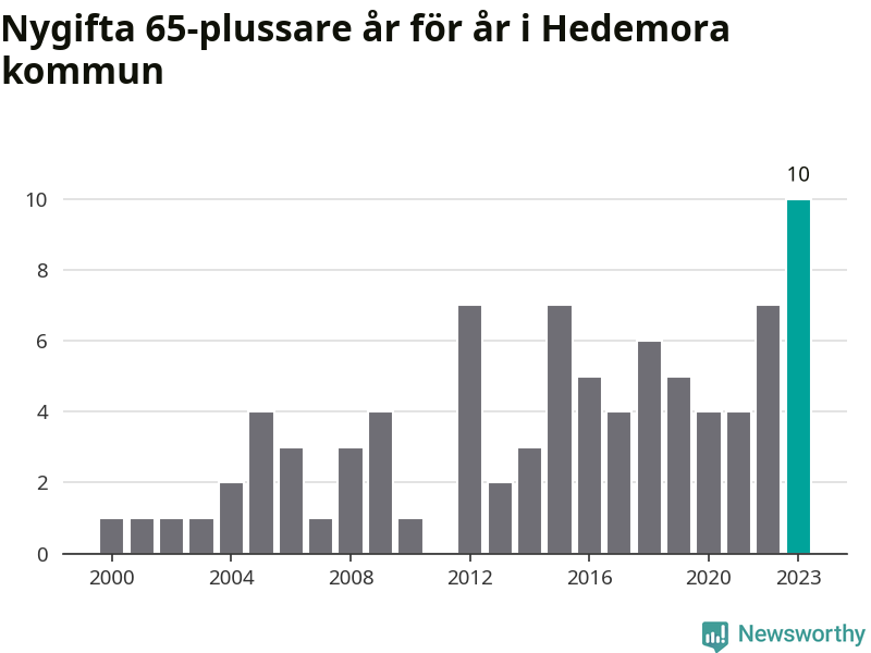 21 personer. Så många Hedemorabor gifte sig efter 65-årsdagen under hela 00-talet. Under det senaste decenniet, mellan 2014 och 2023, har samma siffra ökat till 55. Nästan en tredubbling, med andra ord. I fjol gifte sig tio personer över 65 år i Hedemora, vilket är fler än något enskilt år sedan år 2000.