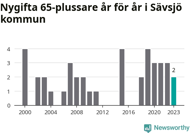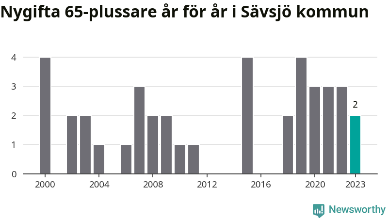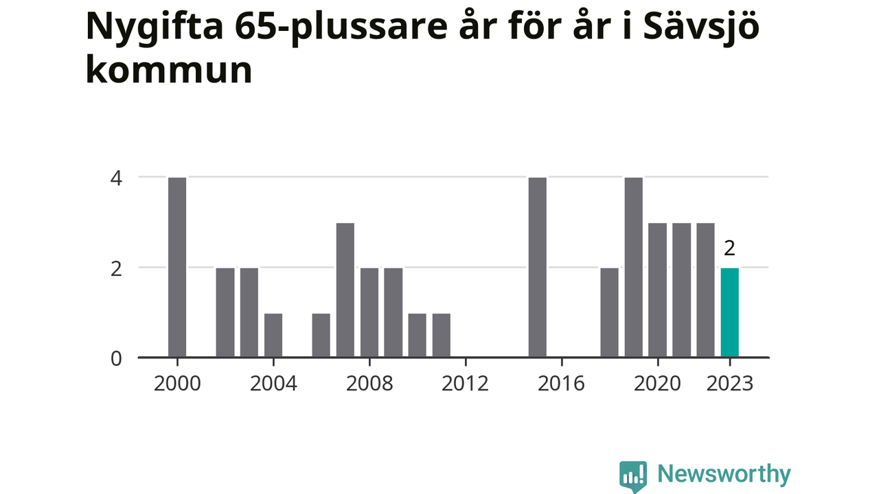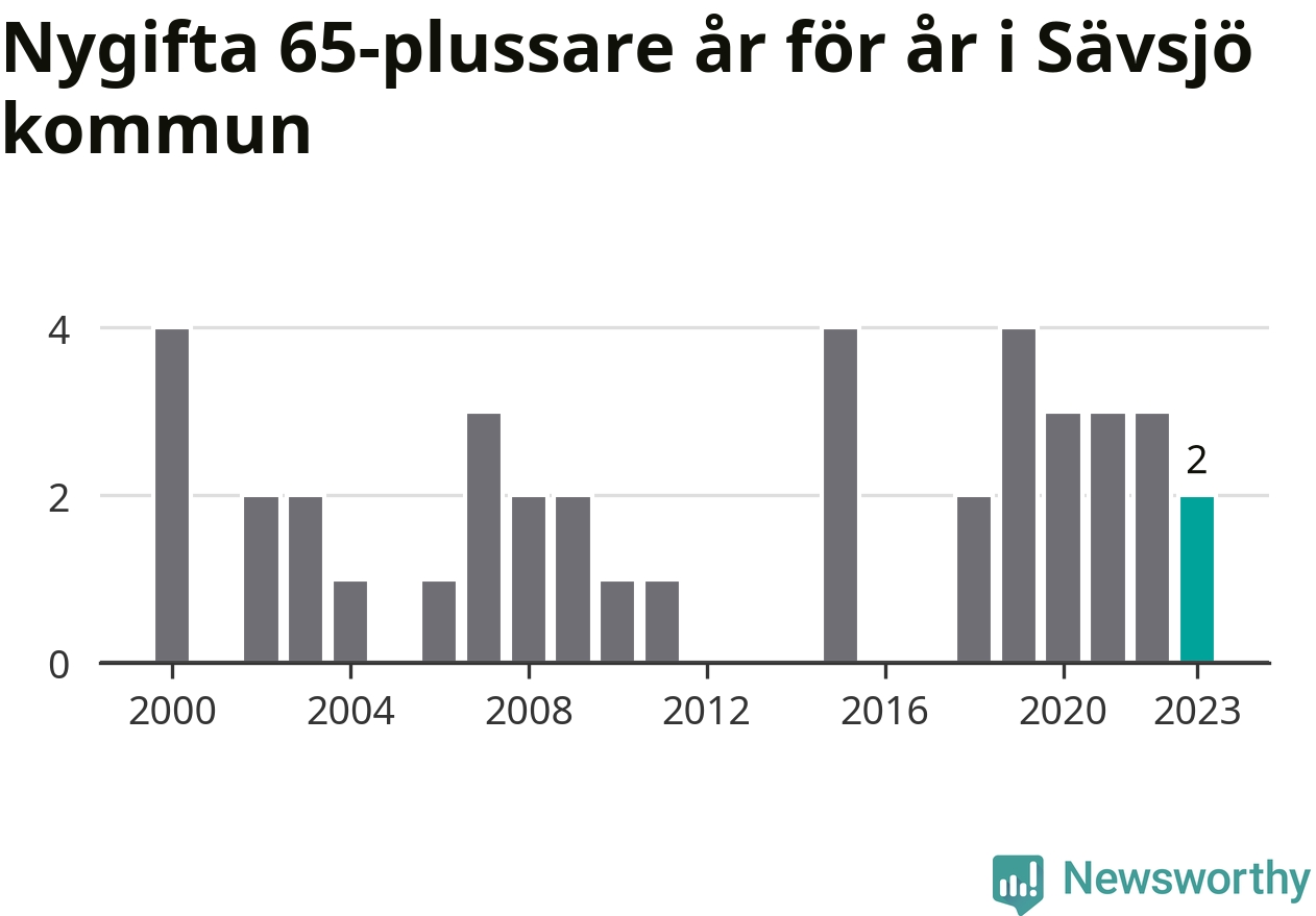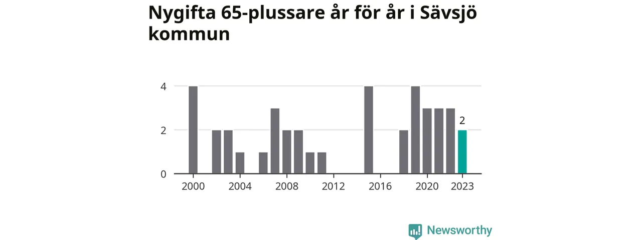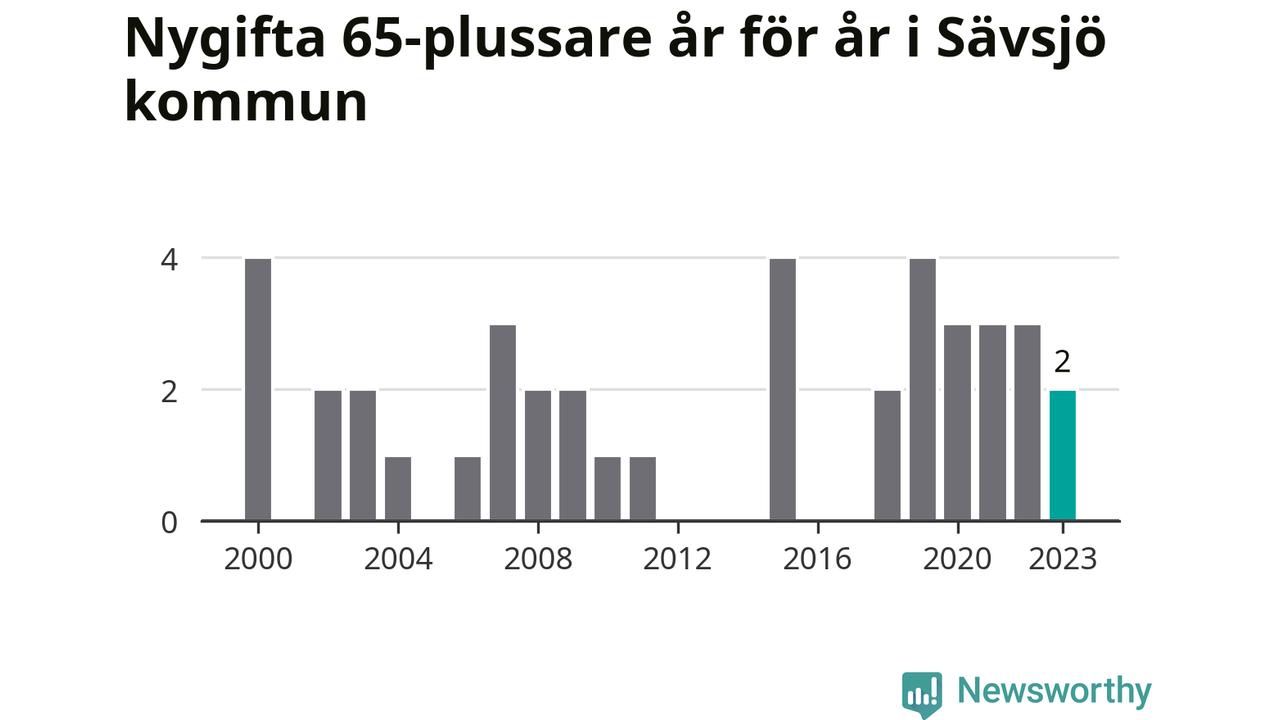 Bröllop bland 65-plussare har ökat markant i Sverige de senaste 25 åren. Men i Sävsjö har bröllopsyran bland de äldre inte varit lika tydlig. Under 00-talet gifte sig 17 Sävsjöbor efter 65-årsdagen, vilket ökade till 21 personer under det senaste decenniet. Förra året gifte sig två personer över 65 år i Sävsjö, att jämföra med det totala antalet på 78 personer som gifte sig i kommunen under samma period. Sävsjö är en av de platser där seniorer som slår sina påsar ihop har ökat minst.