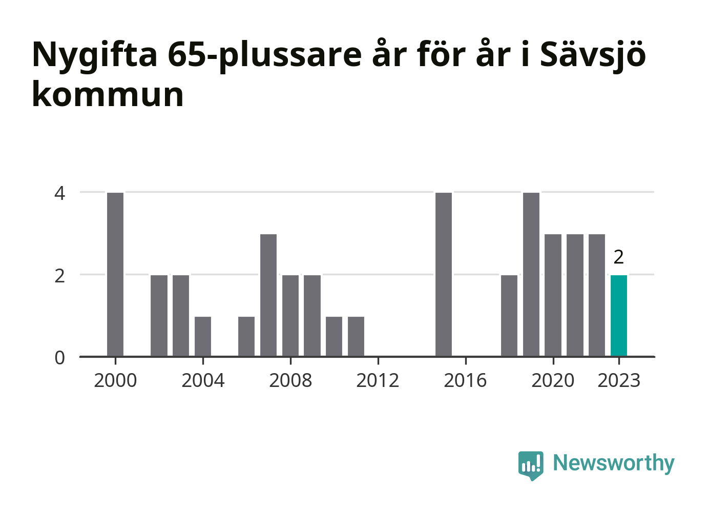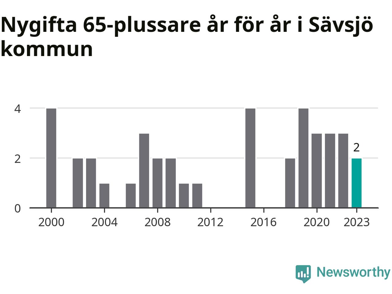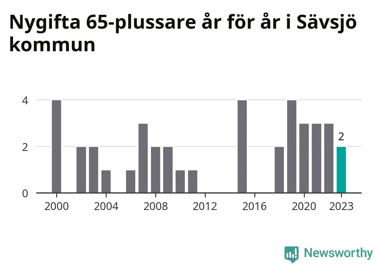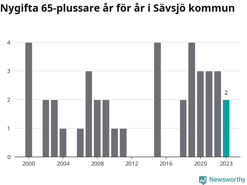 Bröllop bland 65-plussare har ökat markant i Sverige de senaste 25 åren. Men i Sävsjö har bröllopsyran bland de äldre inte varit lika tydlig. Under 00-talet gifte sig 17 Sävsjöbor efter 65-årsdagen, vilket ökade till 21 personer under det senaste decenniet. Förra året gifte sig två personer över 65 år i Sävsjö, att jämföra med det totala antalet på 78 personer som gifte sig i kommunen under samma period. Sävsjö är en av de platser där seniorer som slår sina påsar ihop har ökat minst.