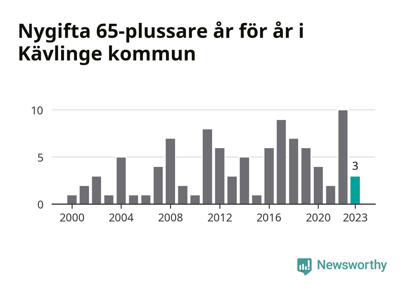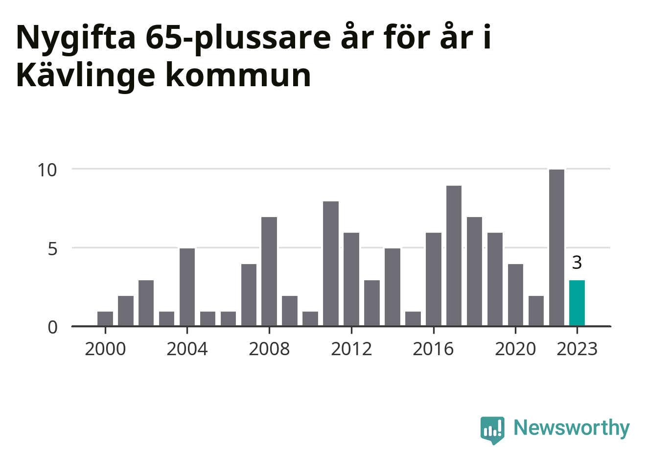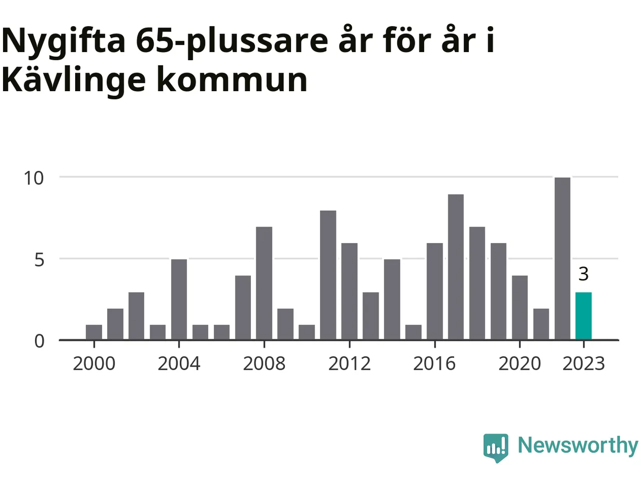 Bröllop bland 65-plussare har ökat markant i Sverige de senaste 25 åren. I Kävlinge har antalet nygifta seniorer ökat från 27 under 00-talet till 53 senaste decenniet.