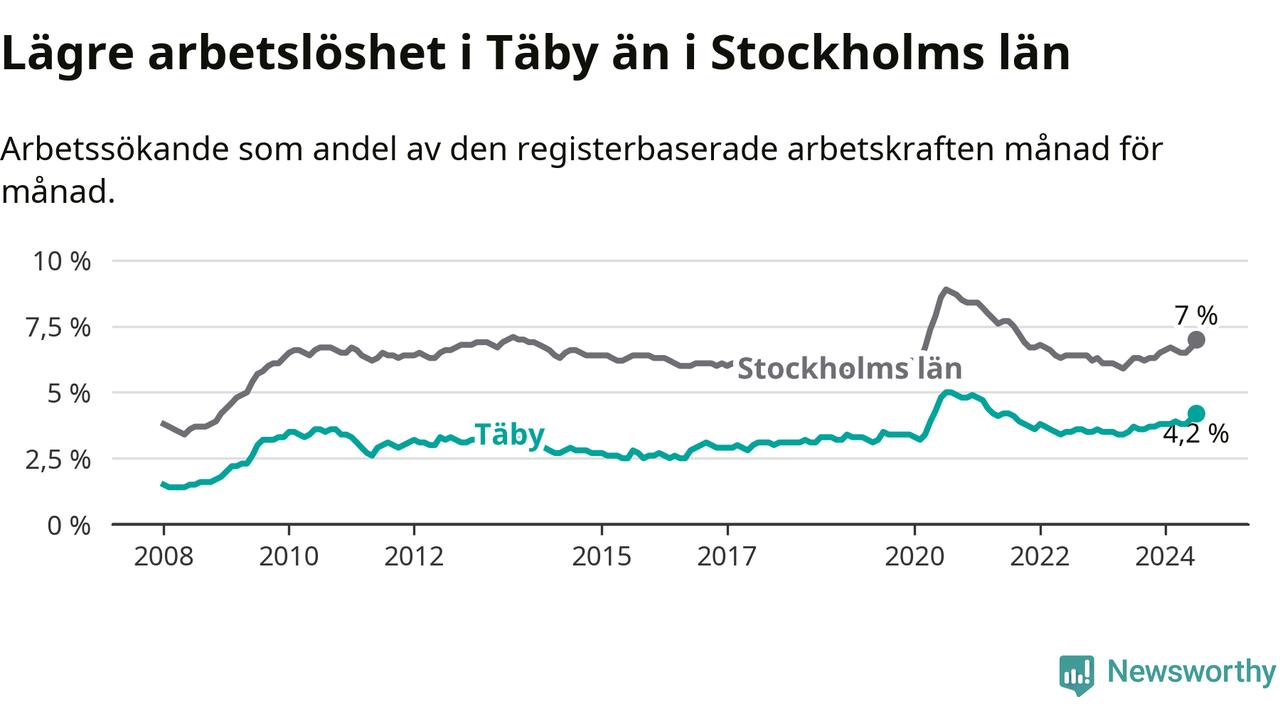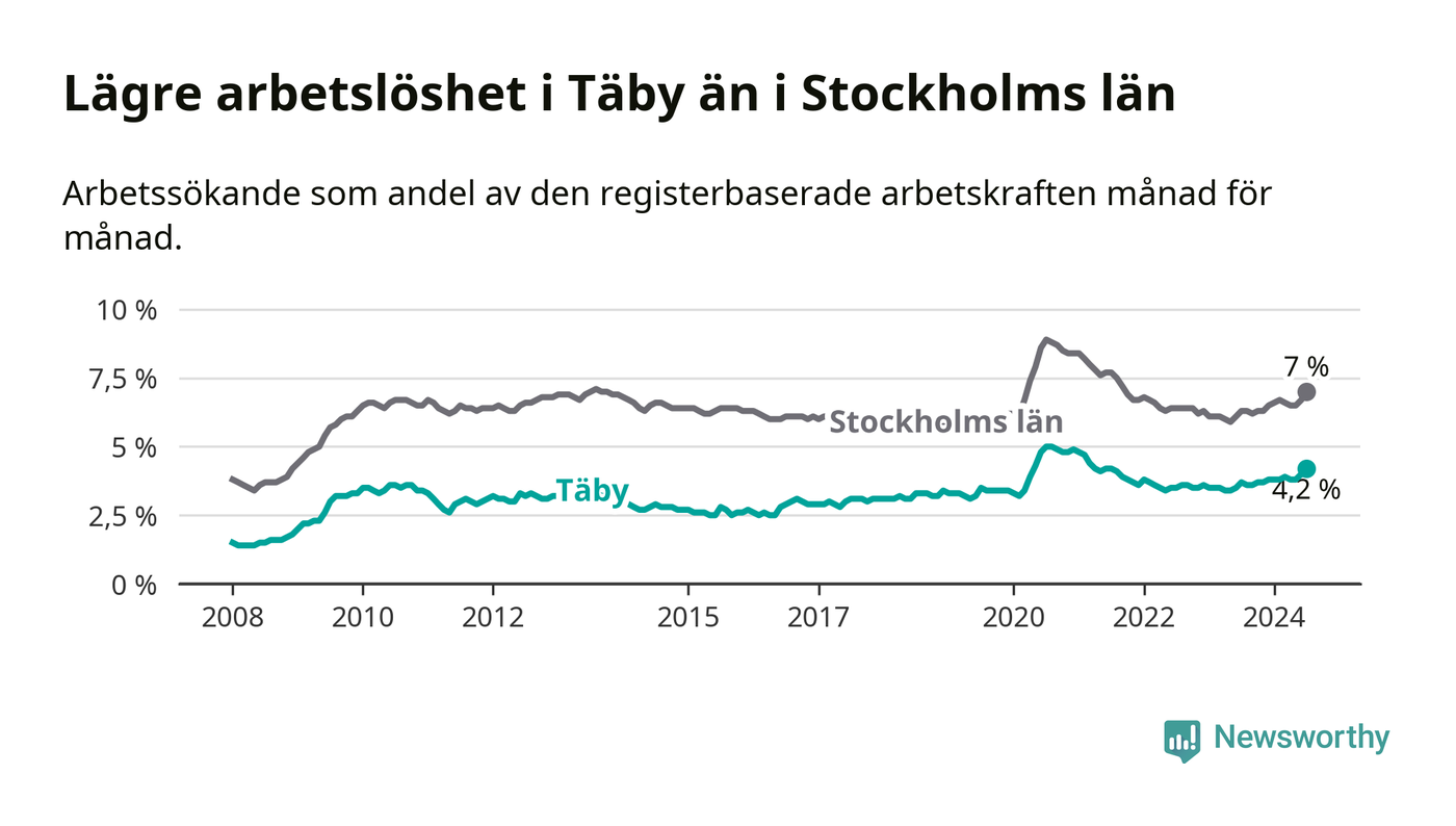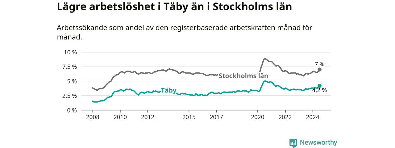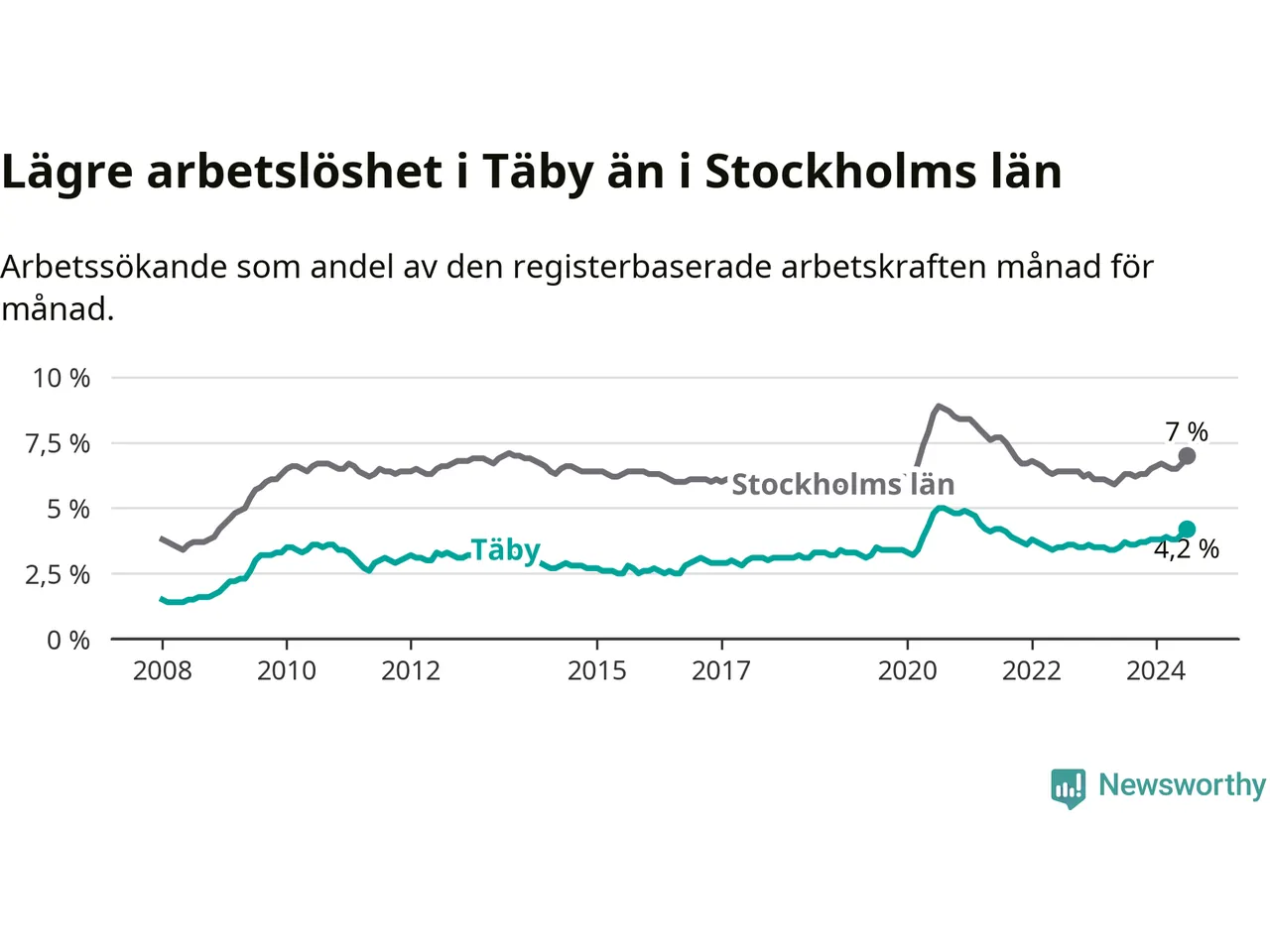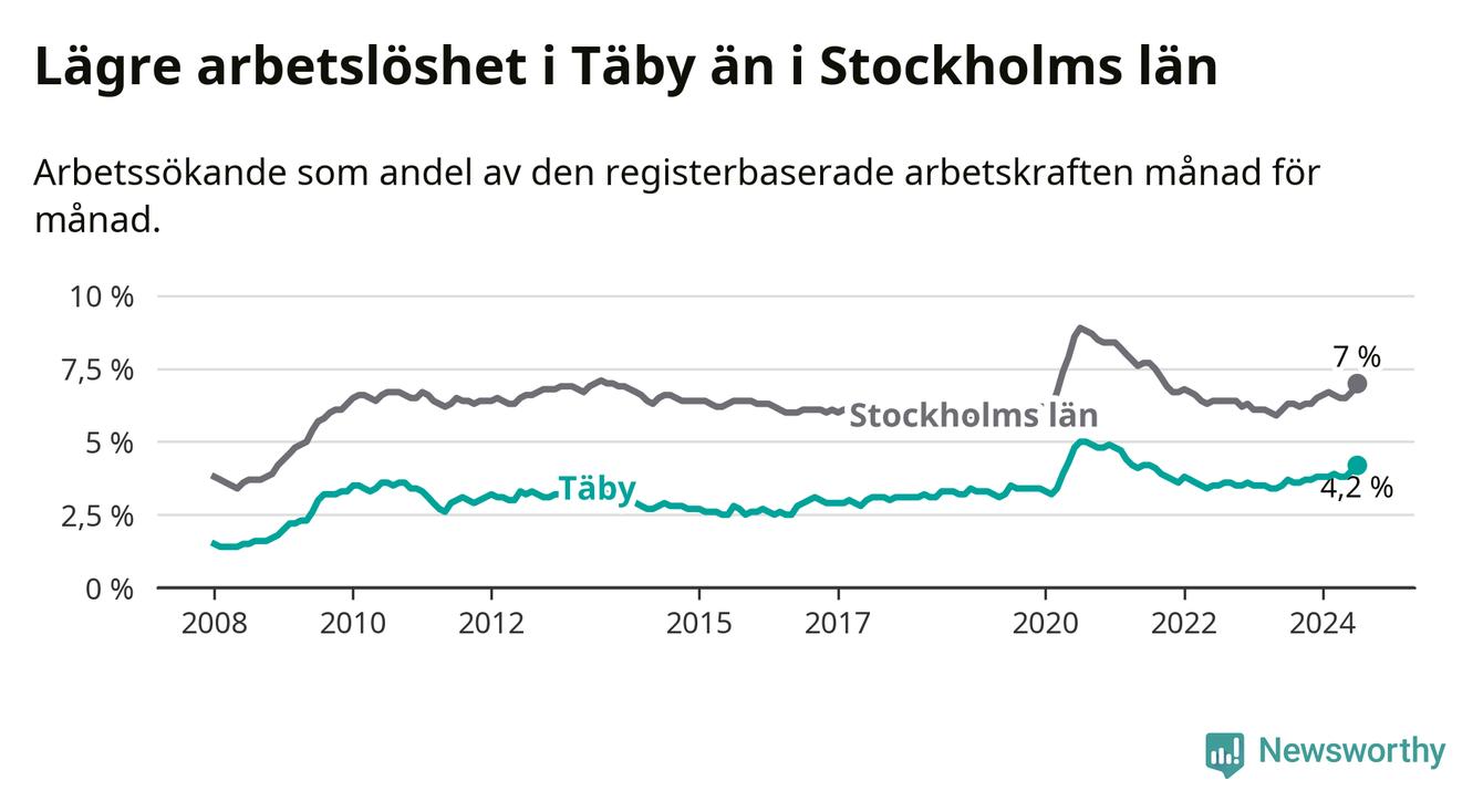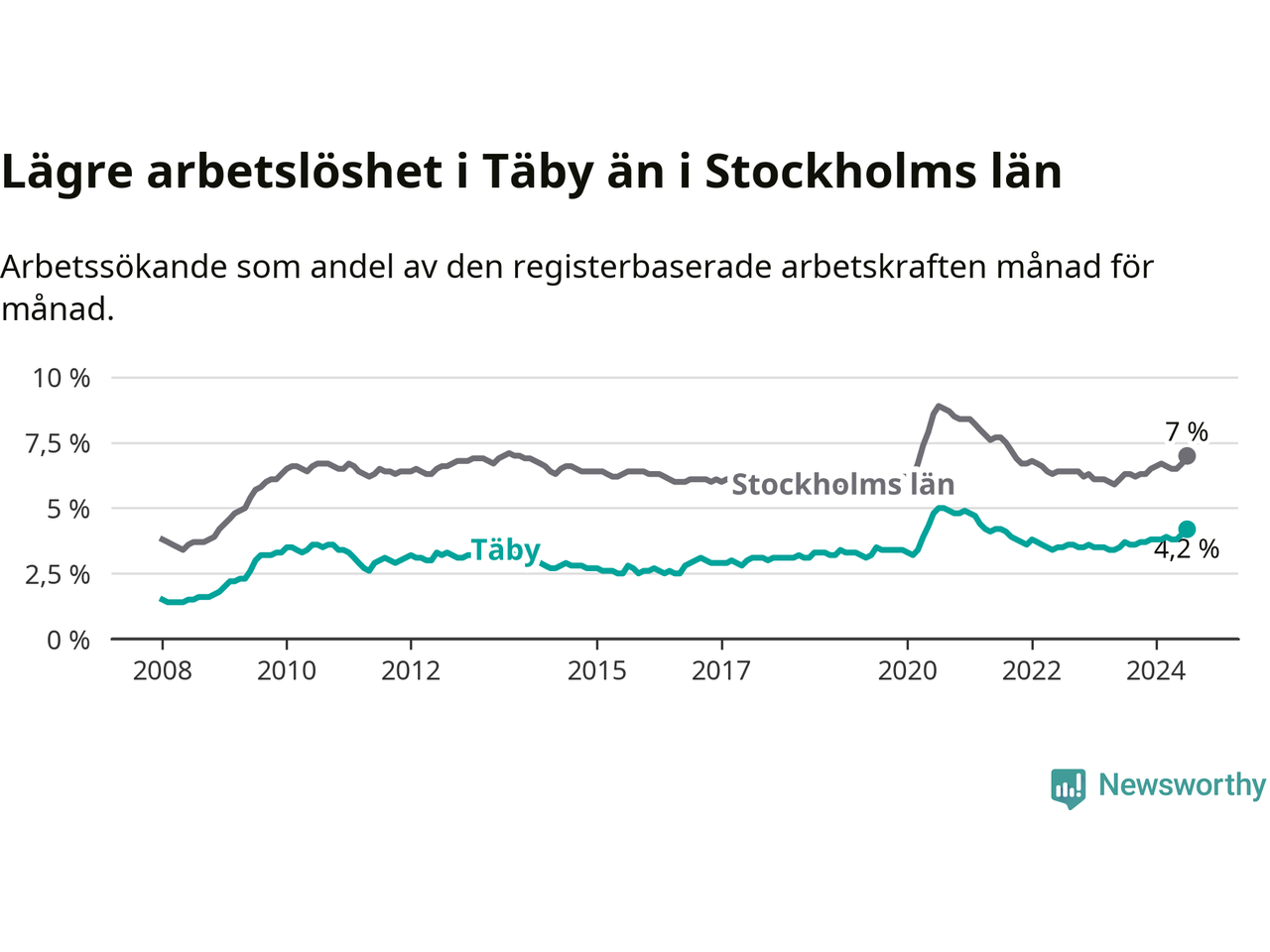 Även om arbetslösheten i Täby alltså ökar, så ligger den fortfarande under snittet i hela Stockholms län (4,2 procent i kommunen, jämfört med 7,0 procent i hela länet). Ekerö har den lägsta arbetslösheten i länet (3,5 procent), medan Södertälje har den högsta (11,0 procent). För att Täby skulle komma ner i samma arbetslöshetsnivå som Ekerö skulle 270 personer behöva sysselsättas.