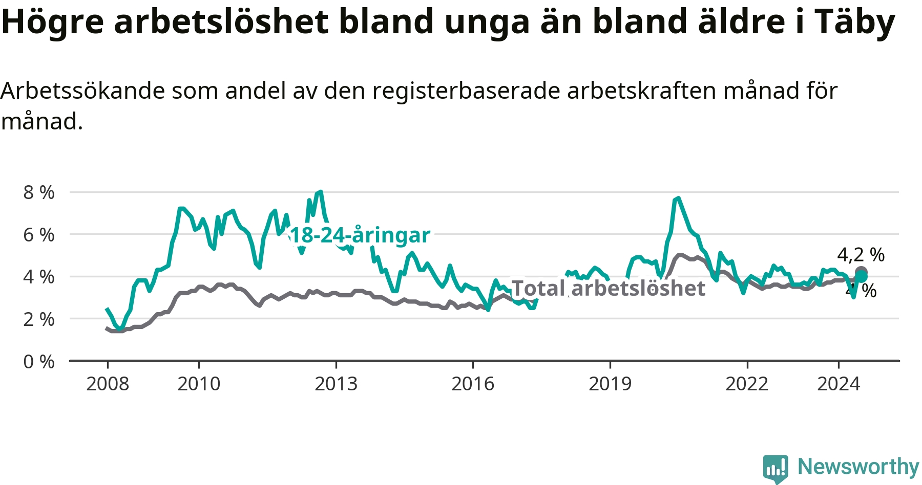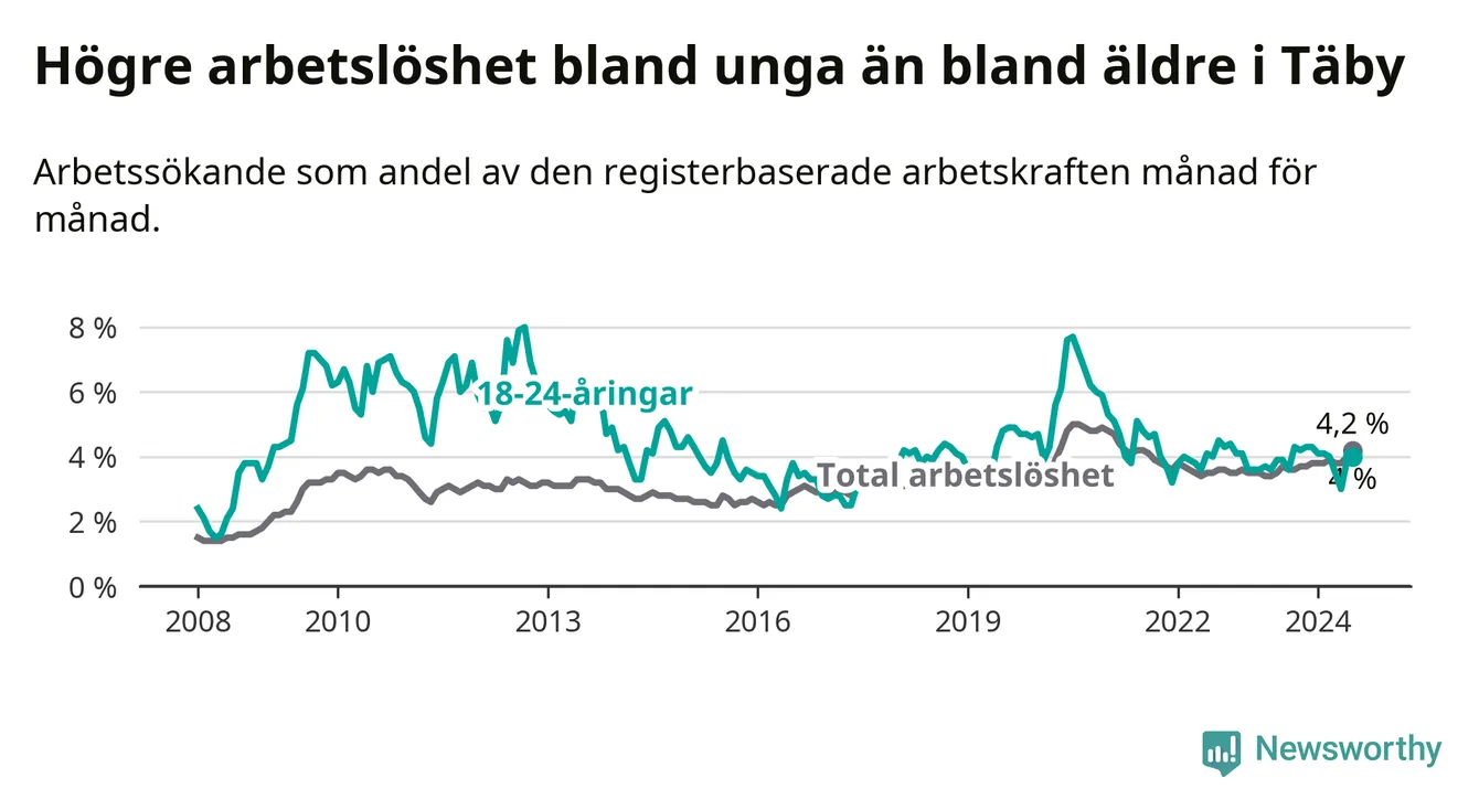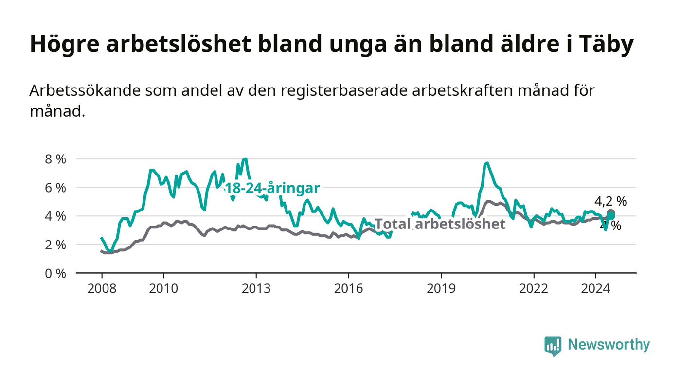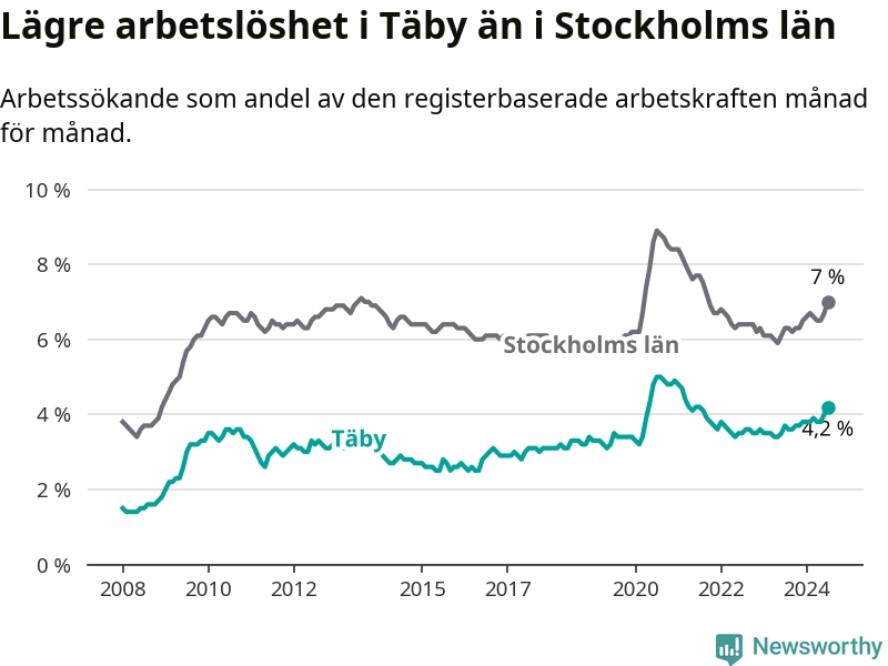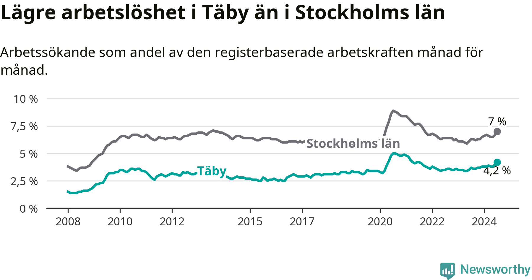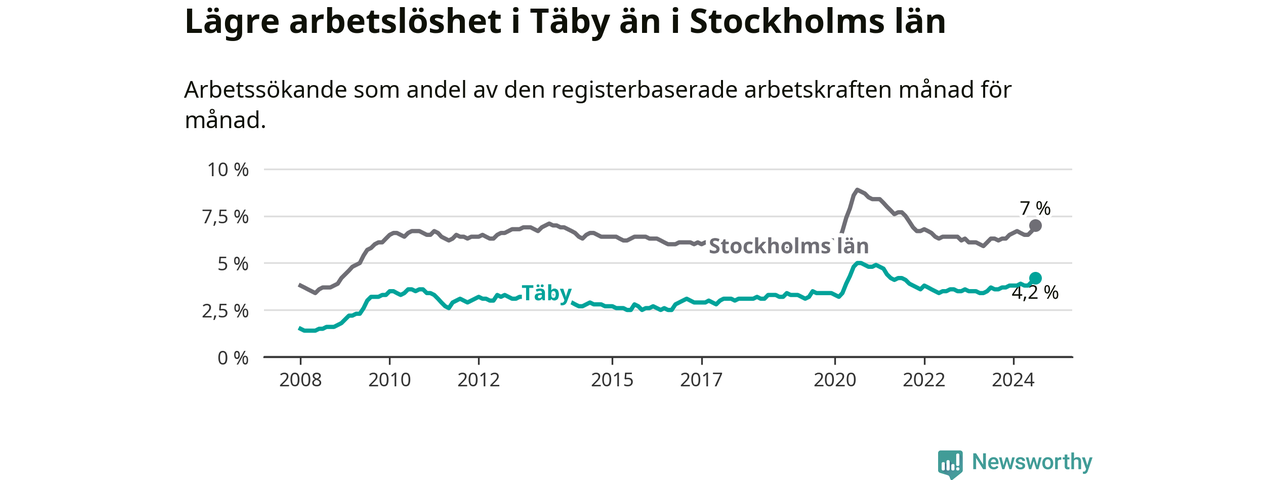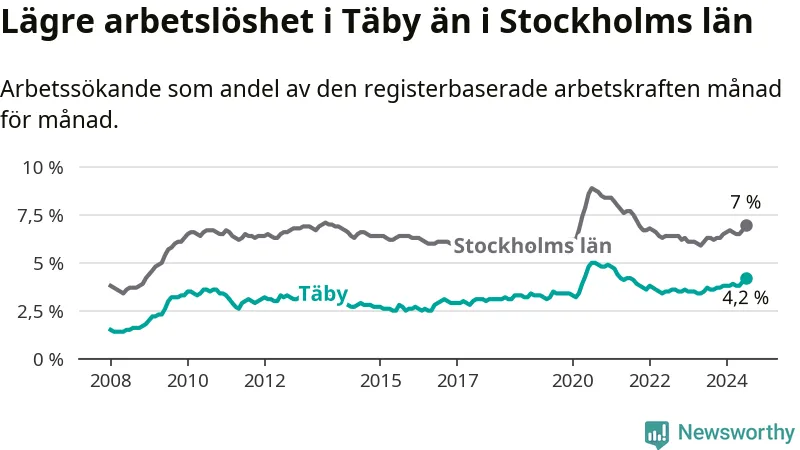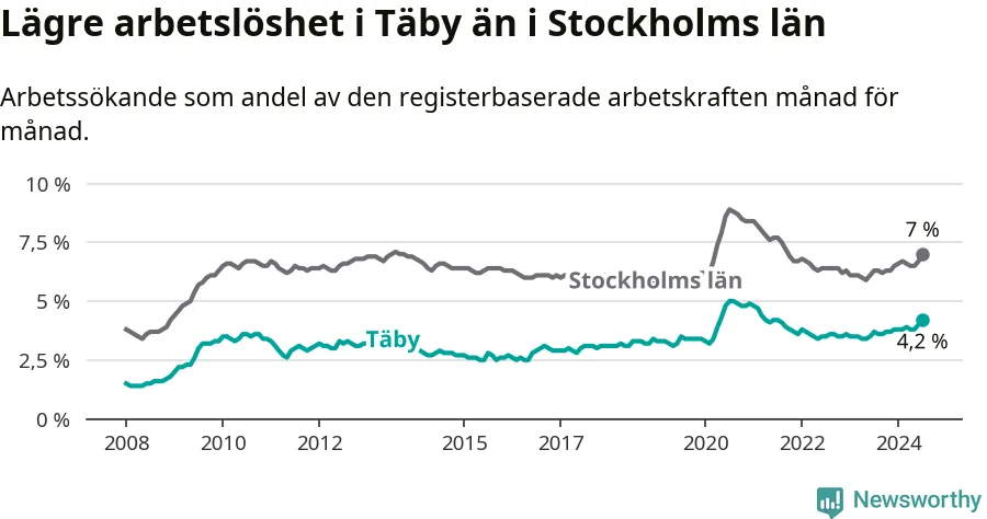 Även om arbetslösheten i Täby alltså ökar, så ligger den fortfarande under snittet i hela Stockholms län (4,2 procent i kommunen, jämfört med 7,0 procent i hela länet). Ekerö har den lägsta arbetslösheten i länet (3,5 procent), medan Södertälje har den högsta (11,0 procent). För att Täby skulle komma ner i samma arbetslöshetsnivå som Ekerö skulle 270 personer behöva sysselsättas.
