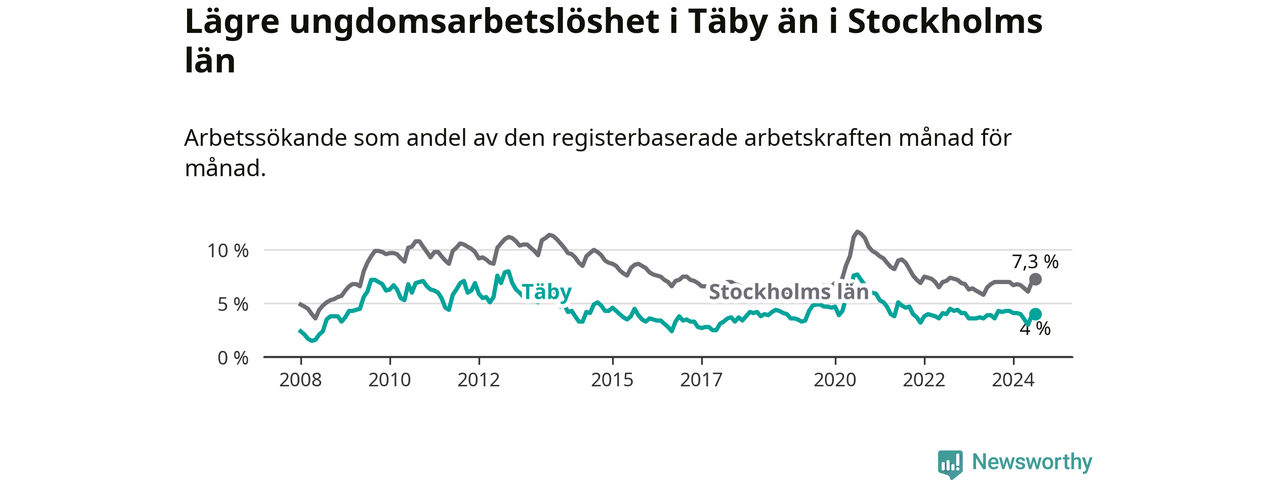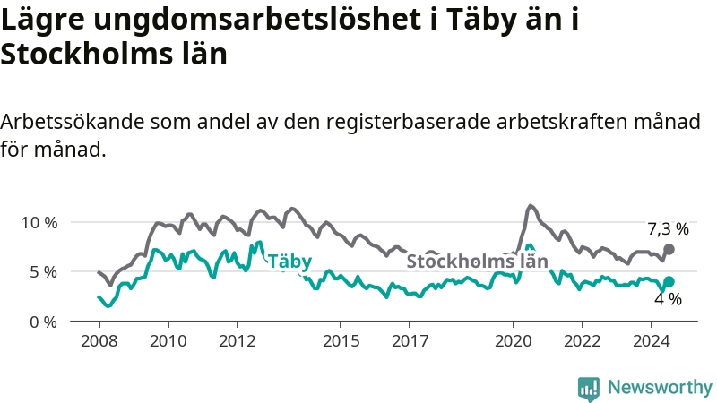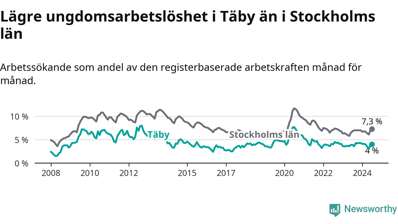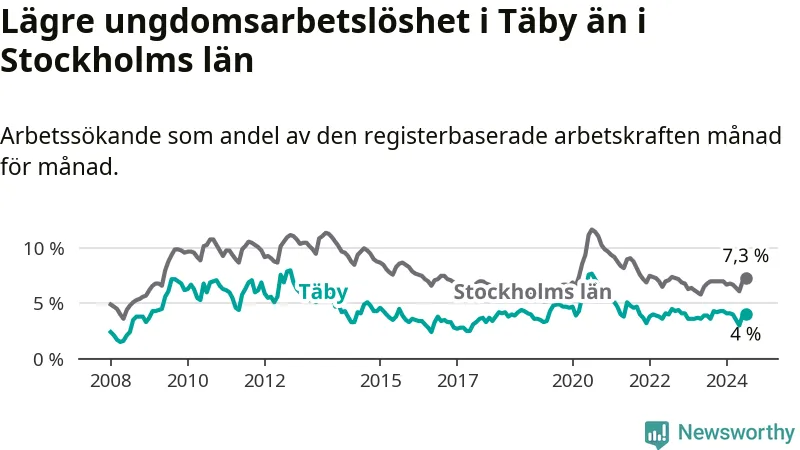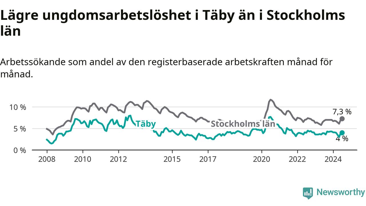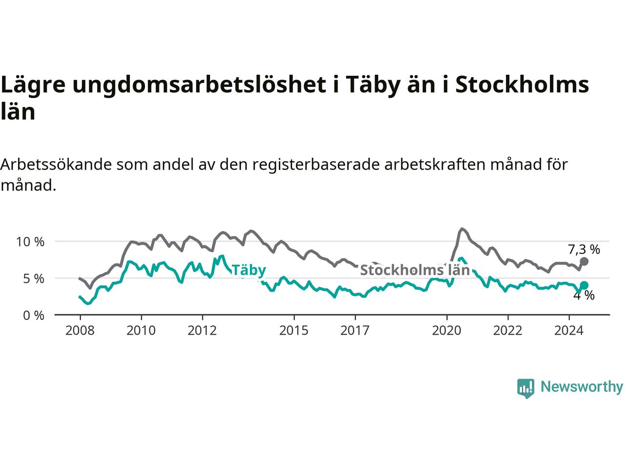 Precis som den totala arbetslösheten ligger ungdomsarbetslösheten i Täby lägre än i Stockholms län som helhet. Skillnaden mellan kommunen och länet är 3,3 procentenheter.