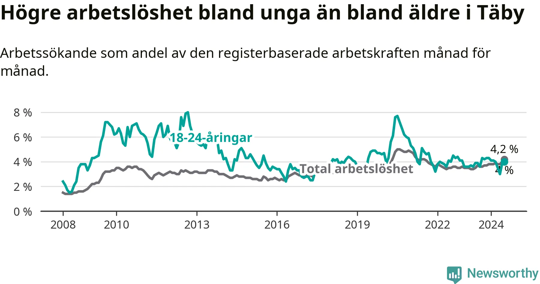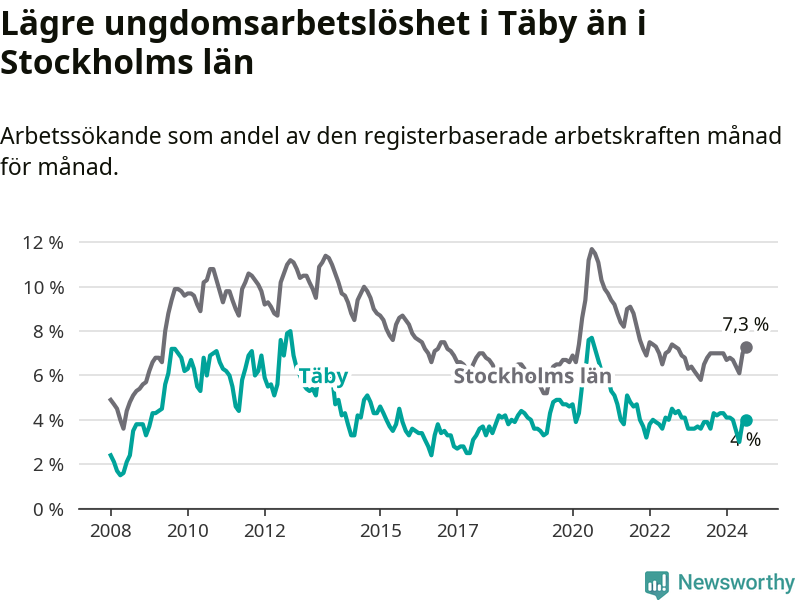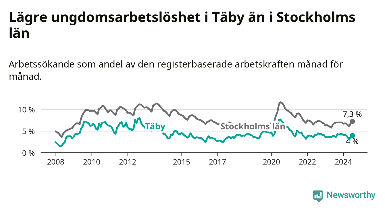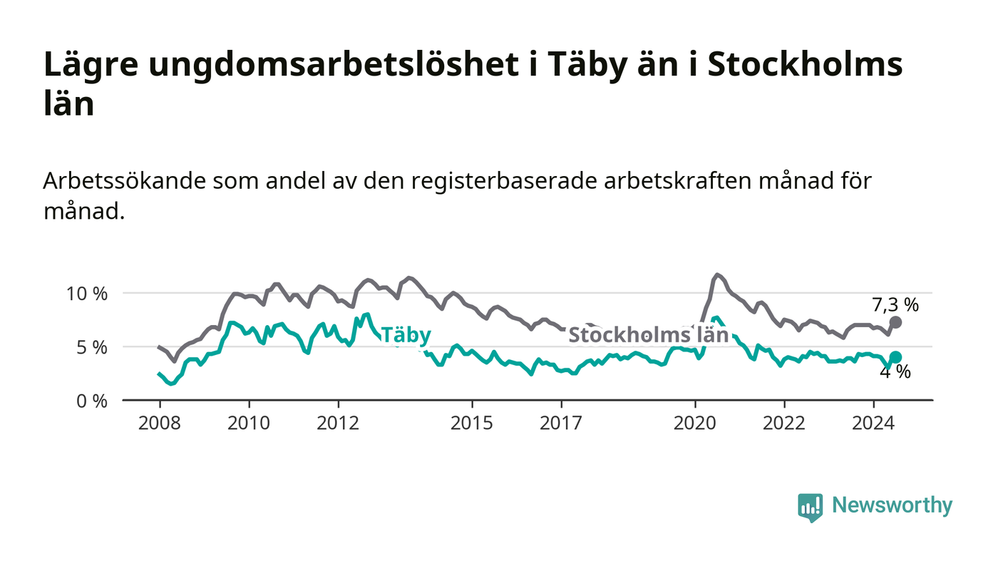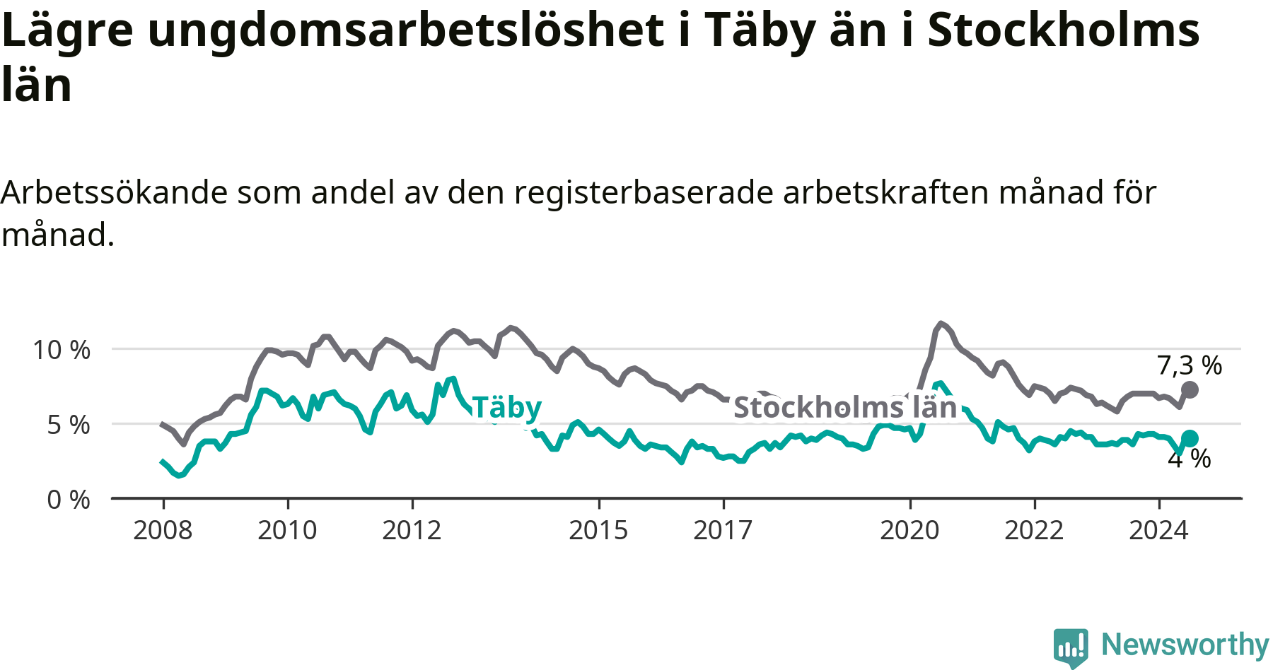 Precis som den totala arbetslösheten ligger ungdomsarbetslösheten i Täby lägre än i Stockholms län som helhet. Skillnaden mellan kommunen och länet är 3,3 procentenheter.