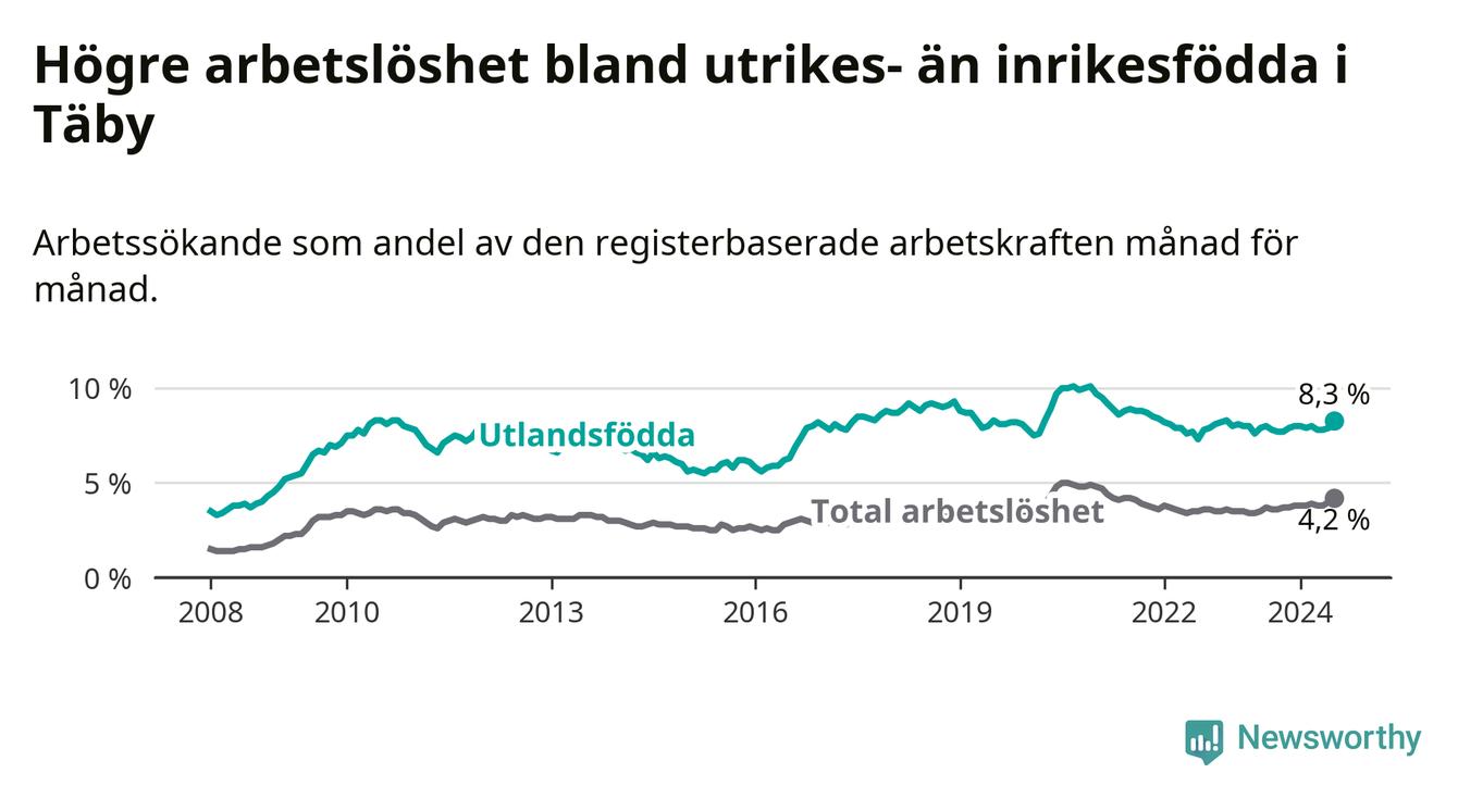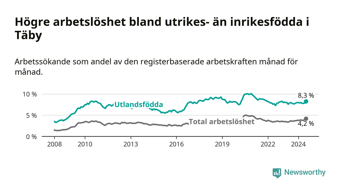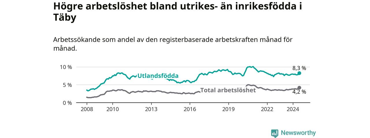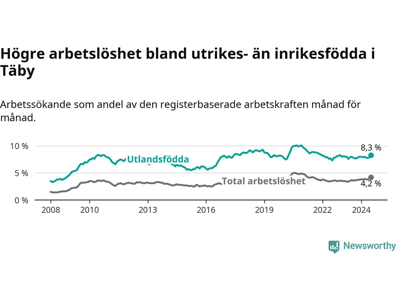 Arbetslösheten bland utlandsfödda var 8,3 procent i Täby under juli månad, motsvarande 743 av 8 952 personer. Det är 0,3 procentenheter fler än vid samma tidpunkt i fjol (−603 om man räknar personer). Den senaste månadens uppgång innebär ett trendbrott. Under de ett föregående månaderna hade arbetslösheten bland utlandsfödda varit lägre än motsvarande tidpunkt året innan.