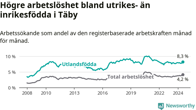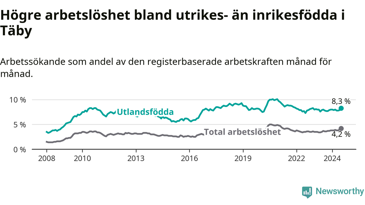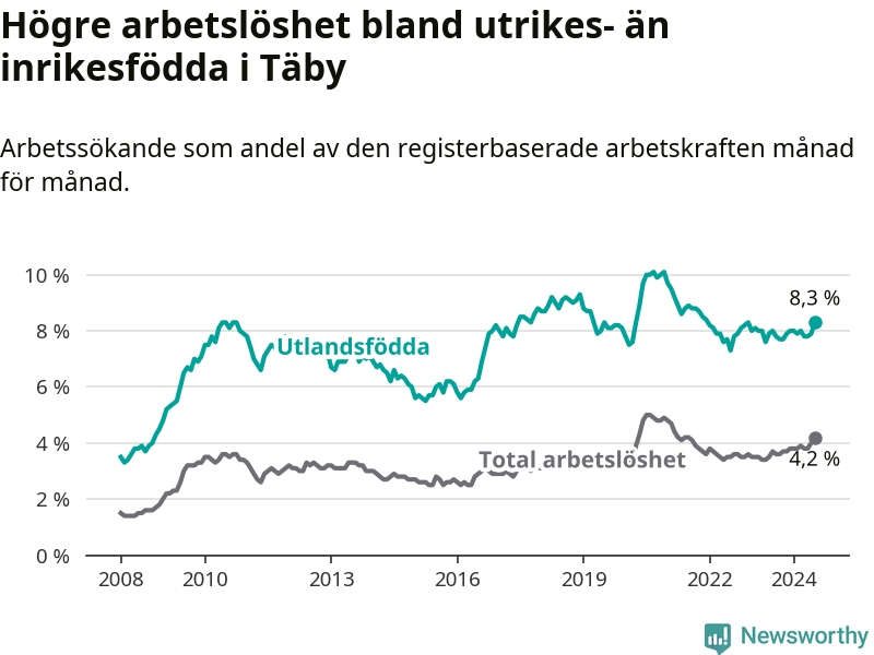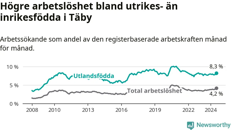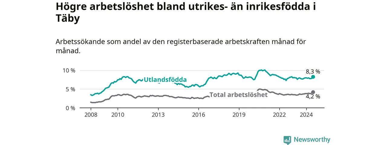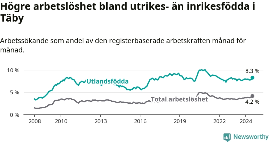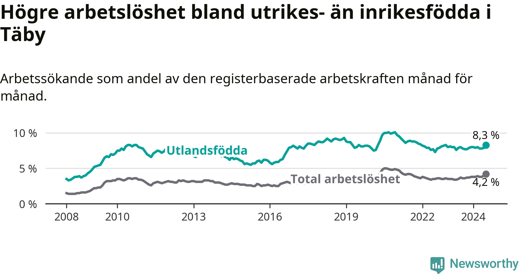 Arbetslösheten bland utlandsfödda var 8,3 procent i Täby under juli månad, motsvarande 743 av 8 952 personer. Det är 0,3 procentenheter fler än vid samma tidpunkt i fjol (−603 om man räknar personer). Den senaste månadens uppgång innebär ett trendbrott. Under de ett föregående månaderna hade arbetslösheten bland utlandsfödda varit lägre än motsvarande tidpunkt året innan.