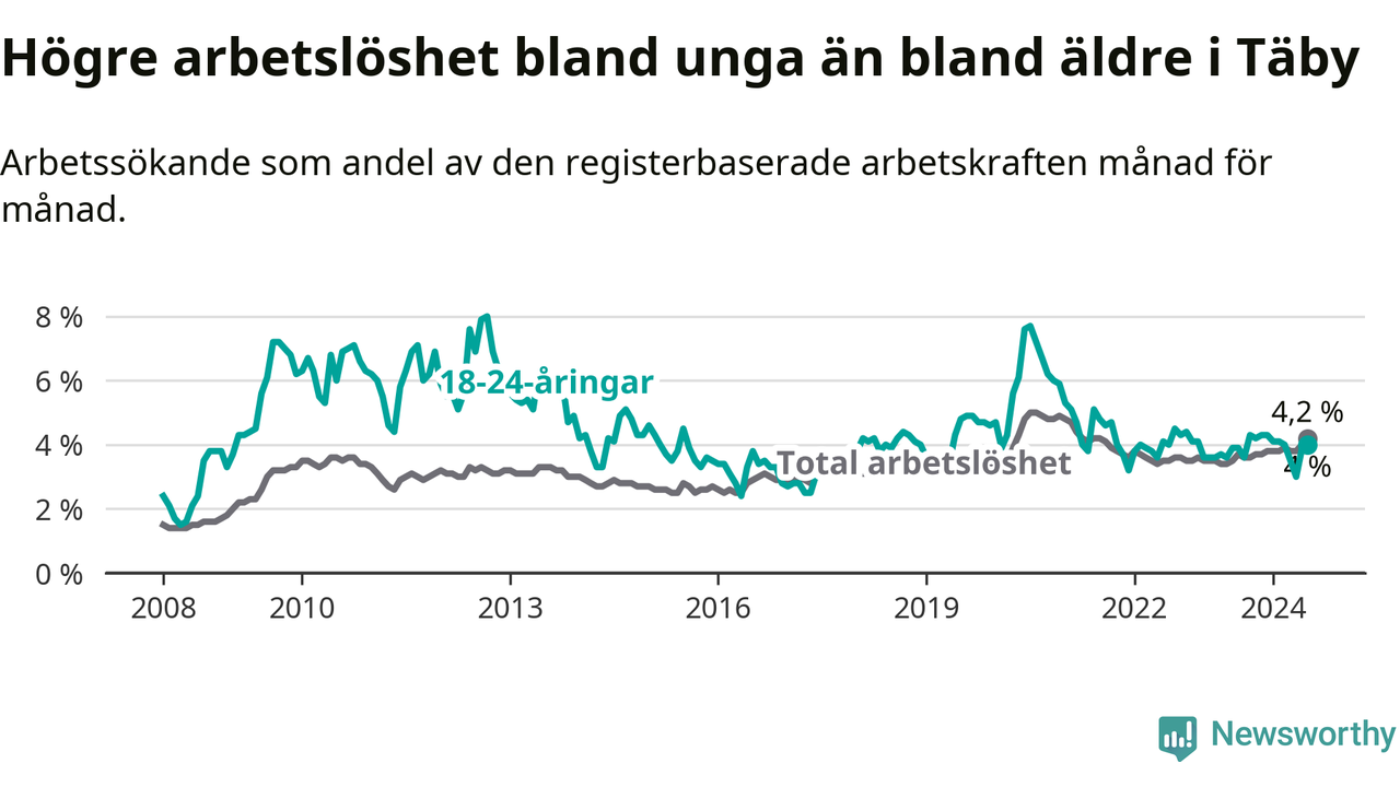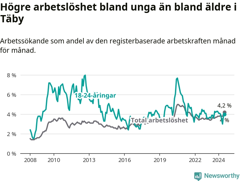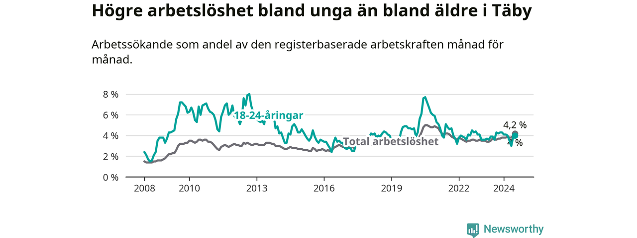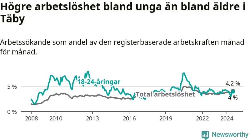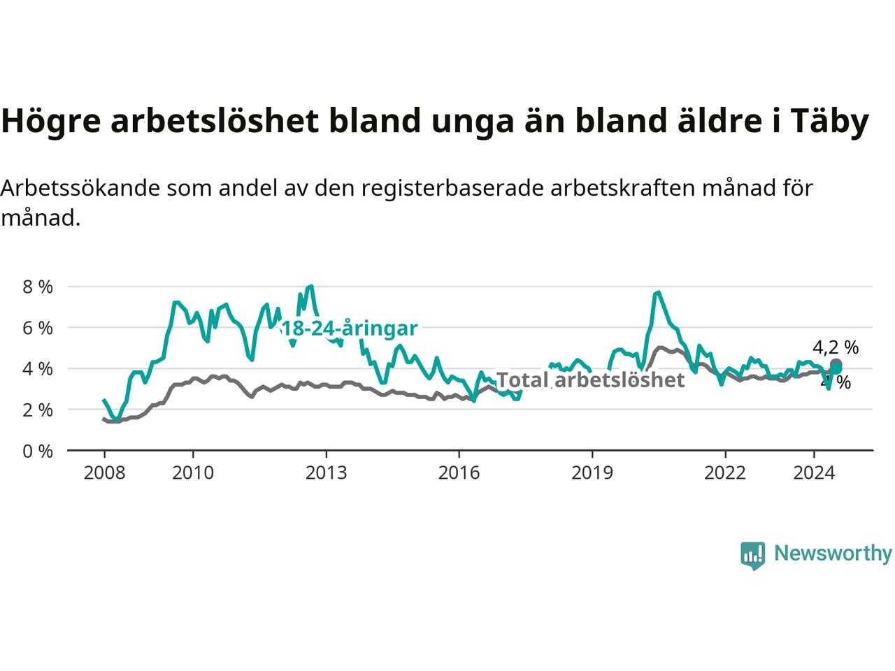 Under juli månad rapporterade Täby kommun en total arbetslöshet på 4,2 procent. Det är en ökning jämfört med samma tidpunkt i fjol (+0,5 procentenheter). Även i Stockholms län stiger arbetslösheten .