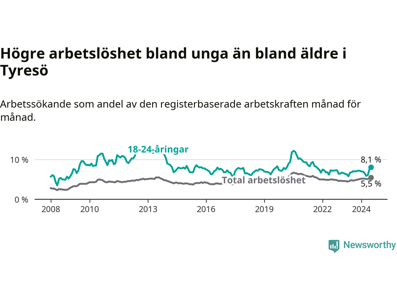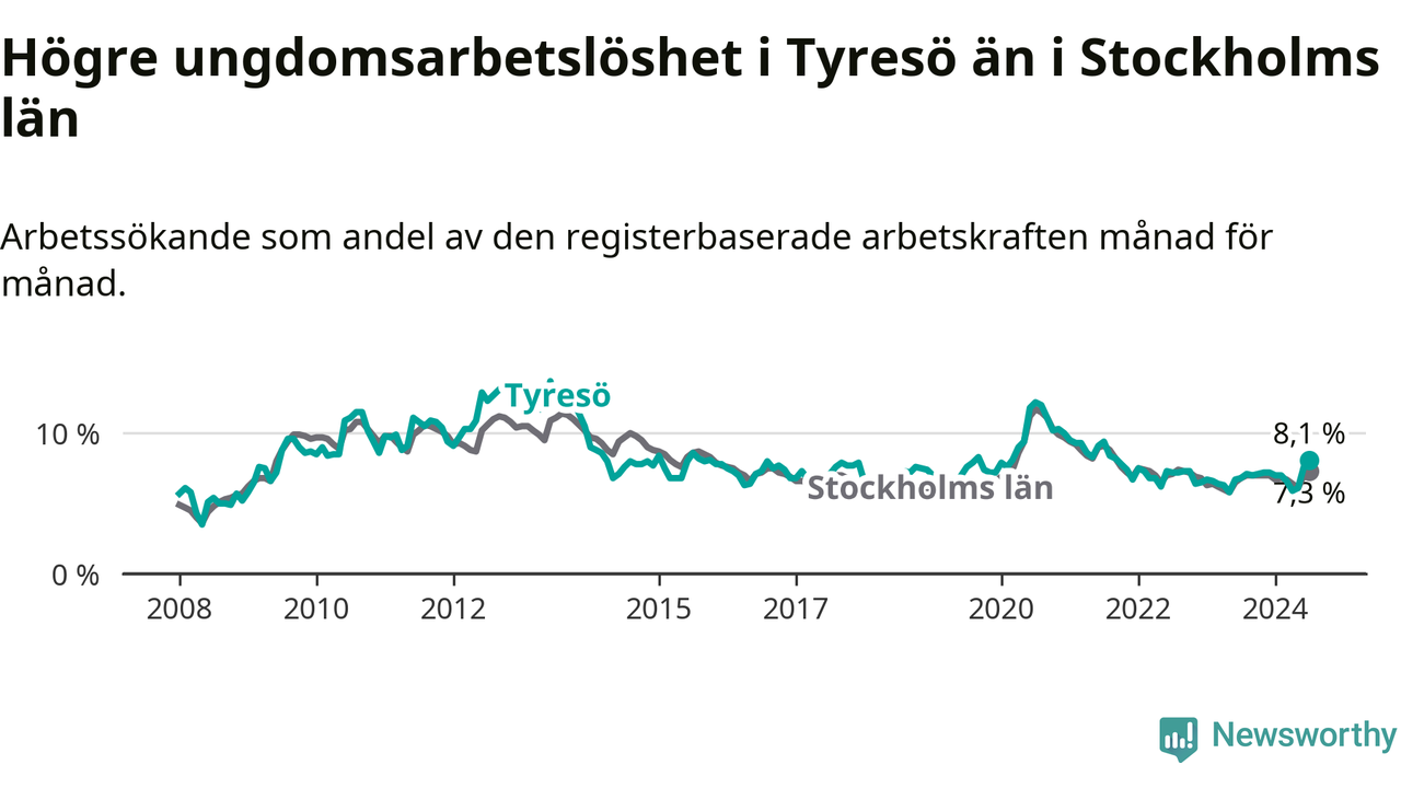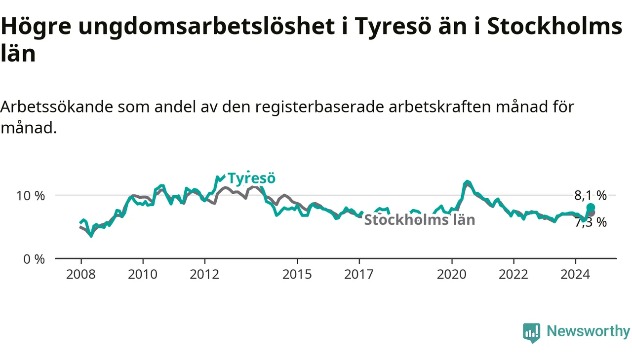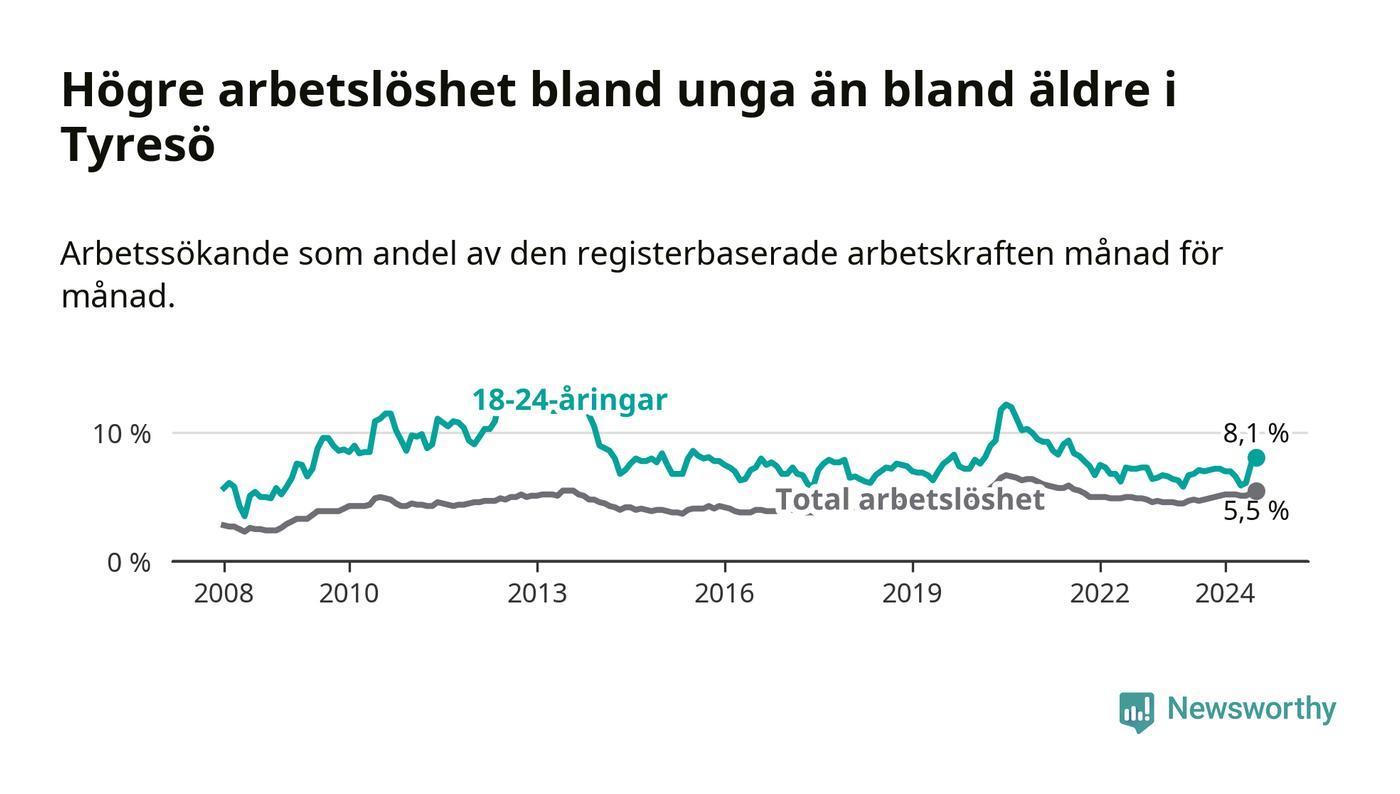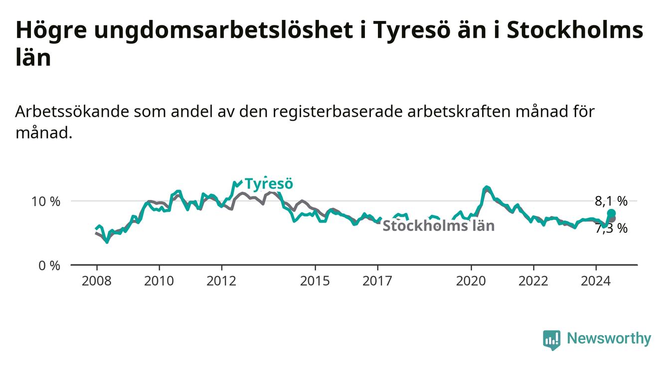 Medan Tyresö har lägre total arbetslöshet än Stockholms län, ligger ungdomsarbetslösheten 0,8 procentenheter högre i Tyresö.