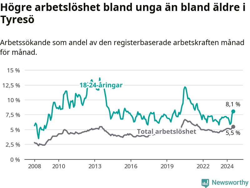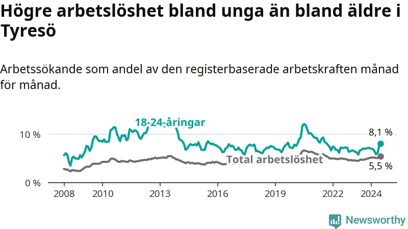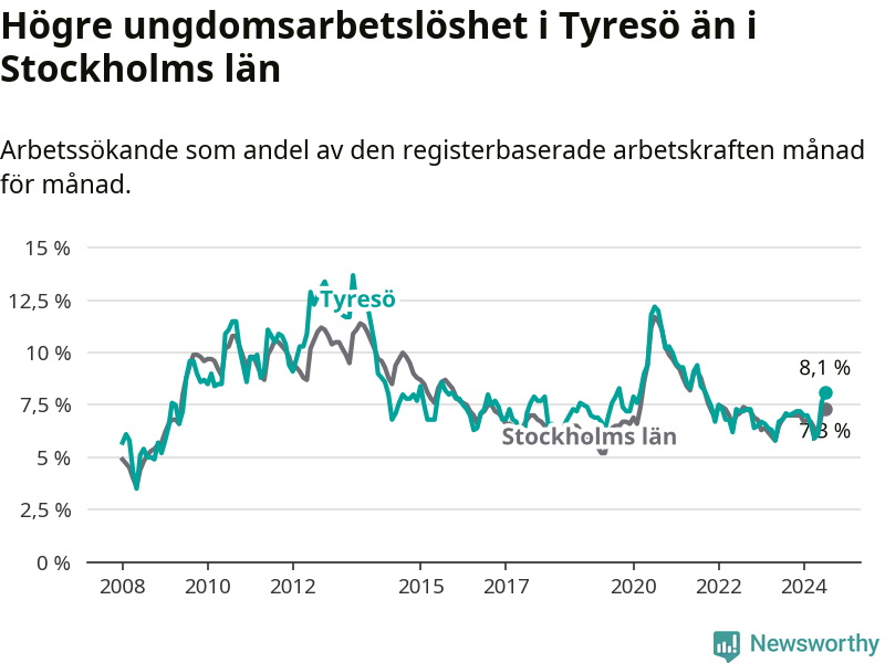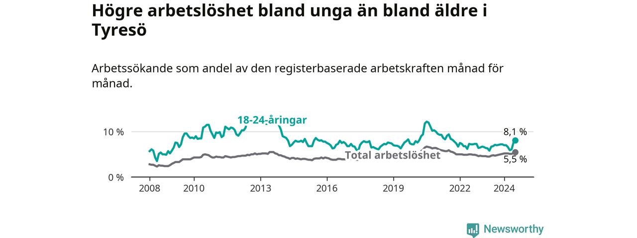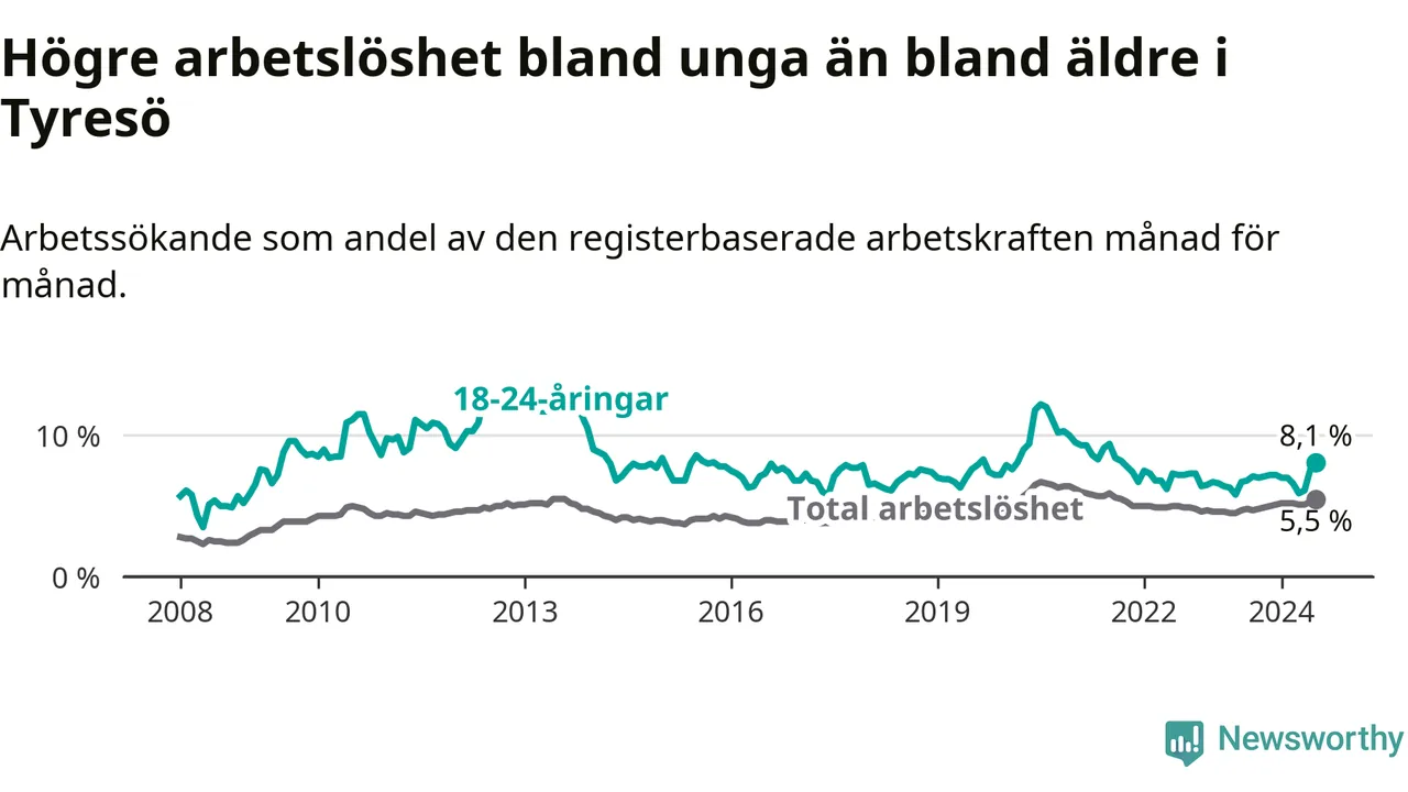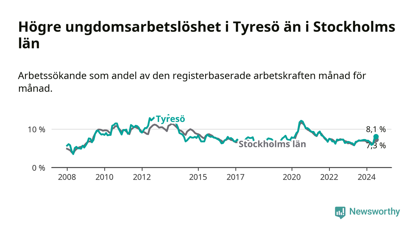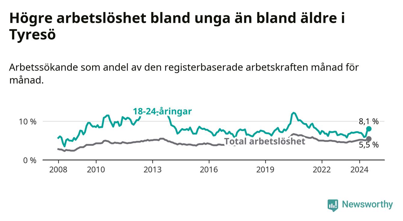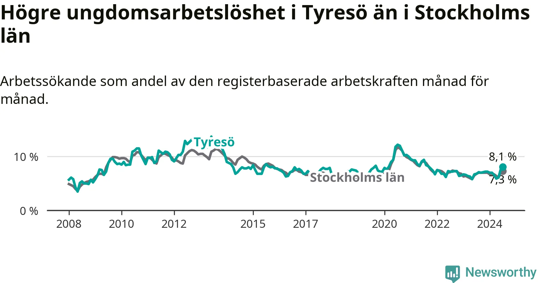 Medan Tyresö har lägre total arbetslöshet än Stockholms län, ligger ungdomsarbetslösheten 0,8 procentenheter högre i Tyresö.
