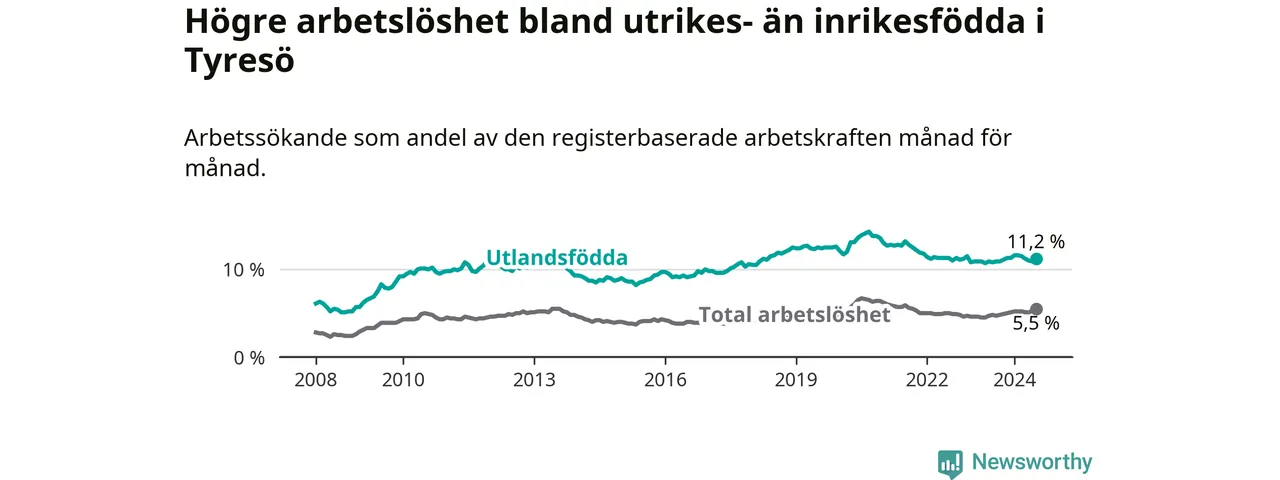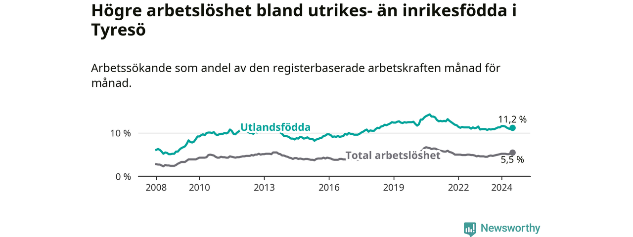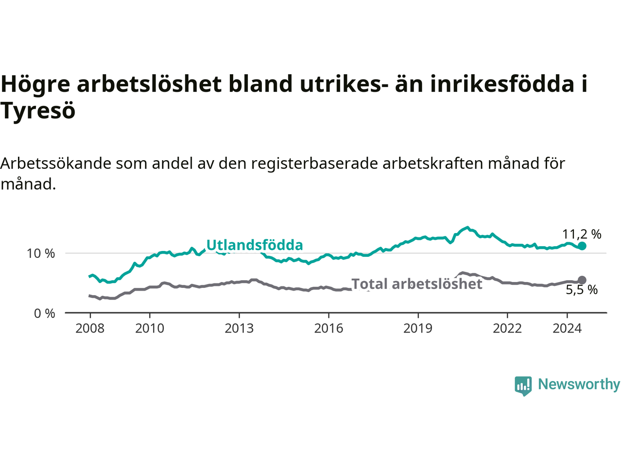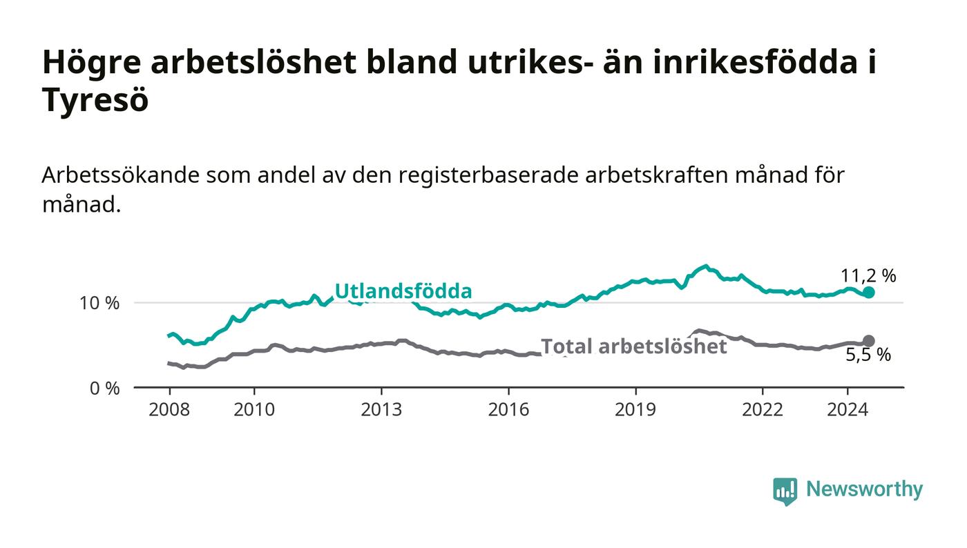 Arbetslösheten bland utlandsfödda var 11,2 procent i Tyresö under juli månad, motsvarande 579 av 5 170 personer. Det är 0,4 procentenheter fler än vid samma tidpunkt i fjol (−620 om man räknar personer). Den senaste månadens uppgång innebär ett trendbrott. Under de ett föregående månaderna hade arbetslösheten bland utlandsfödda varit lägre än motsvarande tidpunkt året innan.