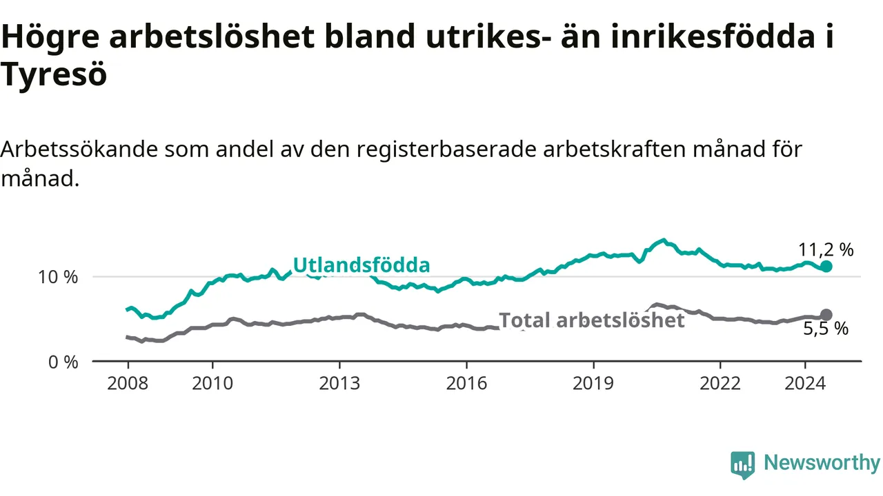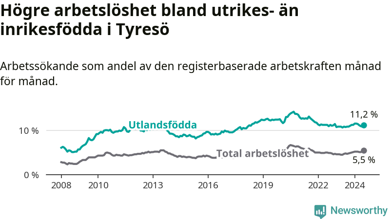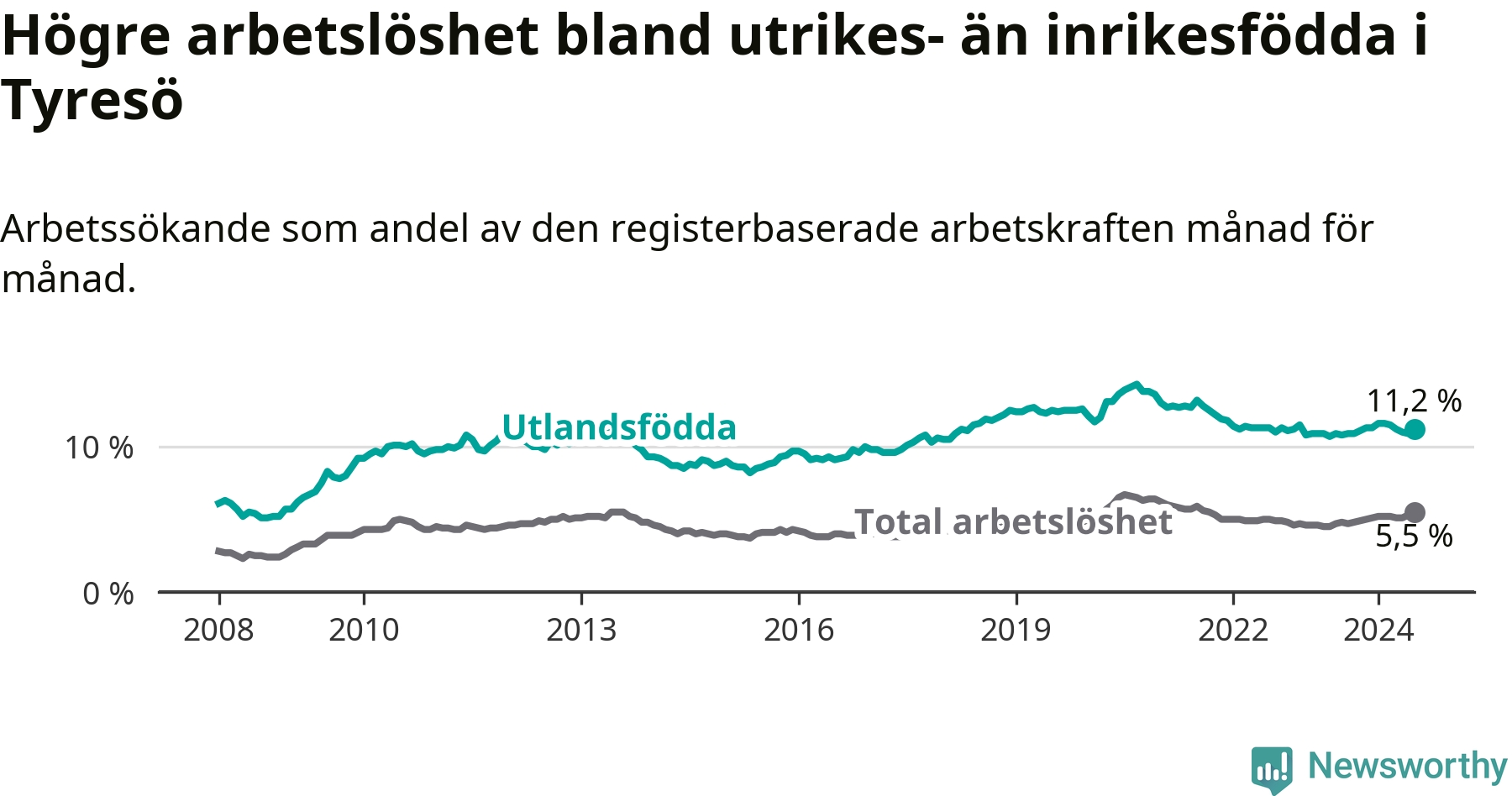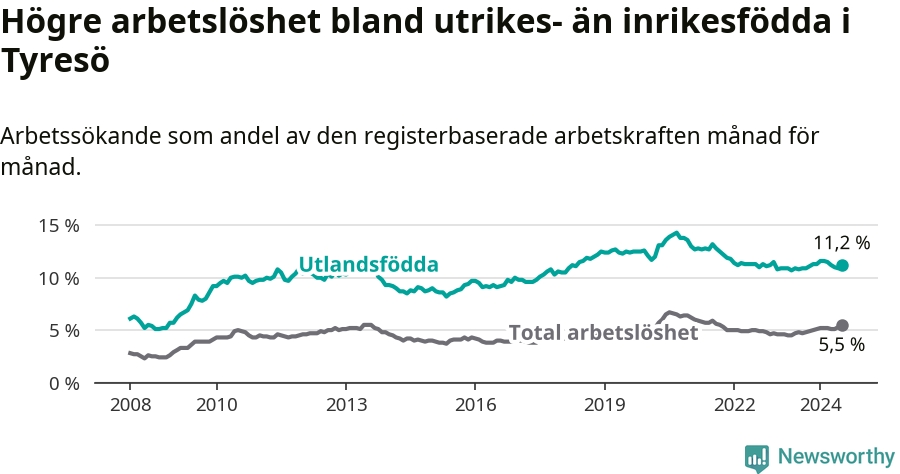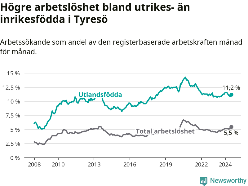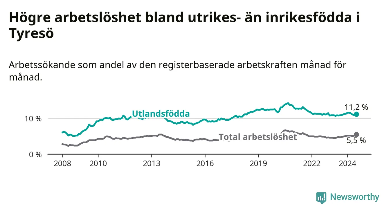 Arbetslösheten bland utlandsfödda var 11,2 procent i Tyresö under juli månad, motsvarande 579 av 5 170 personer. Det är 0,4 procentenheter fler än vid samma tidpunkt i fjol (−620 om man räknar personer). Den senaste månadens uppgång innebär ett trendbrott. Under de ett föregående månaderna hade arbetslösheten bland utlandsfödda varit lägre än motsvarande tidpunkt året innan.