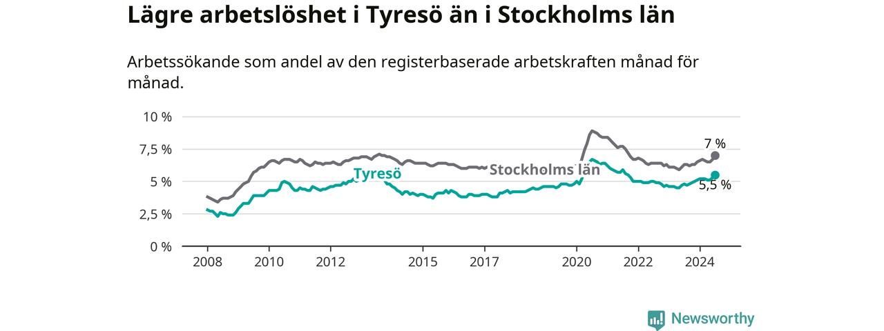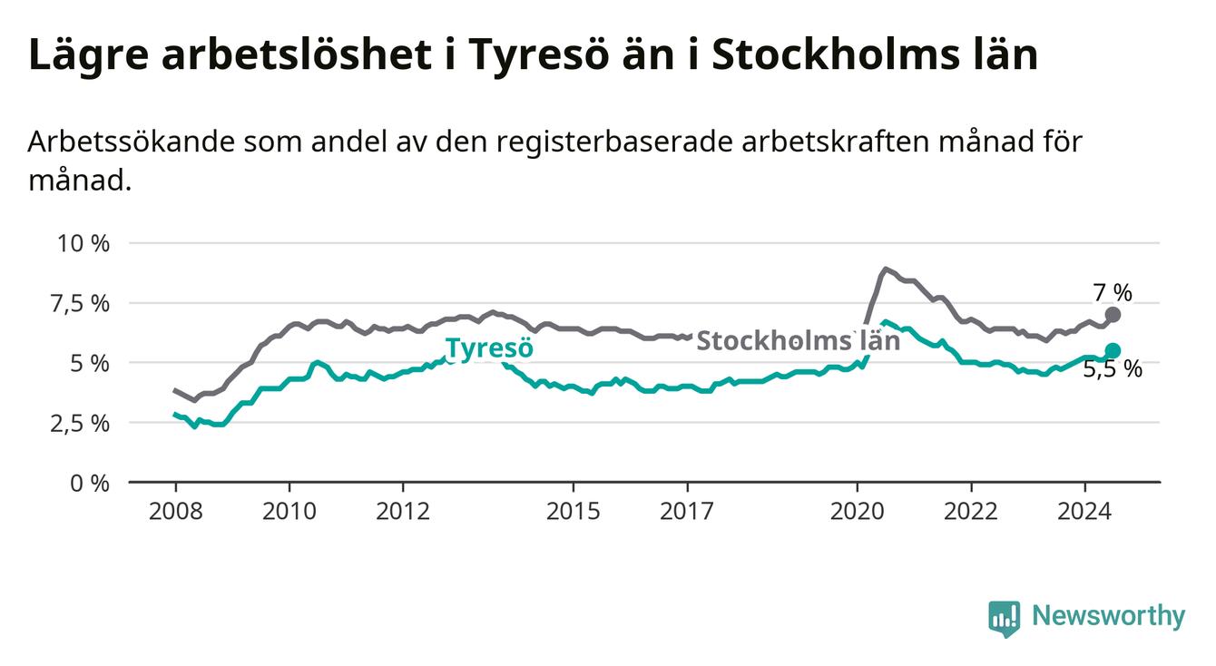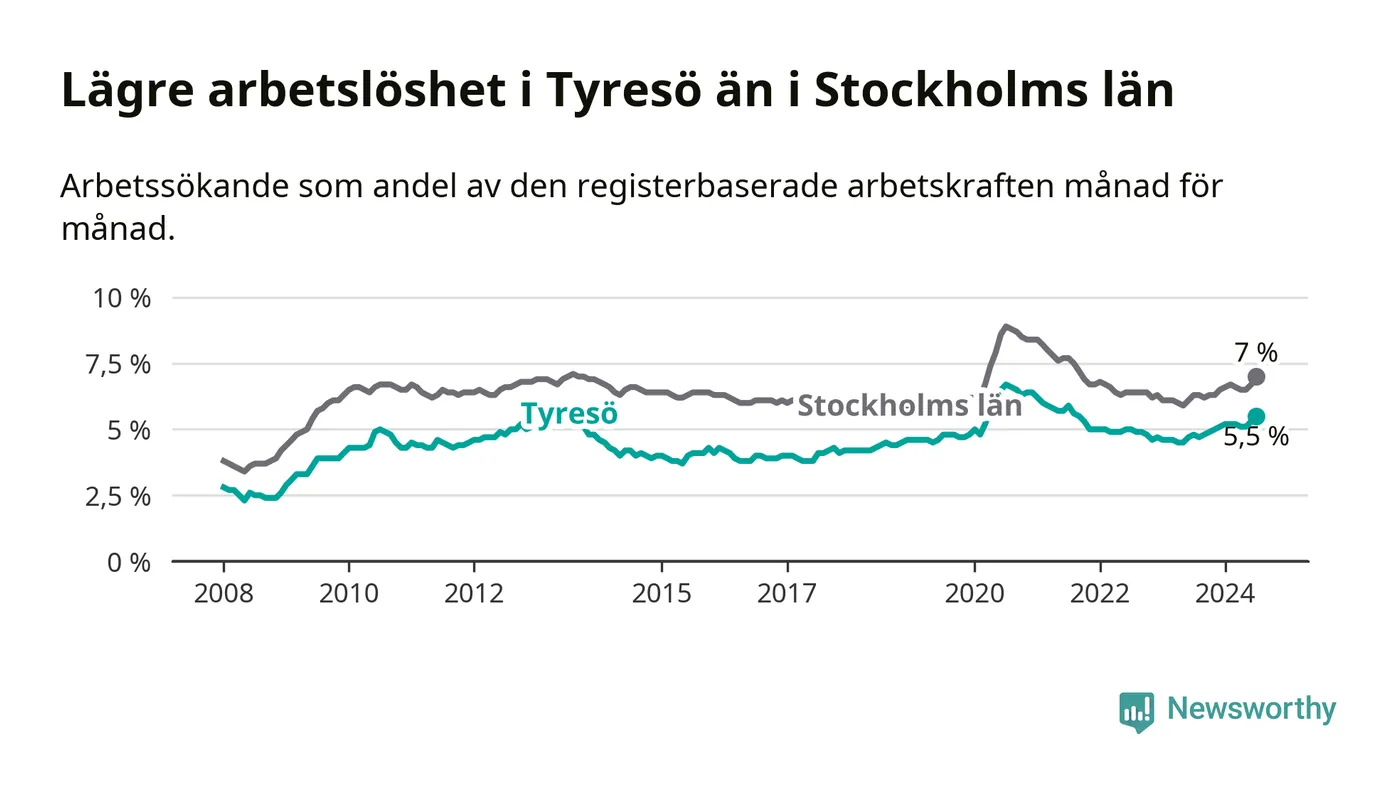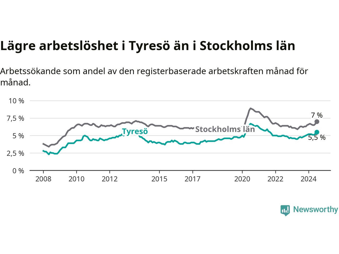 Även om arbetslösheten i Tyresö alltså ökar, så ligger den fortfarande under snittet i hela Stockholms län (5,5 procent i kommunen, jämfört med 7,0 procent i hela länet). Ekerö har den lägsta arbetslösheten i länet (3,5 procent), medan Södertälje har den högsta (11,0 procent). För att Tyresö skulle komma ner i samma arbetslöshetsnivå som Ekerö skulle 500 personer behöva sysselsättas.