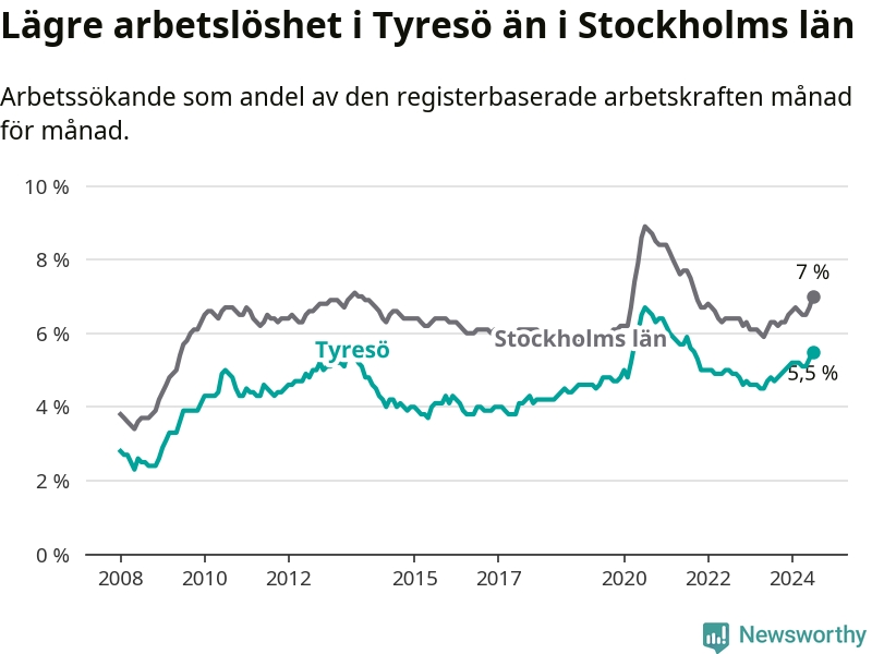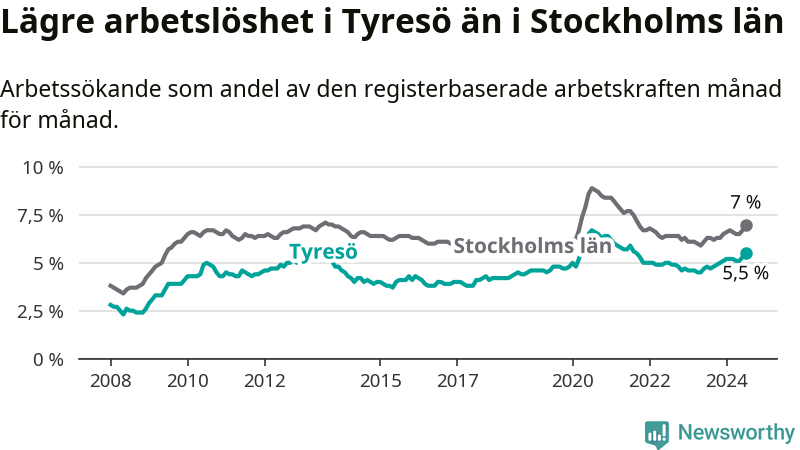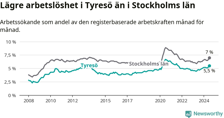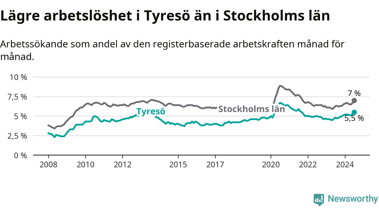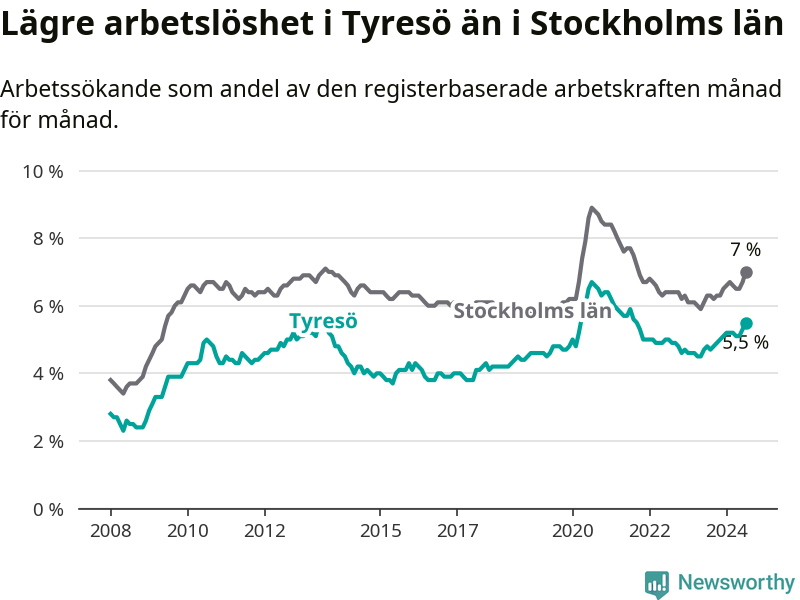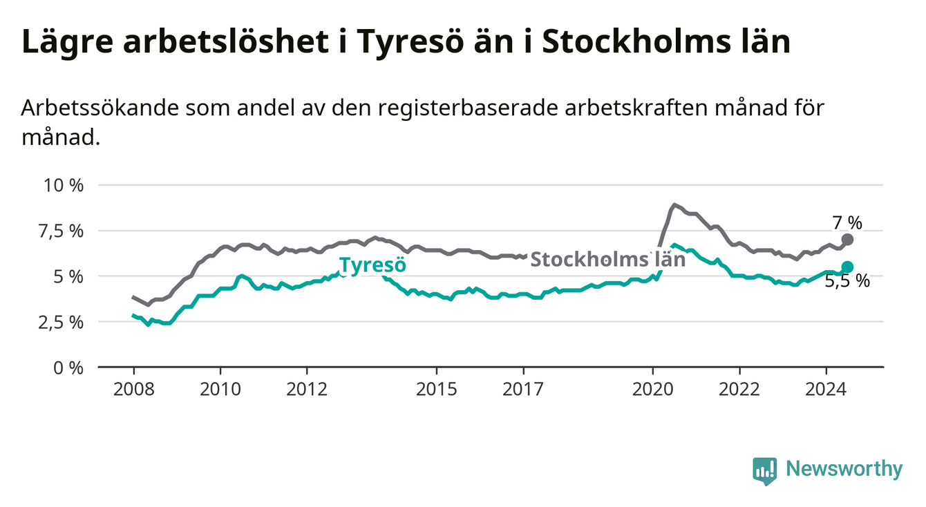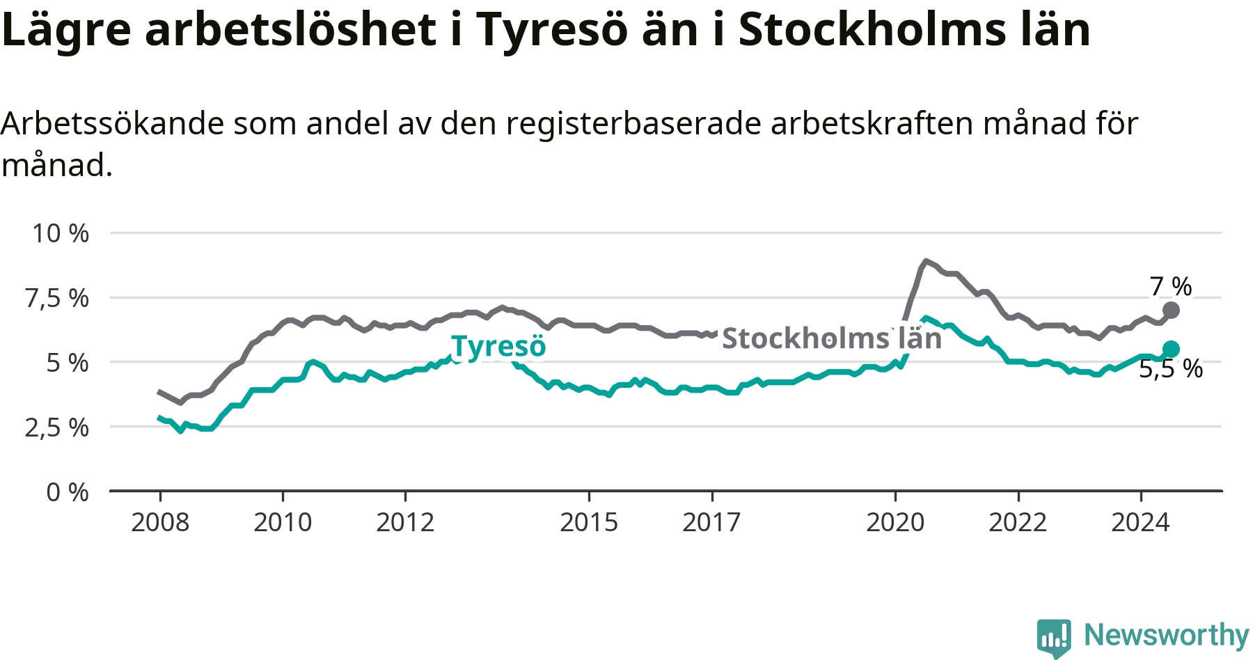 Även om arbetslösheten i Tyresö alltså ökar, så ligger den fortfarande under snittet i hela Stockholms län (5,5 procent i kommunen, jämfört med 7,0 procent i hela länet). Ekerö har den lägsta arbetslösheten i länet (3,5 procent), medan Södertälje har den högsta (11,0 procent). För att Tyresö skulle komma ner i samma arbetslöshetsnivå som Ekerö skulle 500 personer behöva sysselsättas.