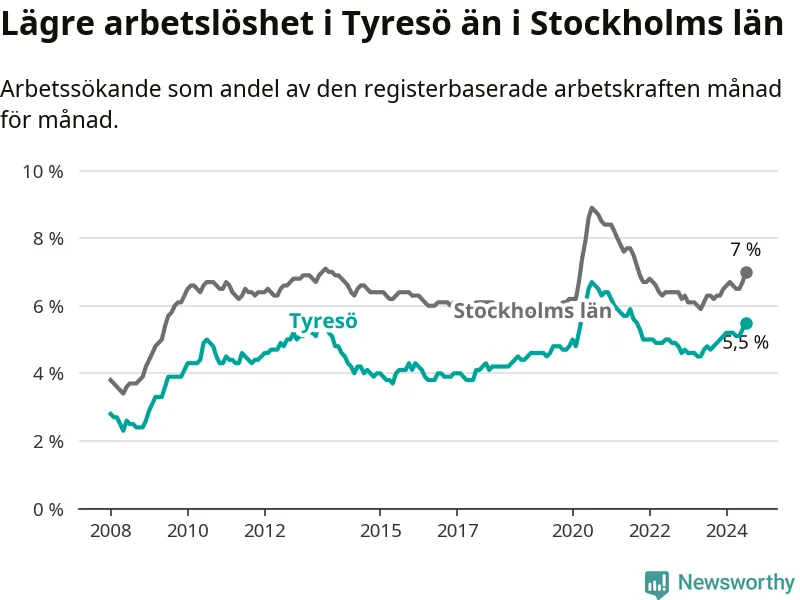 Under juli månad rapporterade Tyresö kommun en total arbetslöshet på 5,5 procent. Det är en ökning jämfört med samma tidpunkt i fjol (+0,7 procentenheter). Även i Stockholms län stiger arbetslösheten .
