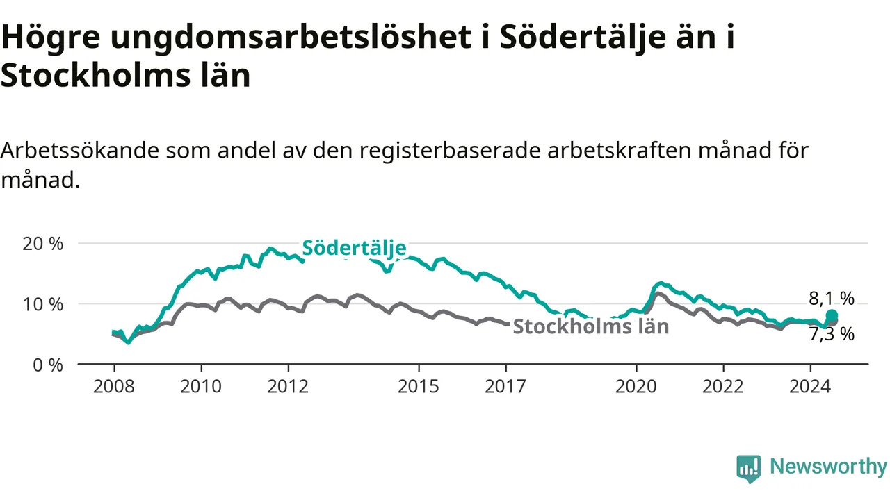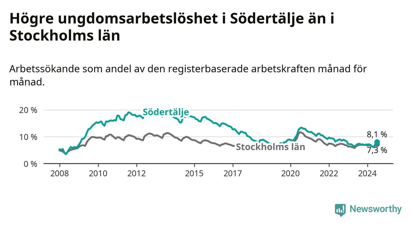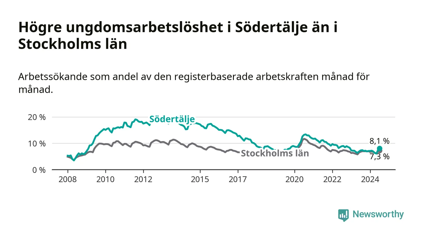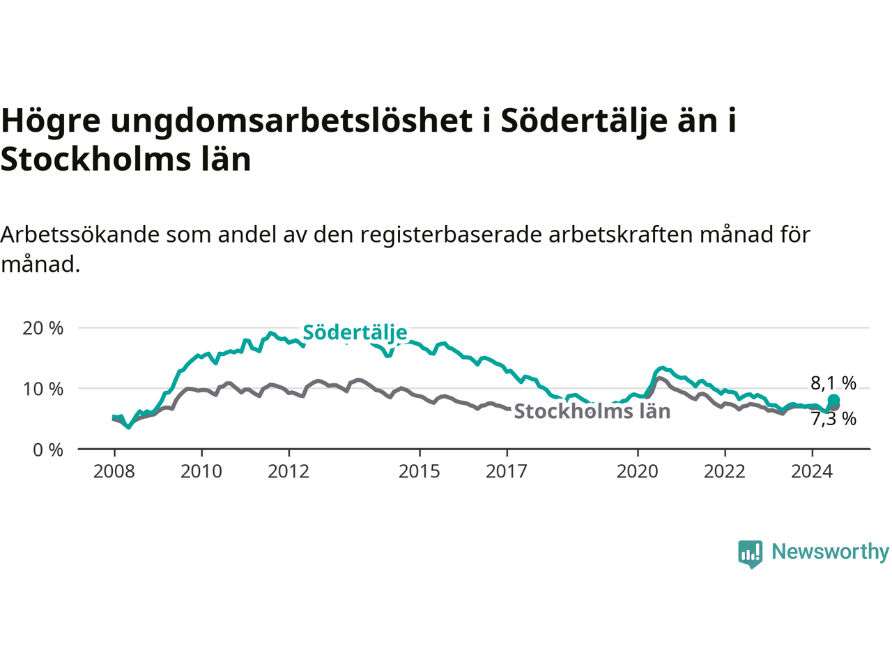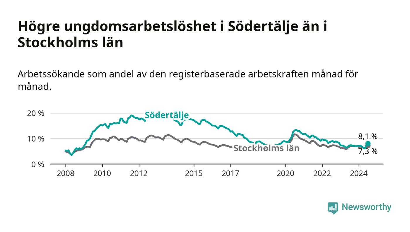 Precis som den totala arbetslösheten ligger ungdomsarbetslösheten i Södertälje högre än i Stockholms län som helhet. Skillnaden mellan kommunen och länet är 0,8 procentenheter.