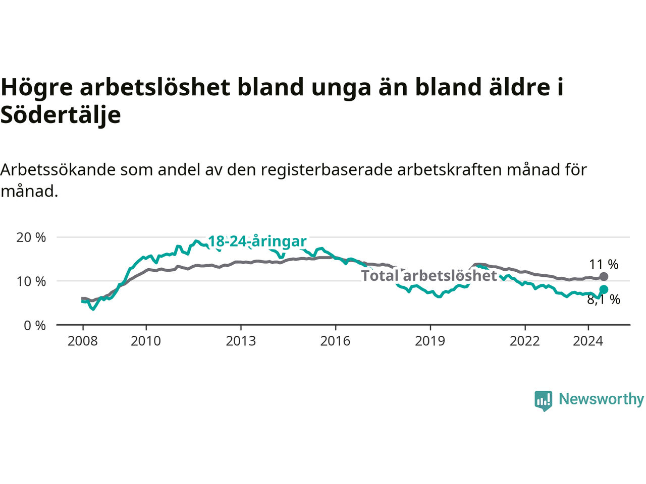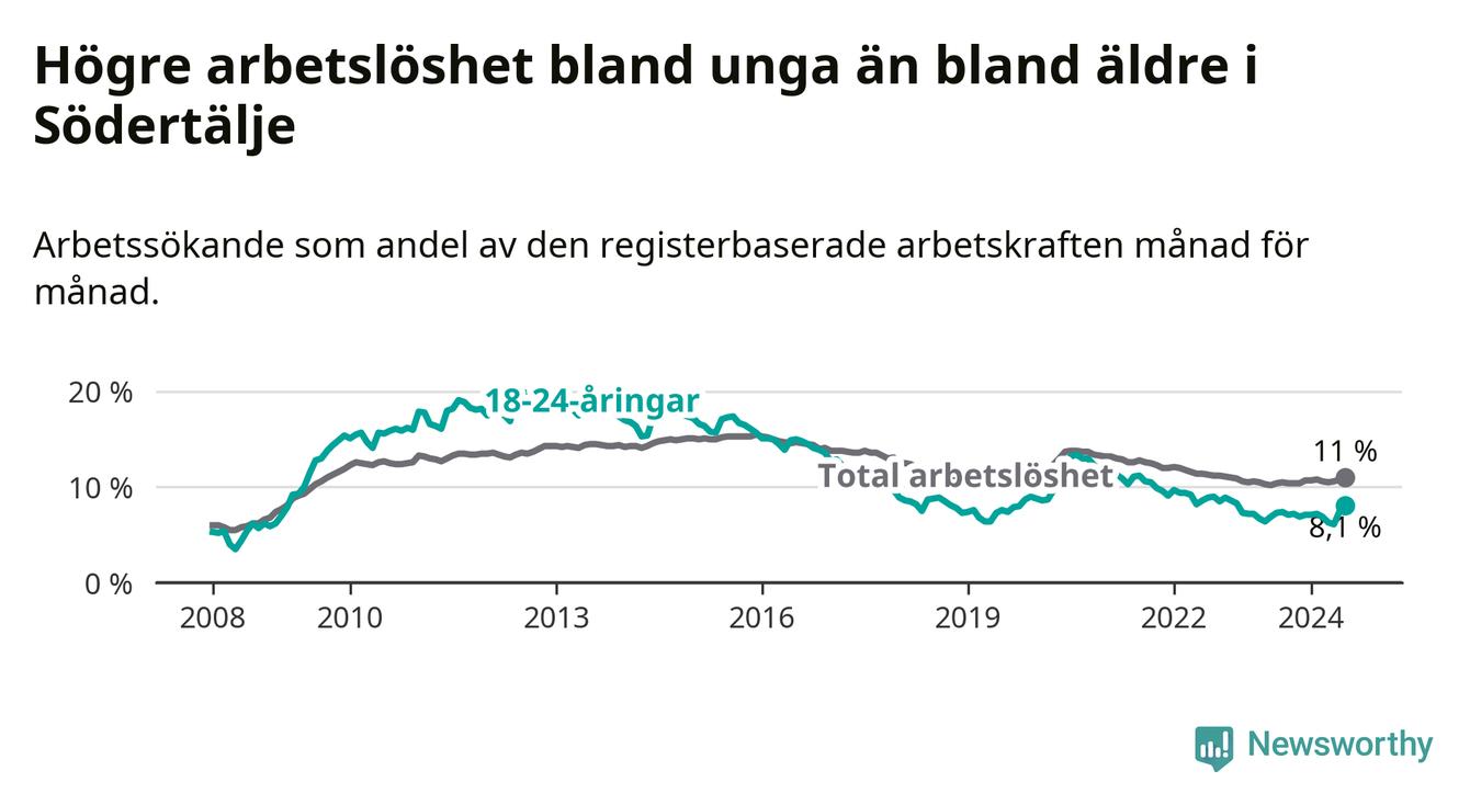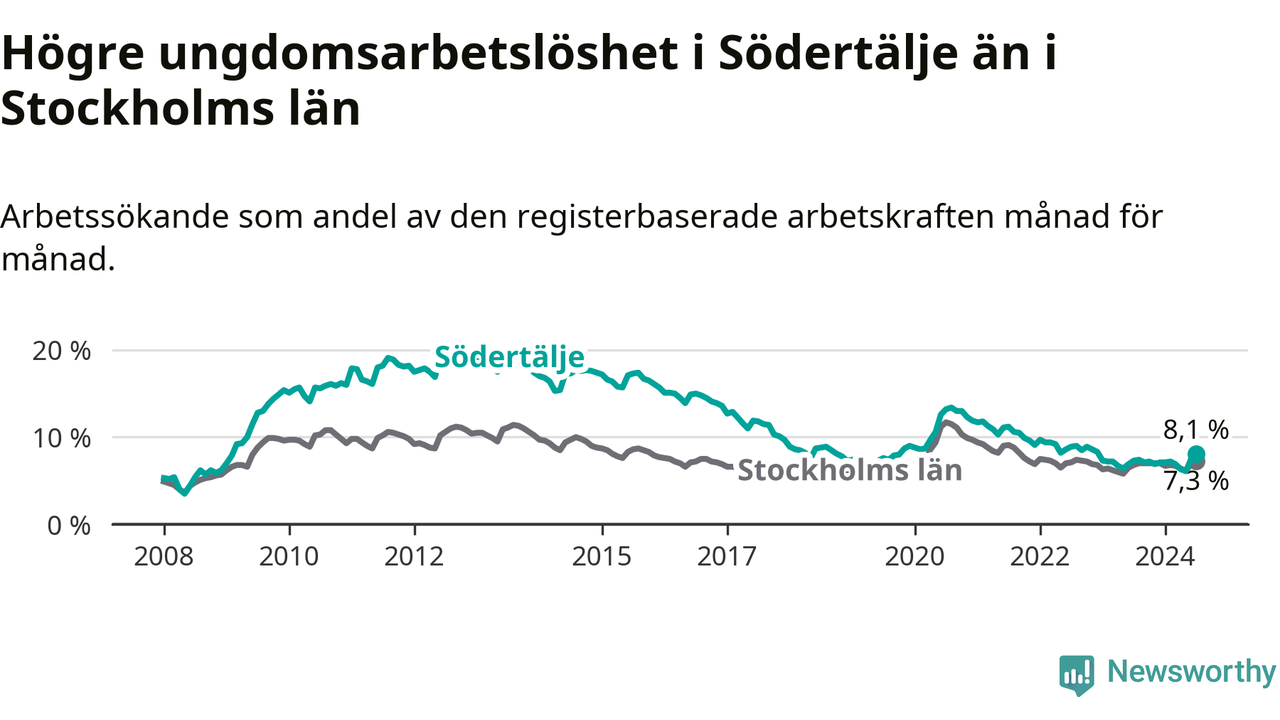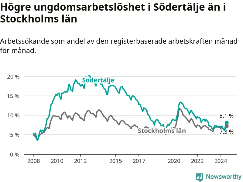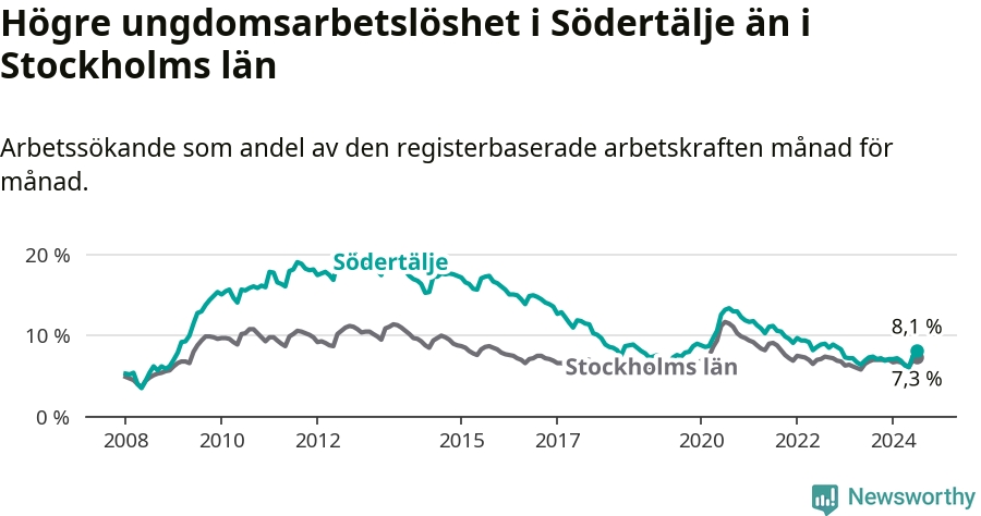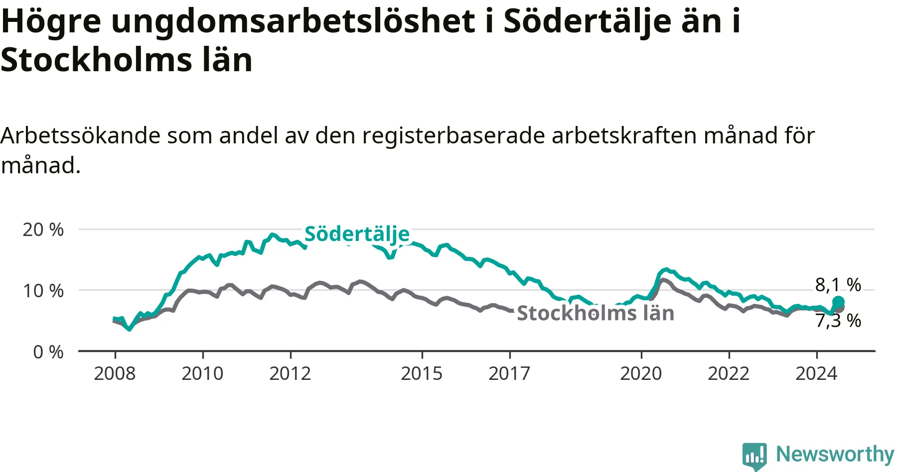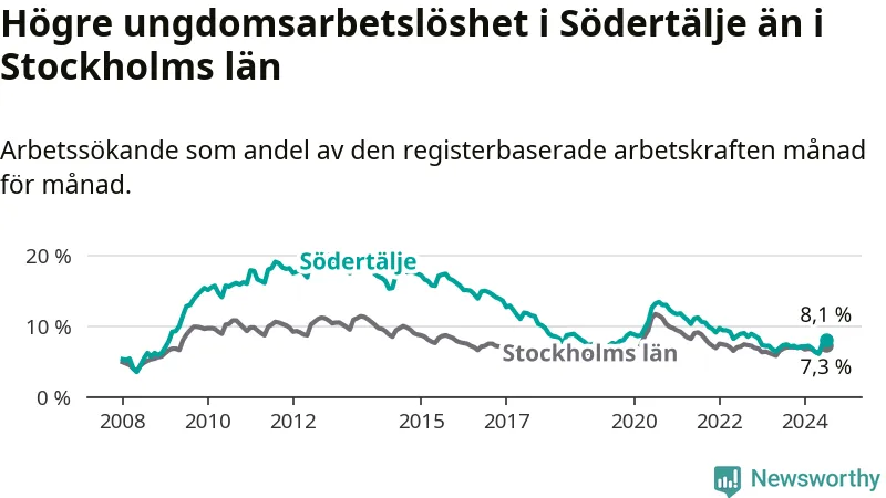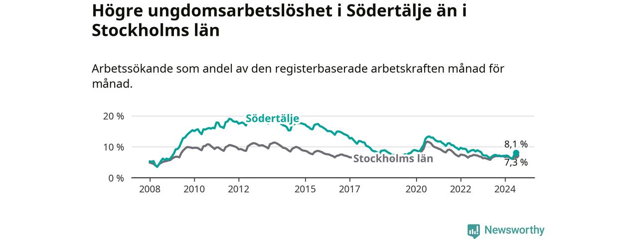 Precis som den totala arbetslösheten ligger ungdomsarbetslösheten i Södertälje högre än i Stockholms län som helhet. Skillnaden mellan kommunen och länet är 0,8 procentenheter.