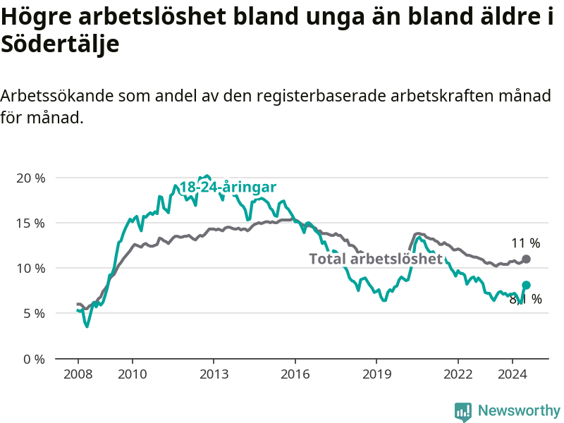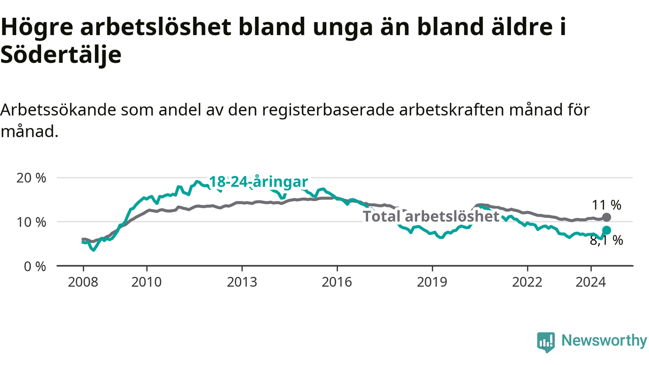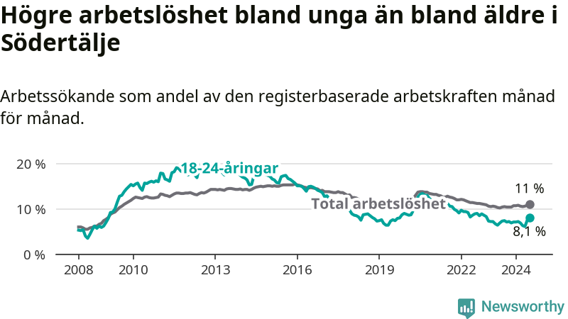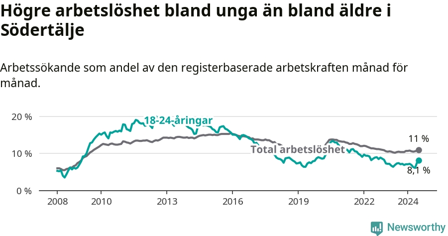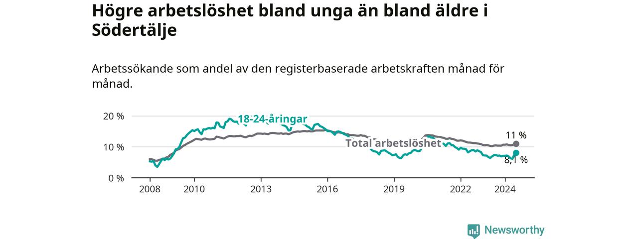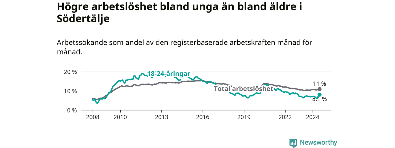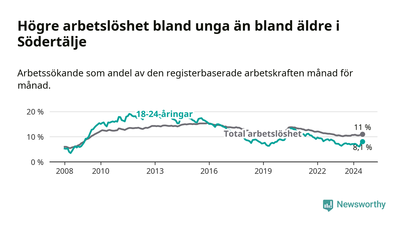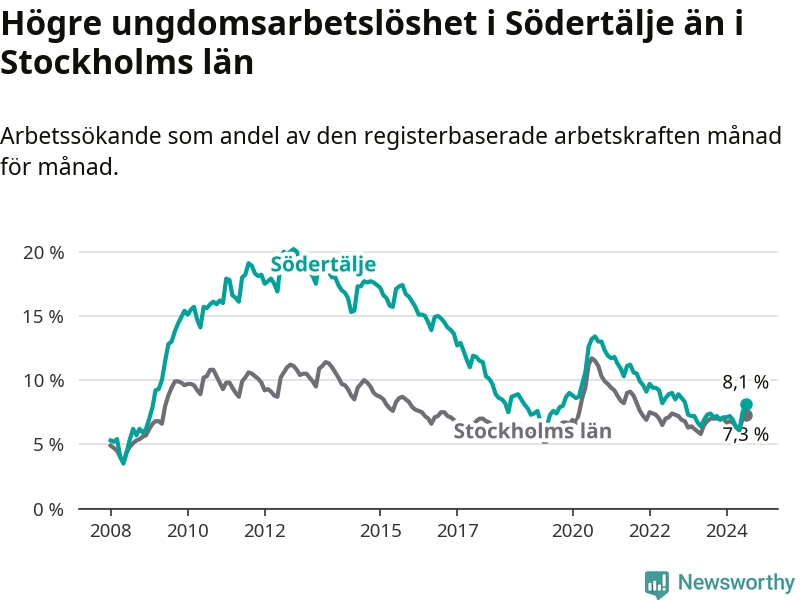 Precis som den totala arbetslösheten ligger ungdomsarbetslösheten i Södertälje högre än i Stockholms län som helhet. Skillnaden mellan kommunen och länet är 0,8 procentenheter.