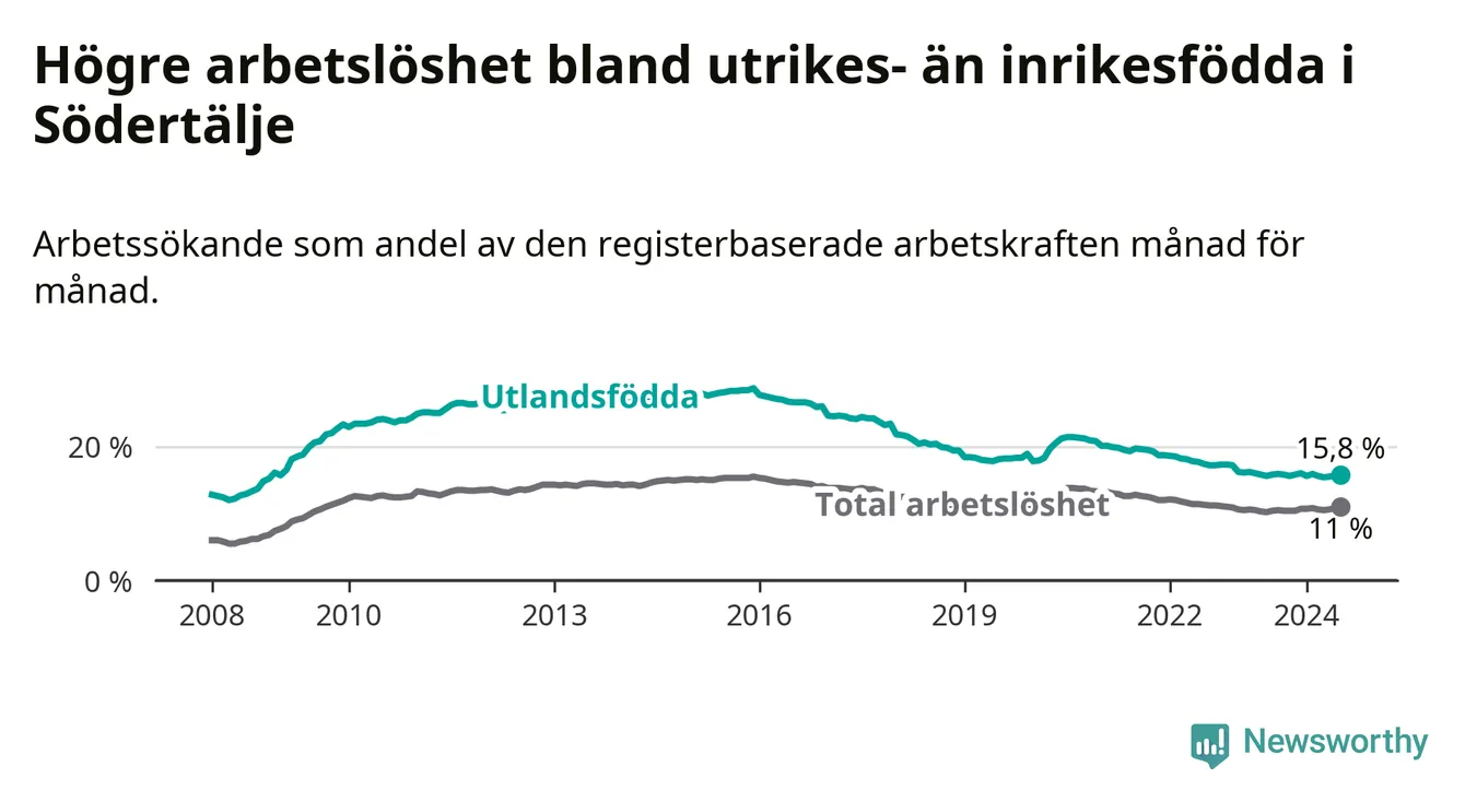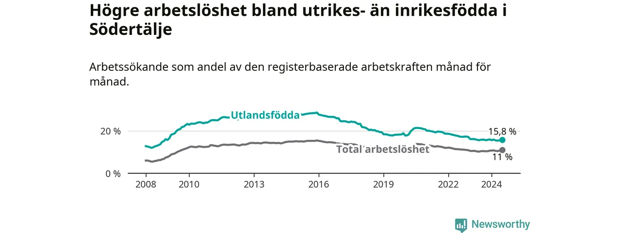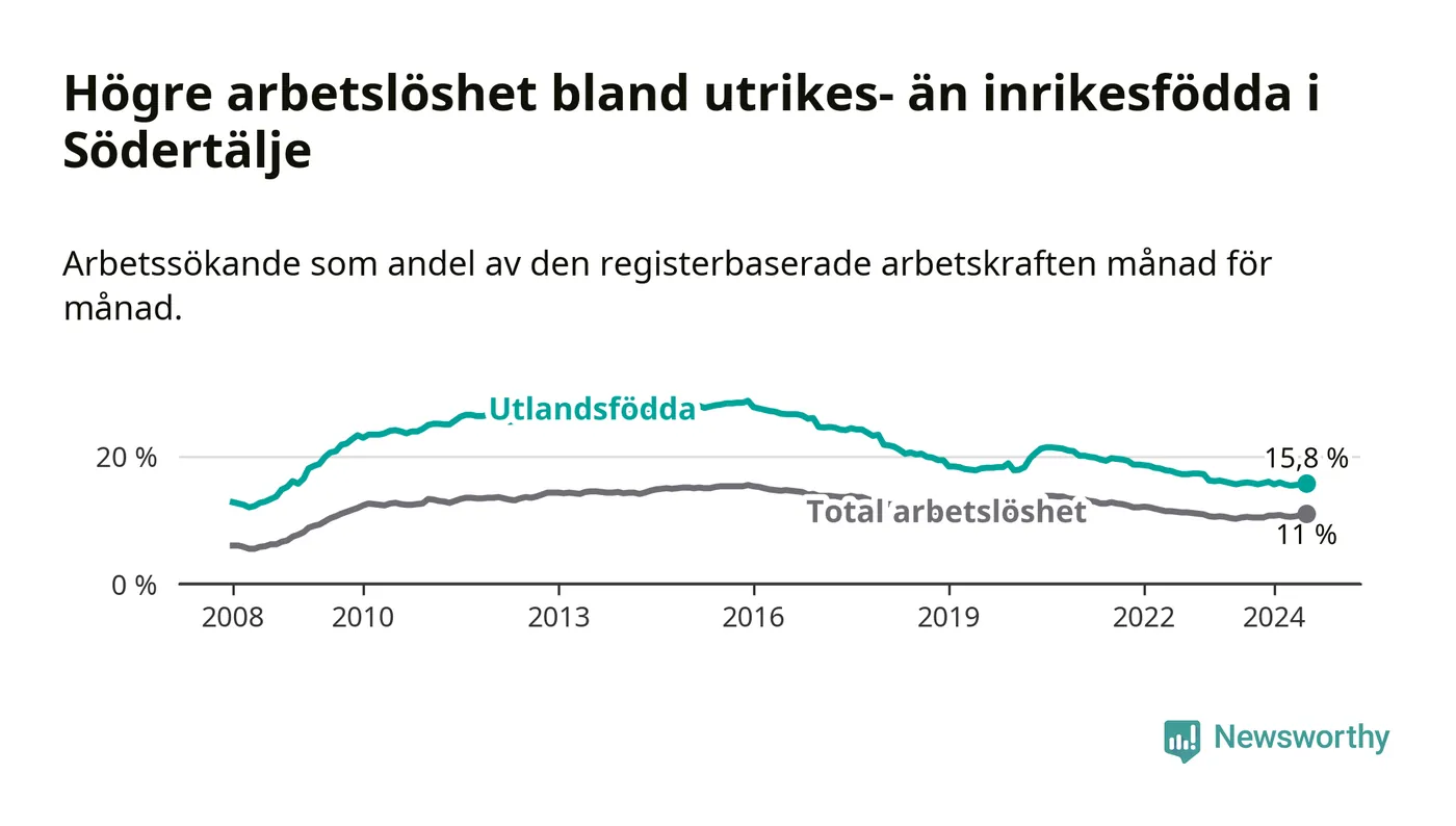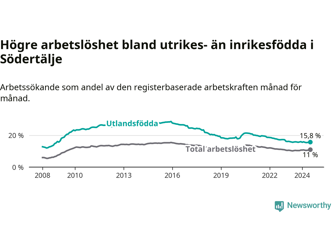 Skillnaden i arbetslöshet mellan utrikesfödda och hela befolkningen är 4,8 procentenheter i Södertälje. Det är en mindre skillnad än för ett år sedan (−0,6 procentenheter).