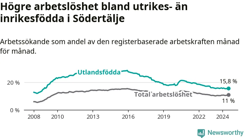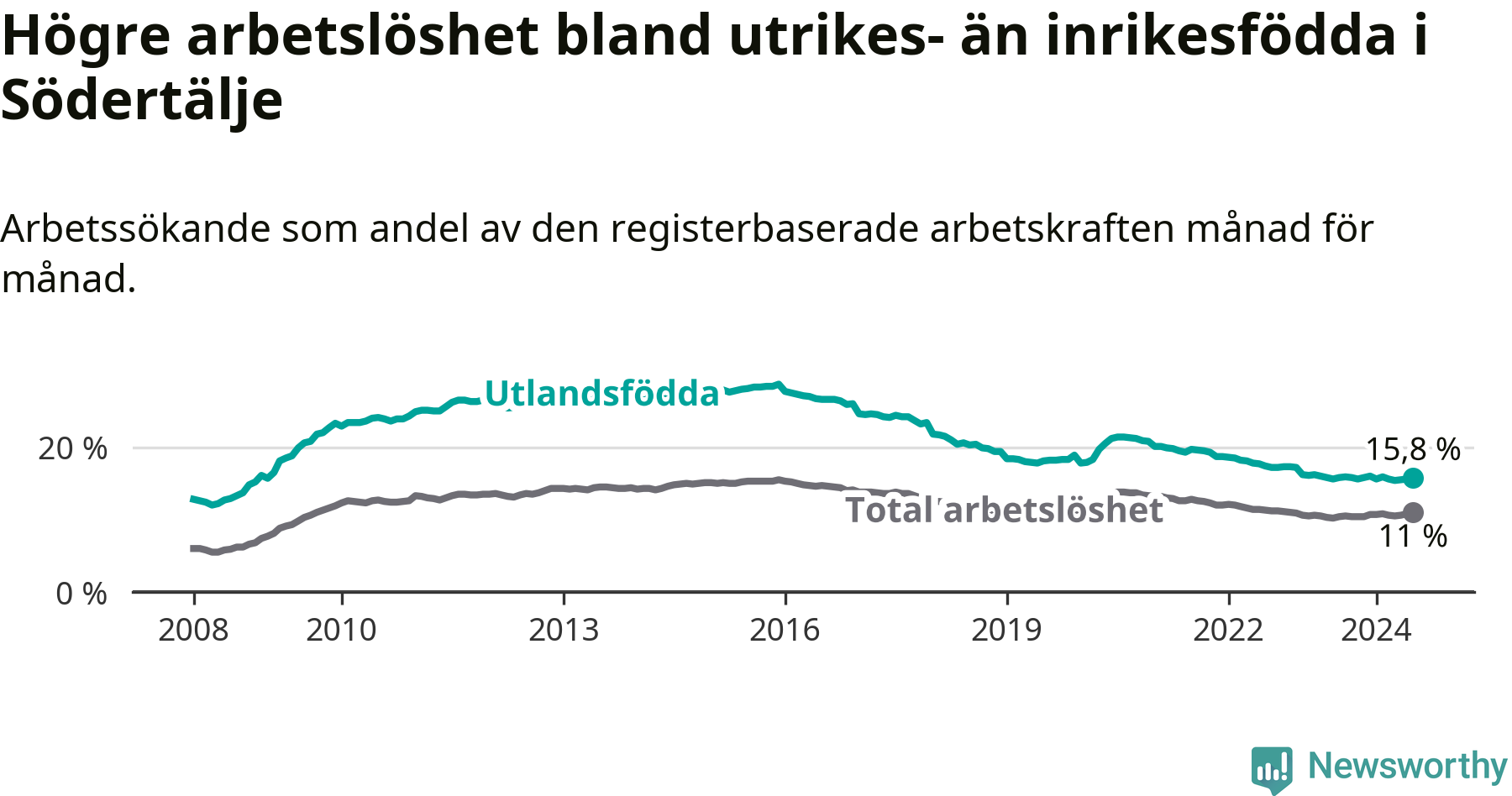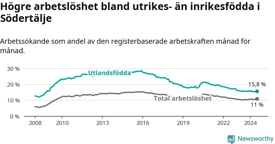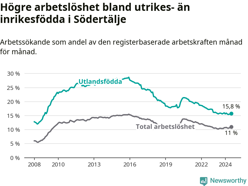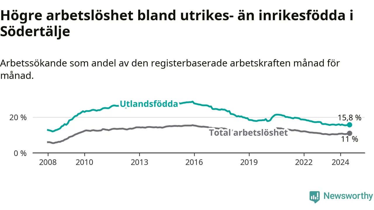 Skillnaden i arbetslöshet mellan utrikesfödda och hela befolkningen är 4,8 procentenheter i Södertälje. Det är en mindre skillnad än för ett år sedan (−0,6 procentenheter).