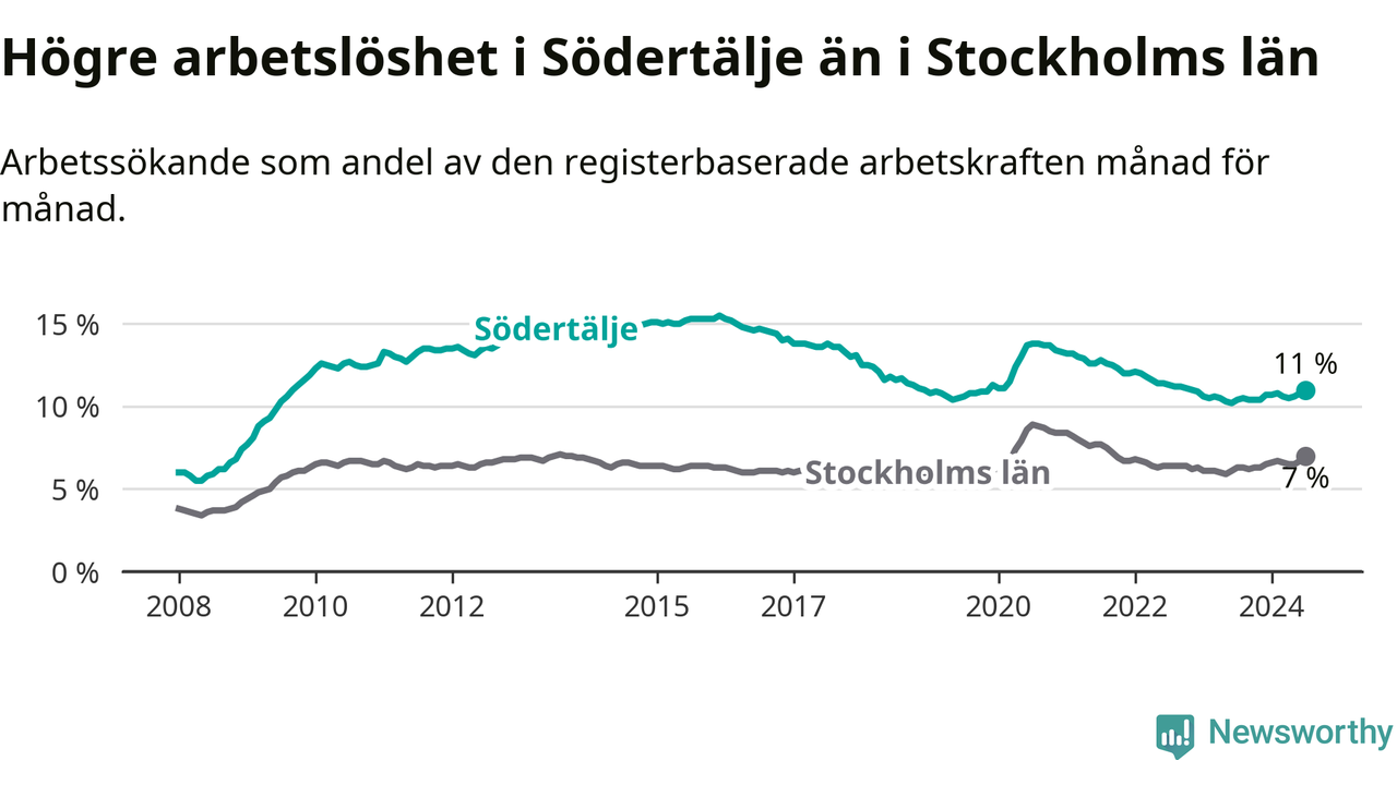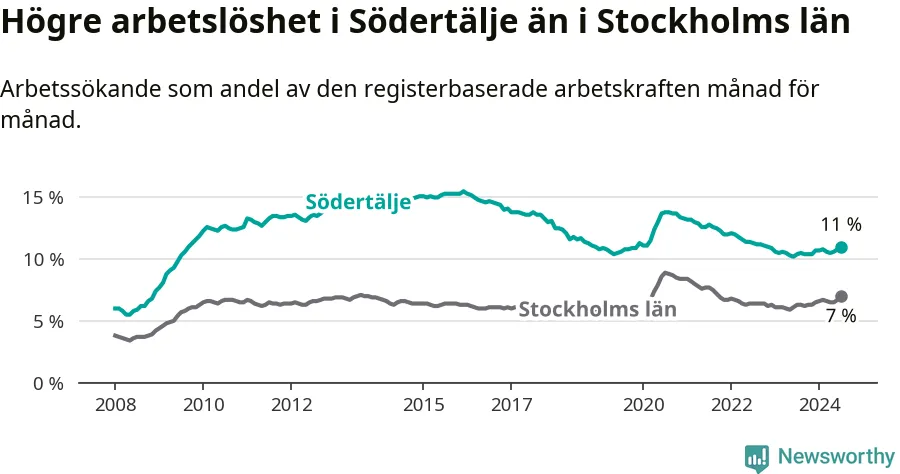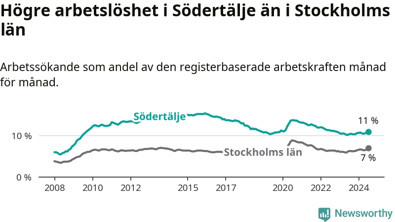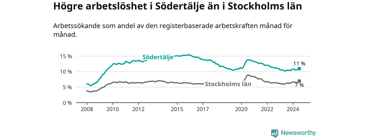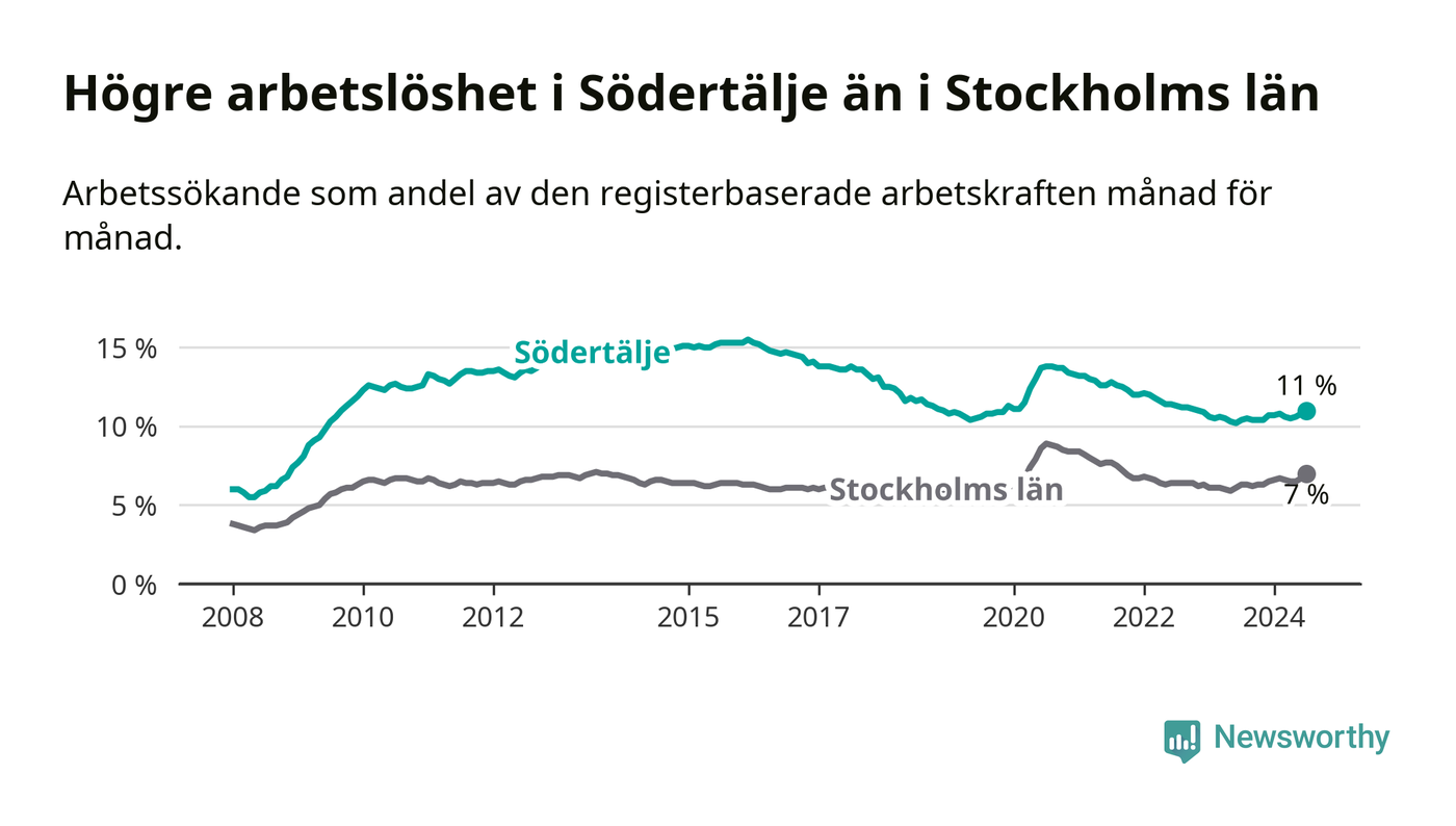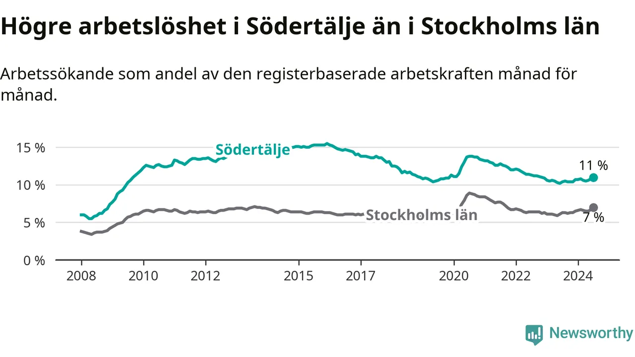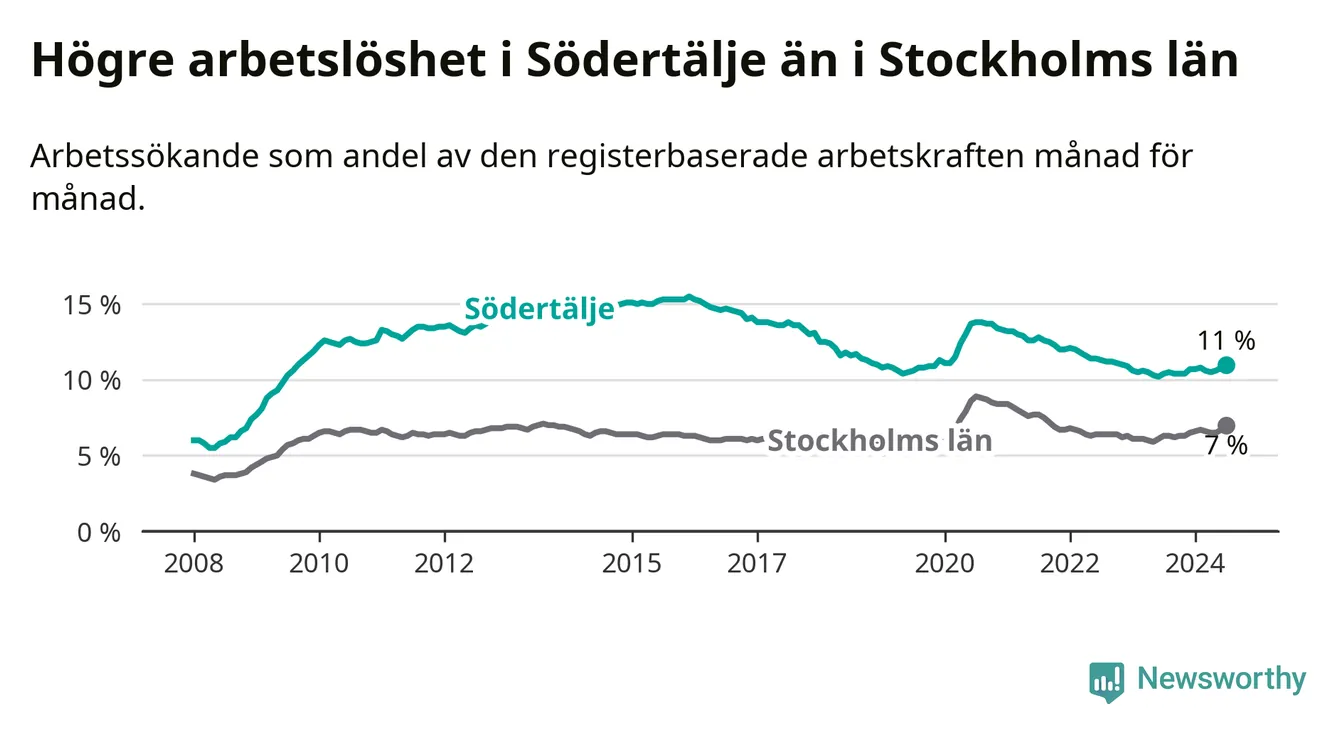 Södertälje hade redan tidigare högre arbetslöshet än snittet i hela Stockholms län och nu växer klyftan (11,0 procent i kommunen, jämfört med 7,0 procent i hela länet). Södertälje har därmed även den högsta arbetslöshetsnivån i länet. Ekerö har den lägsta (3,5 procent). För att Södertälje skulle komma ner i samma arbetslöshetsnivå som Ekerö skulle 3 980 personer behöva sysselsättas.